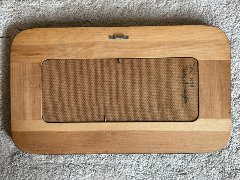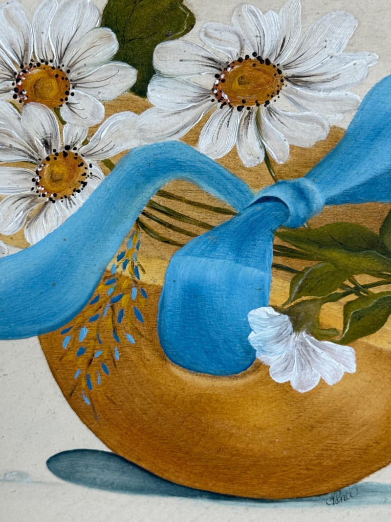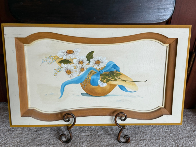 (3) Original Paintings on Wood By Nanci Pears in dark brown wood frame 10.75x18.5” Daisies in a hat 22x12.5” Mushrooms on wood 8.25x14”