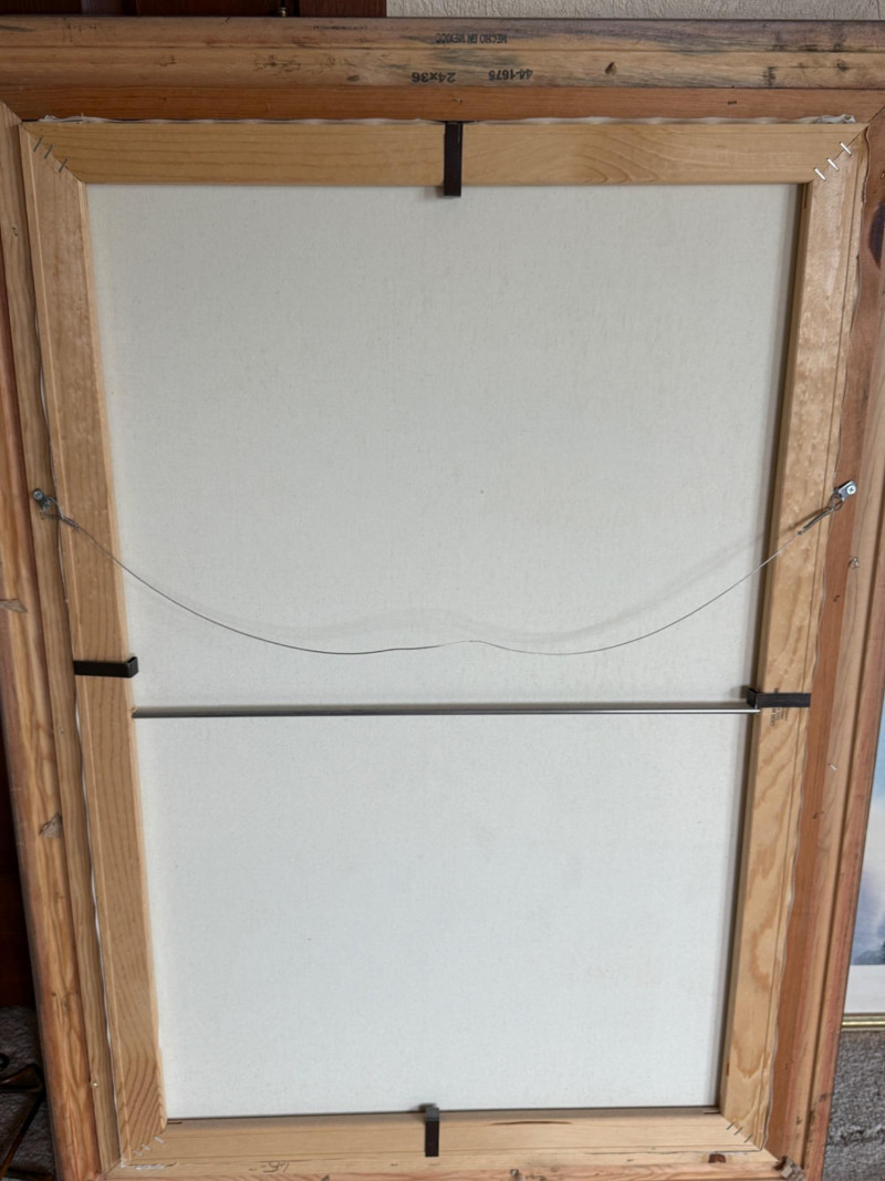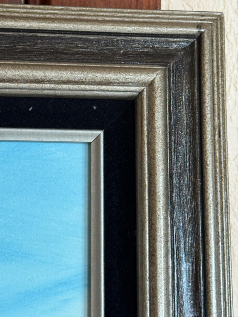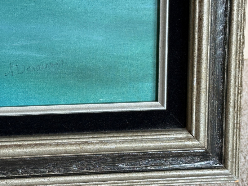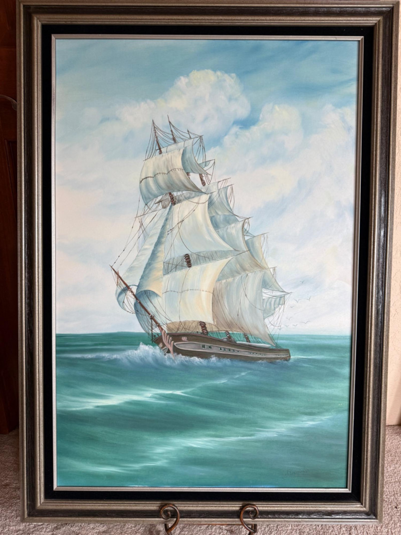 Sailing Ship Original Acrylic Painting by N. Dunnington This is a beautiful large painting. Check your measurements. 20x41.4” Black and gray wood frame with black velvet and silver tone accents.