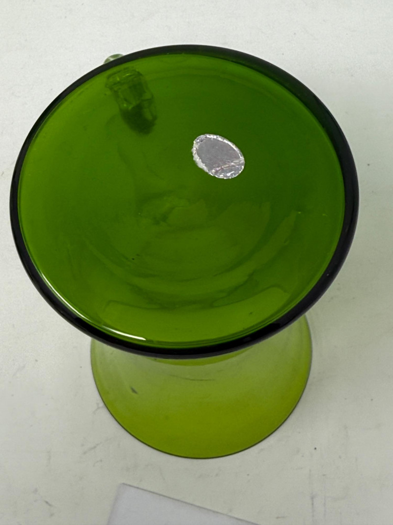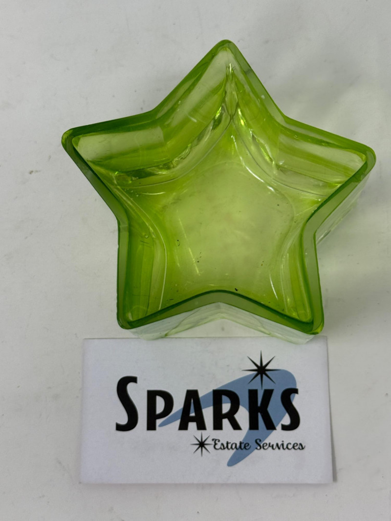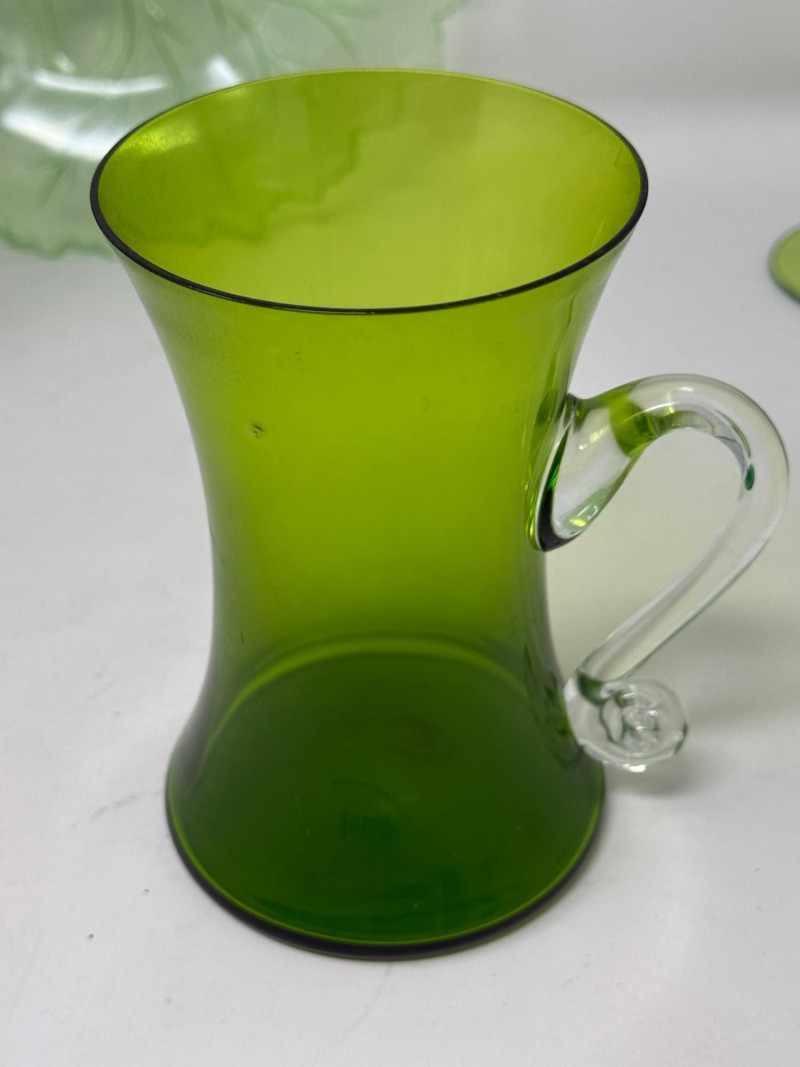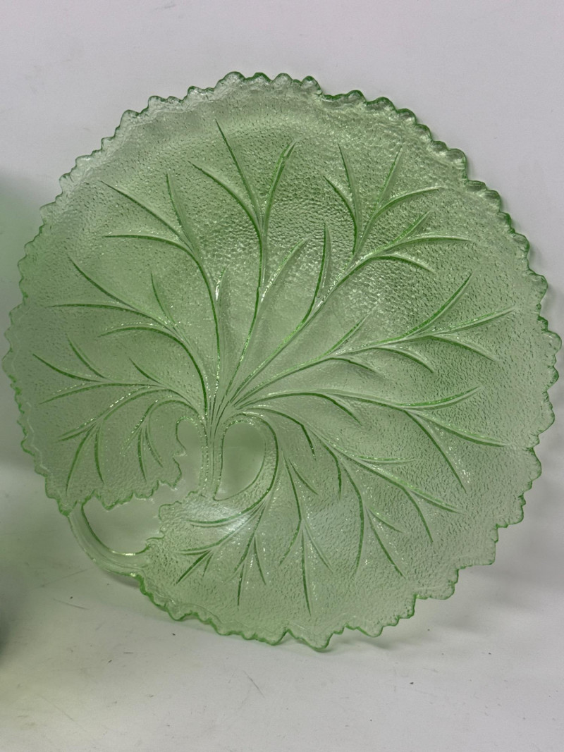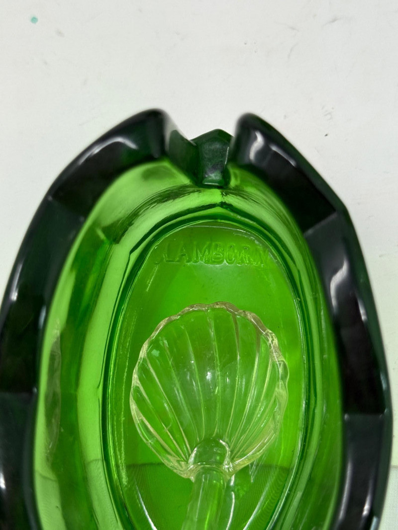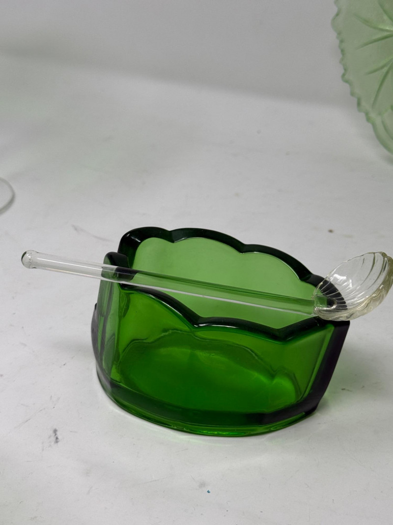 Fenton Clamborn Green Glass Mule Shoe Spoon Rest Holder and clam shaped glass spoon. Green Glass - No Two Pieces The Same! 3 Uranium / Vaseline Glass. See pics