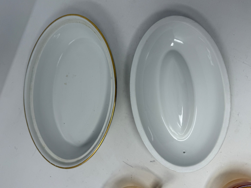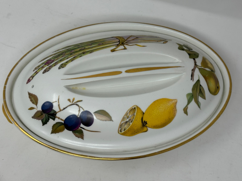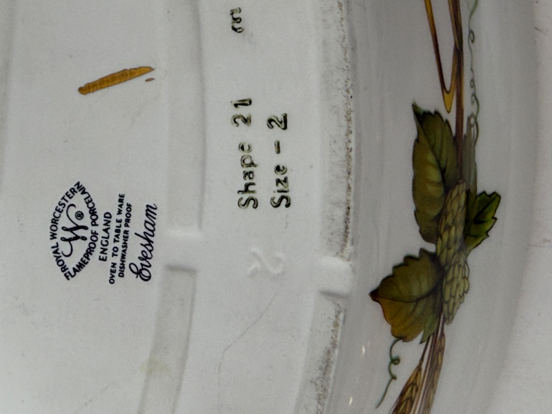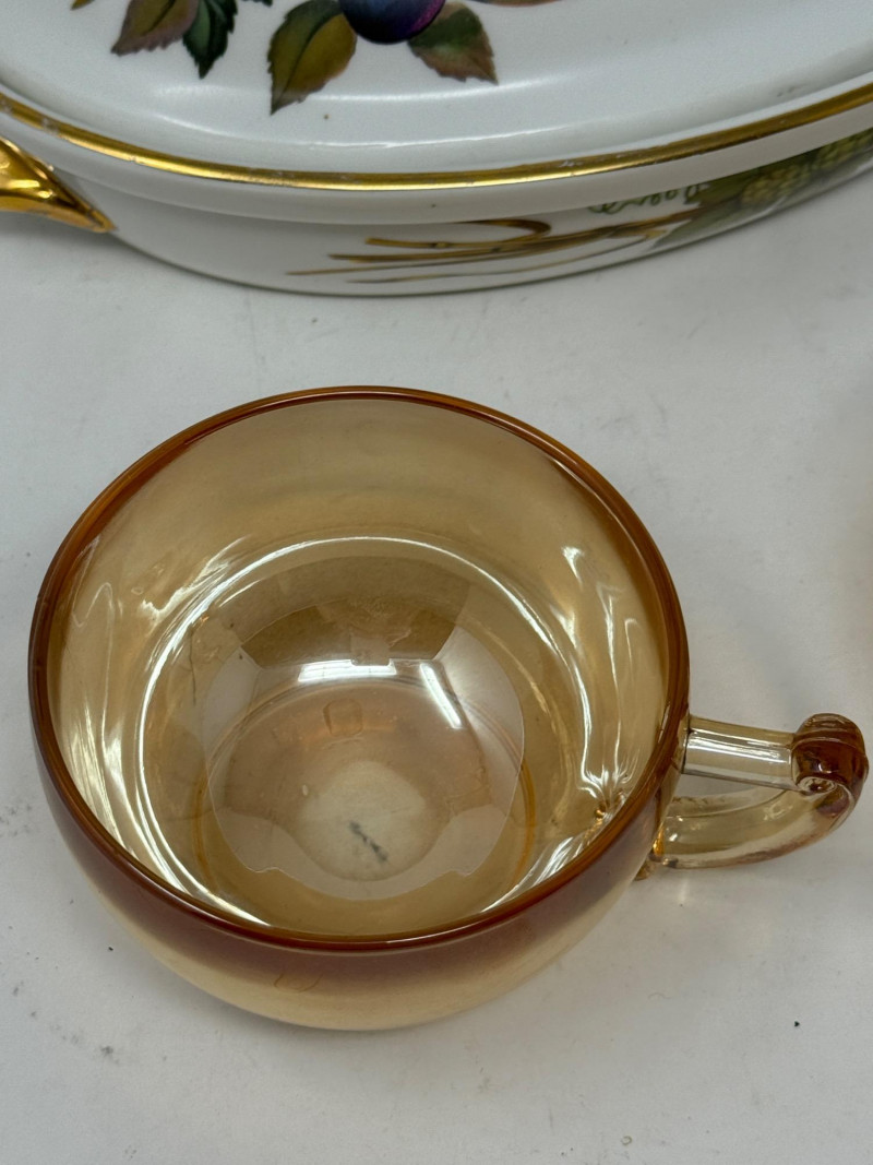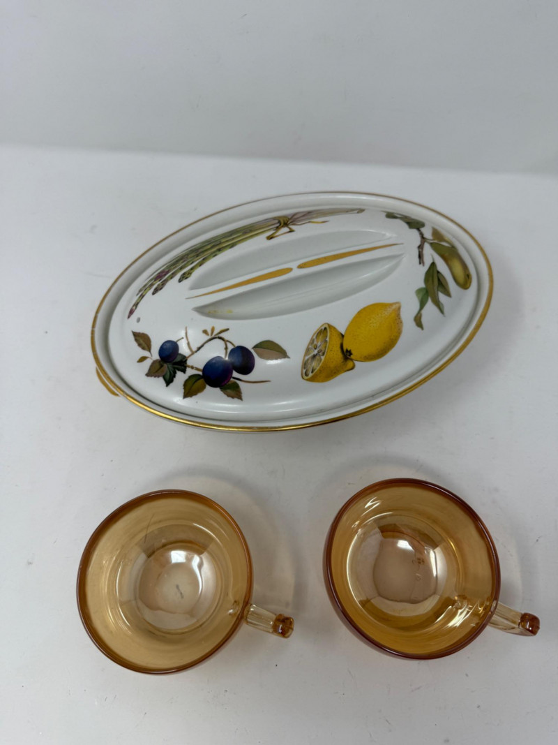 Royal Worcester Evesham Gold Porcelain & Lusterware Cups 9” oval lidded entree dish 2 Gold/brown lusterware cups