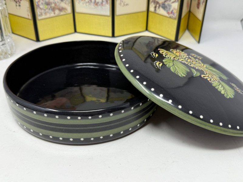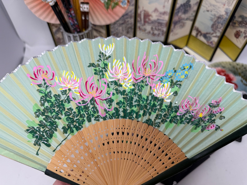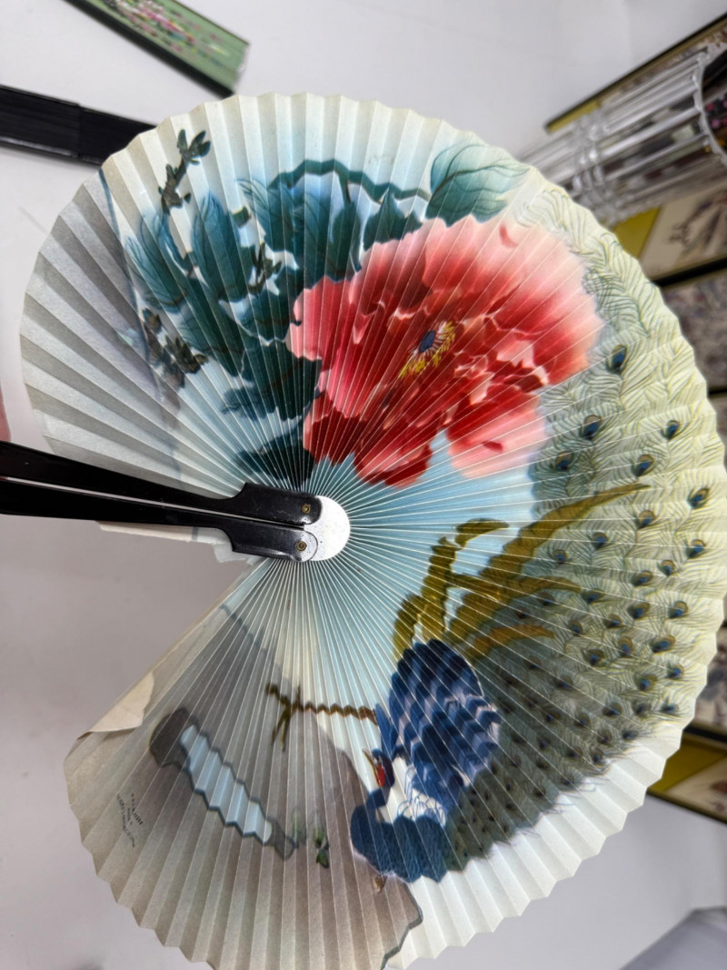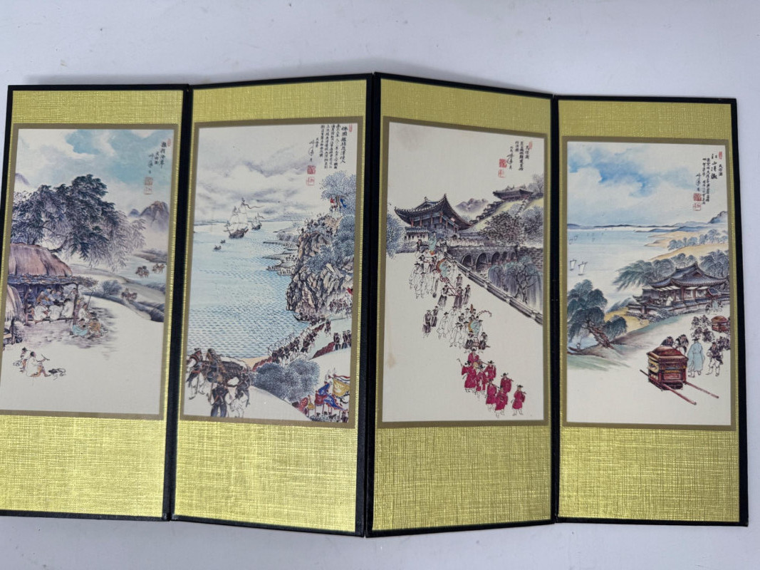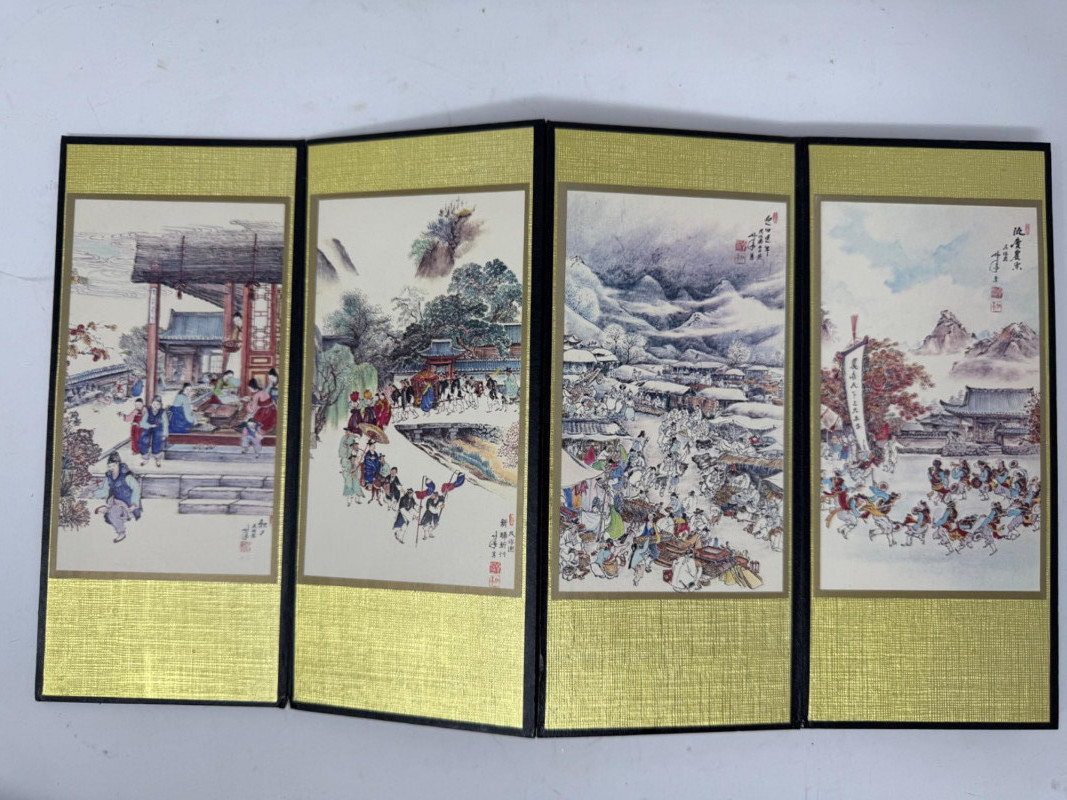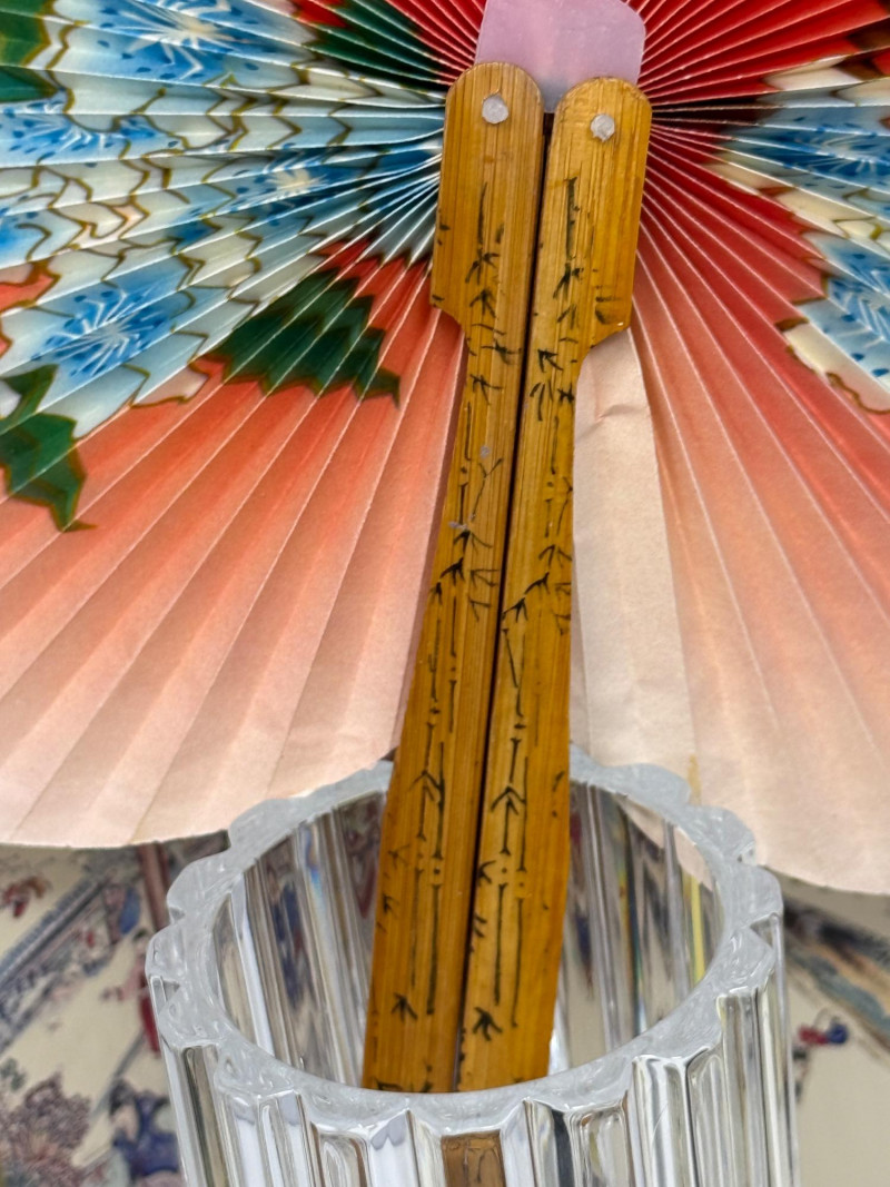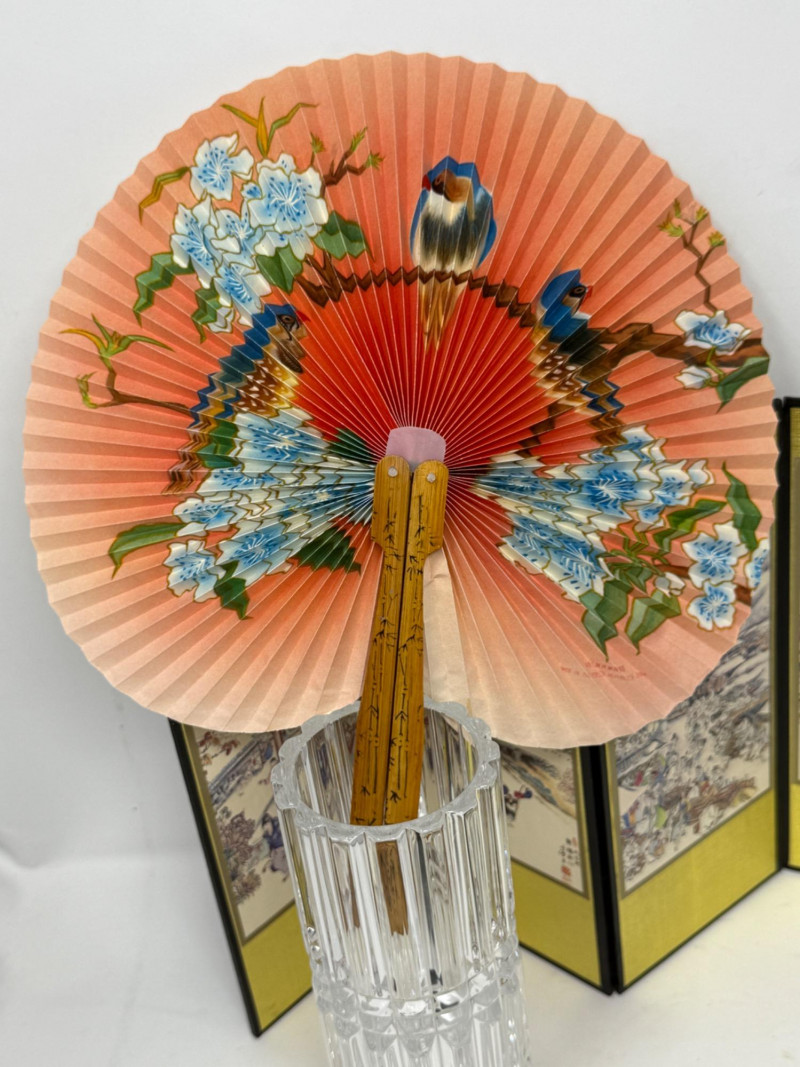 Fans - Chopstick Sets - Folding Storyboard & Ceramic Box 8 panel folding story board 3 Chopstick sets in a crystal vase 2.5x6.5” 4 fans 8.5” ceramic round lidded box hand-painted by Judy.