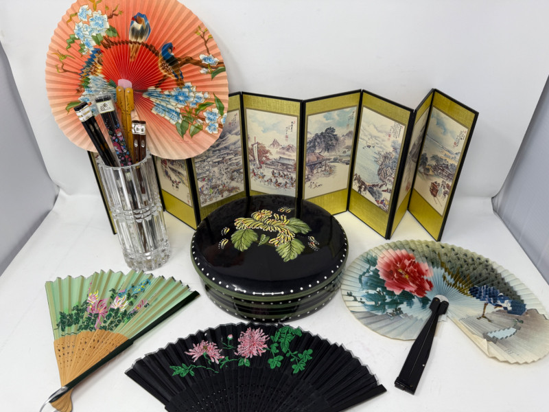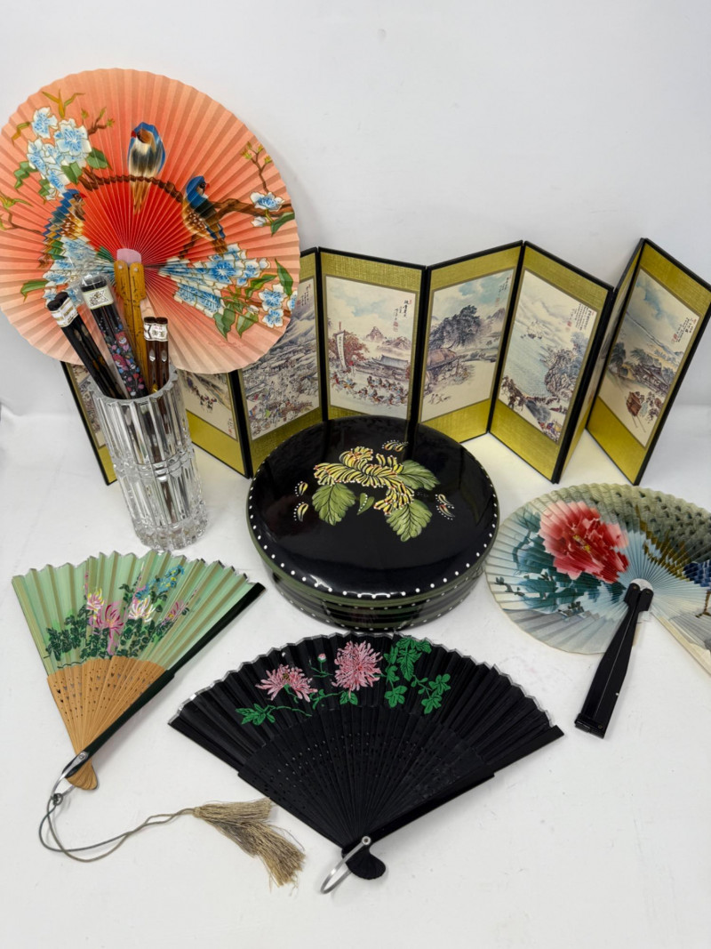 Lot # 227 - Fans - Chopstick Sets - Folding Storyboard & Ceramic Box
