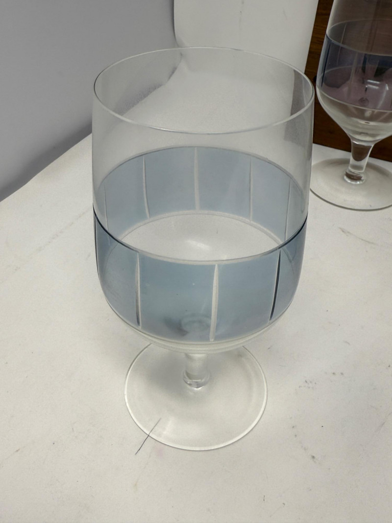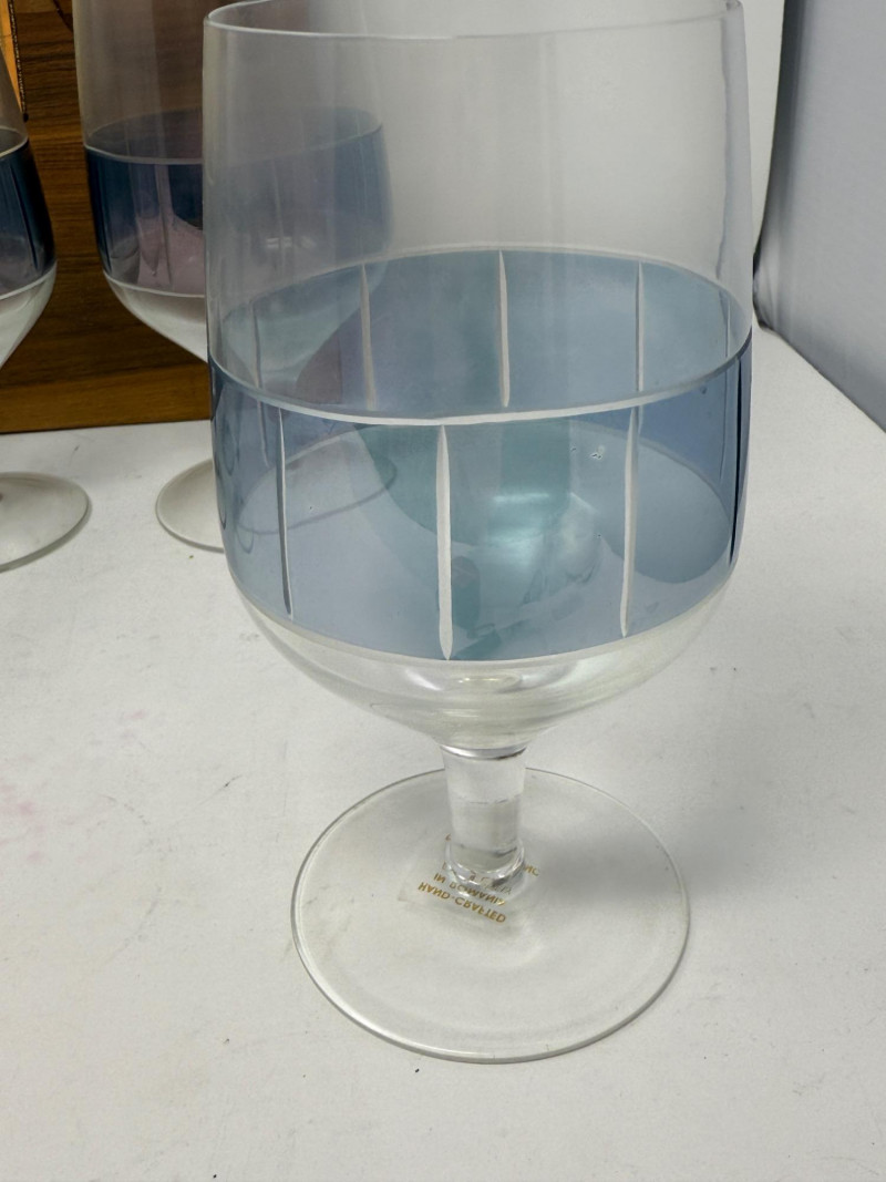 7 Goblets with blue band and cut glass stripes. Hand crafted in Romania 6.5”