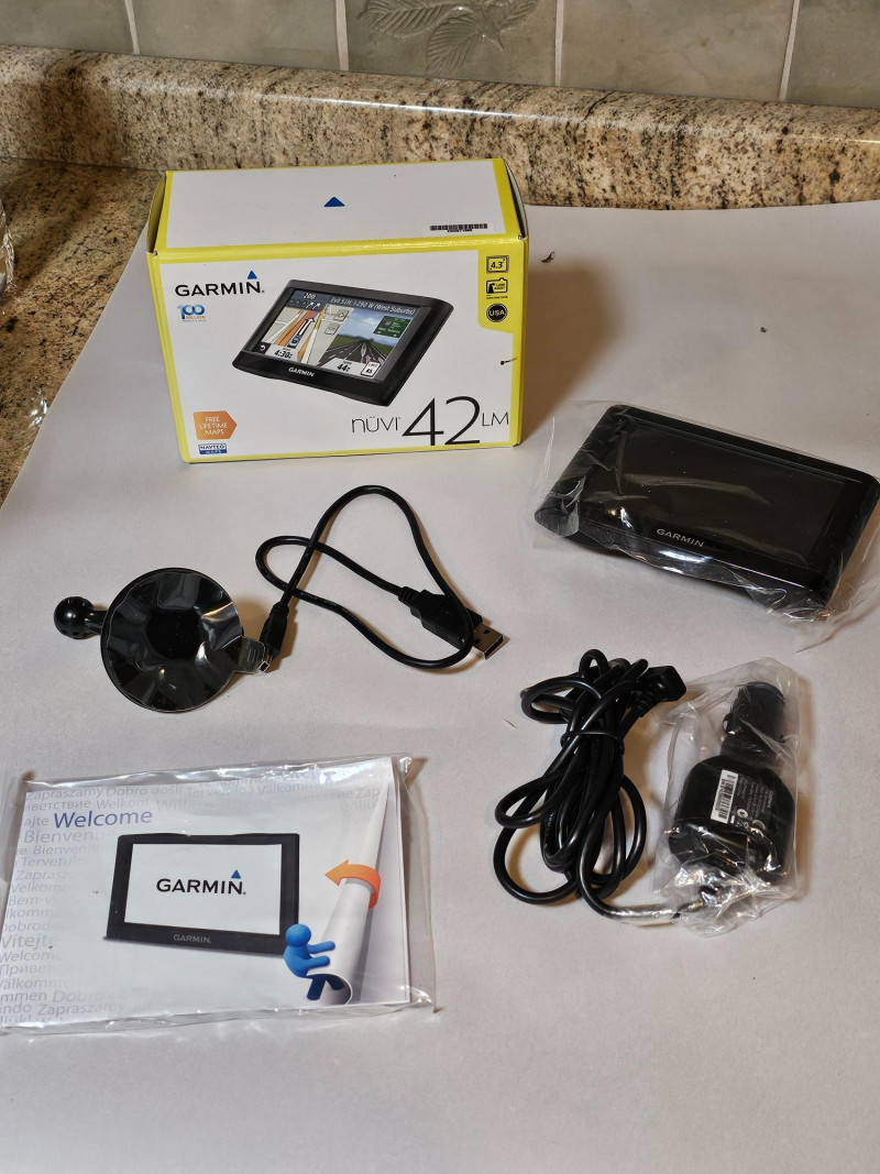 Brand New In Box Garmin Nuvi 42LM GPS Unit Garmin Model # 4.3" touchscreen Free lifetime maps microSD card slot Includes GPS unit, USB power cable, 12V power cable, windshield mounts & documentation Tested - Works!