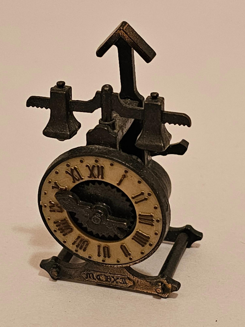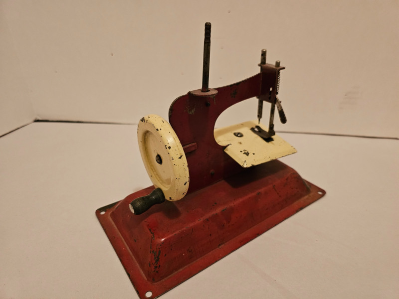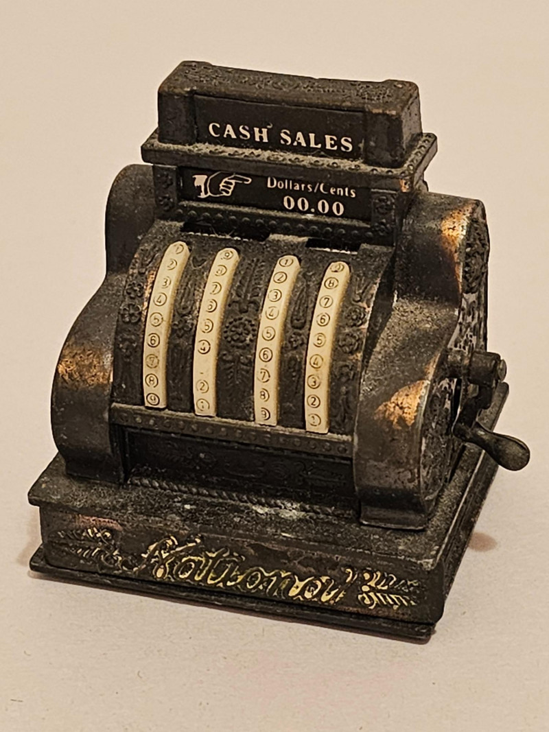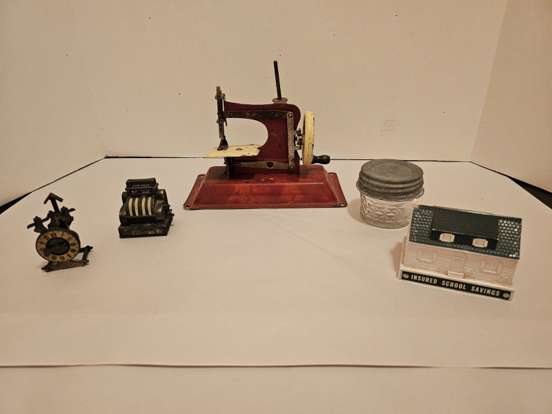 Vintage Miniatures Vintage Gateway Junior Model NP-1 Toy Sewing Machine Likely from the late 1940s or early 1950s Was actually usable for basic sewing tasks even though it was sold as a toy sewing machine 7"T x 8.25"W x 4.5"D Miniature 1:12 scale die-cast metal cash register that functions as a pencil sharpener and/or as a doll-house miniature as it has a working drawer. 2.25"T x 2"W x 1.75"D Vintage Die Cast Metal Winding Clock Pencil Sharpener 3"T x 1.5"W x 1 5"D Vintage First Federal Savings & Loan Association "Insured School Savings" promotional coin bank, designed to resemble a house or school building. Manufactured by Banthrico of Chicago, IL. No key 2.75"T x 3.75"W x 2.25"D Vintage Ball Quilted Crystal Jelly Jar 2.5"T x 3"W