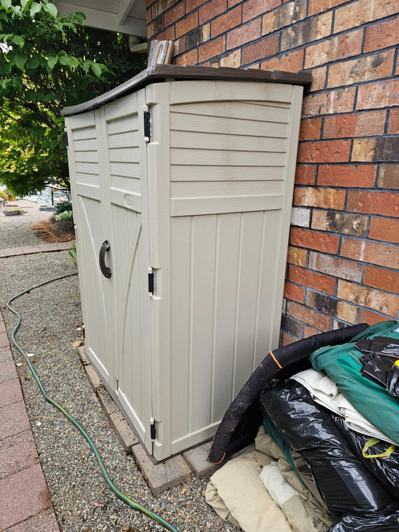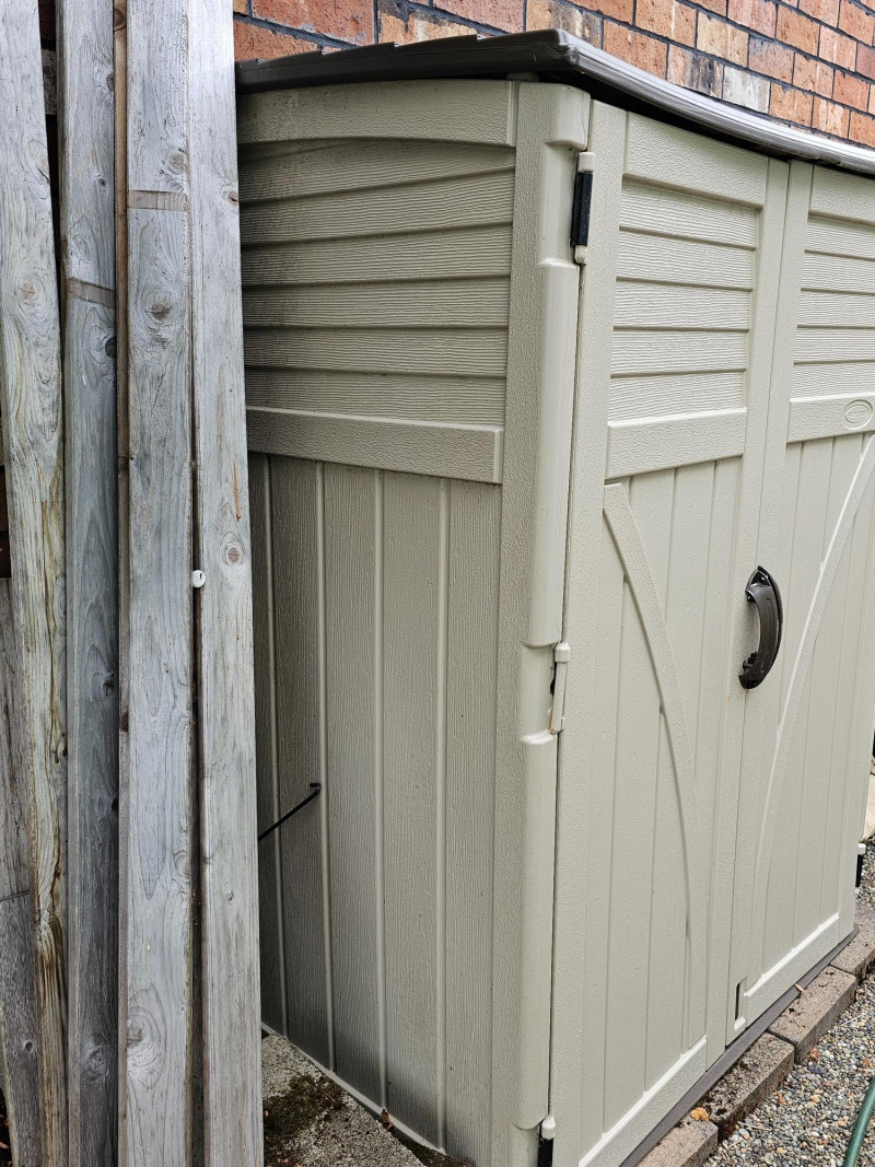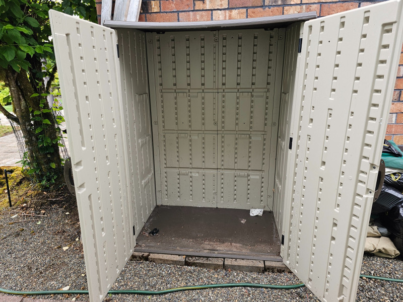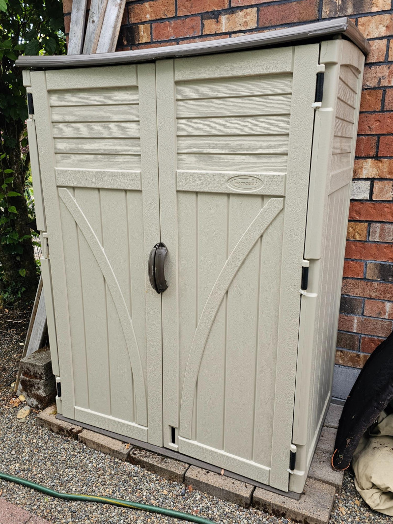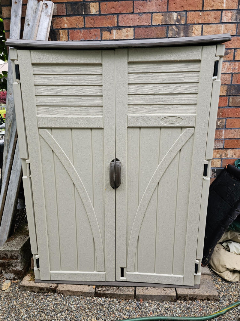 Suncast Vertical Double-Door Shed Resin construction Double-doors and hinged top make access a breeze Lockable doors (with padlock not included) Hinged top has a bow in the middle, otherwise in good used condition 72"T x 52"W x 32"D