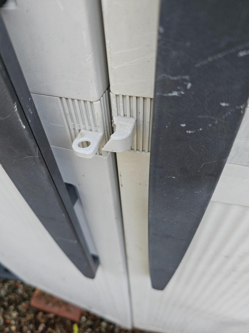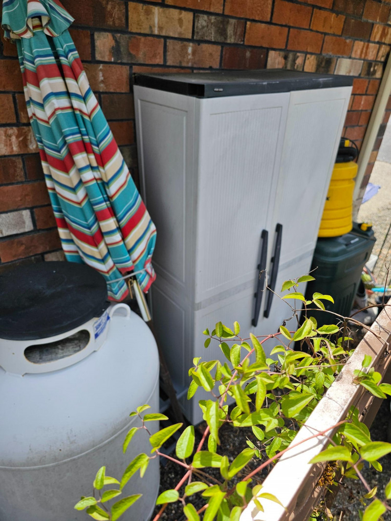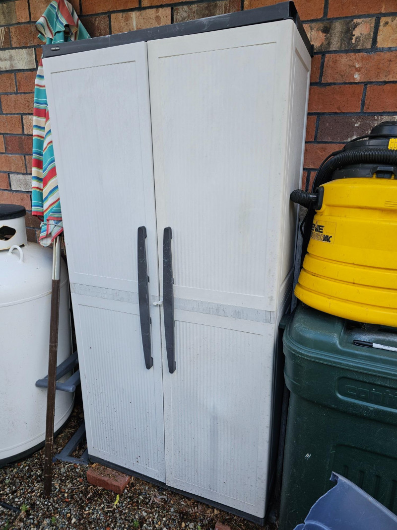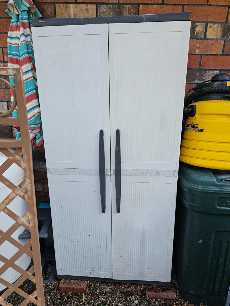 Black & Decker Vertical Double-Door Shed/Cabinet Resin construction Double-doors make access a breeze 5 shelves (4 adjustable) could use cleaning A bit dirty and worn from being outside but otherwise in used condition 71"T x 34.5"W x 18"D