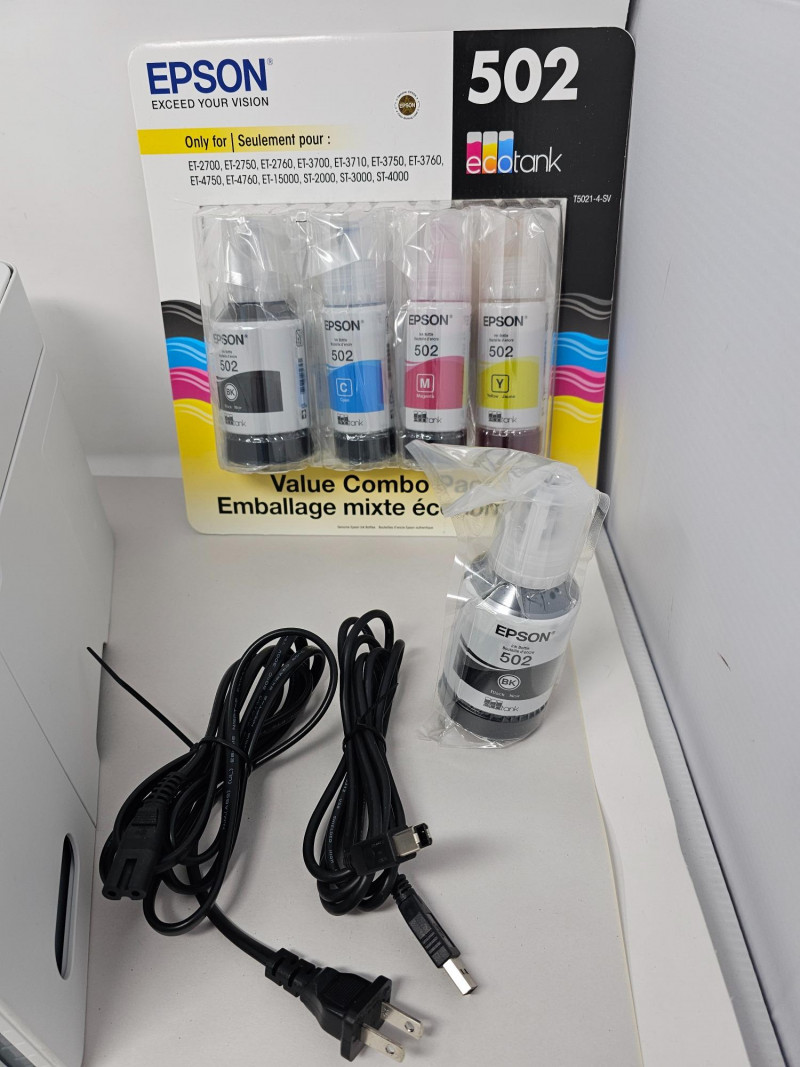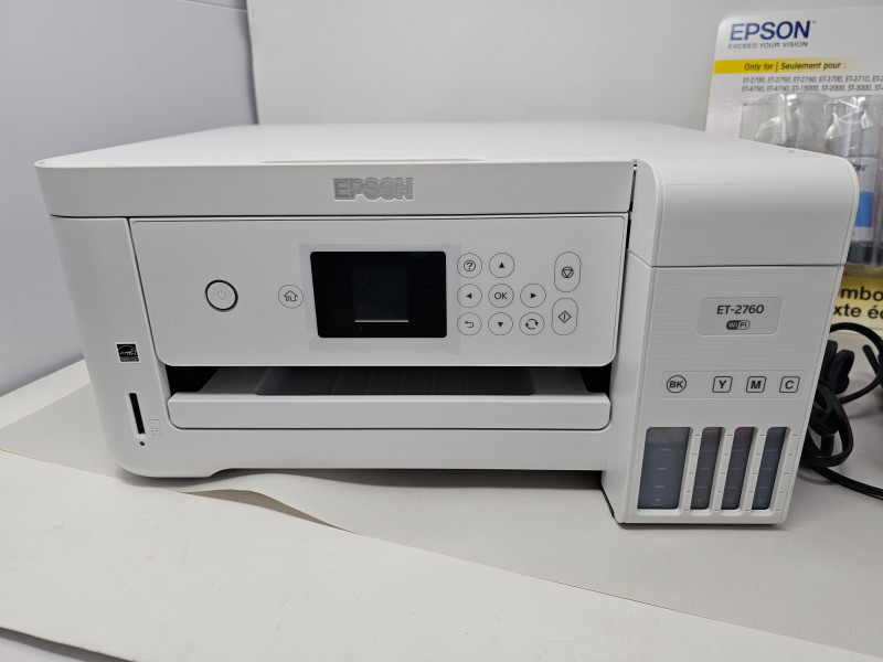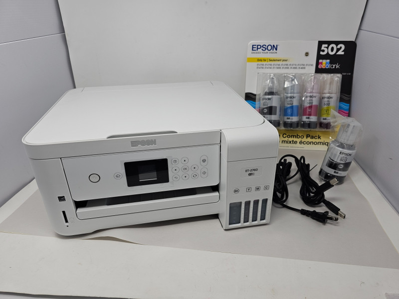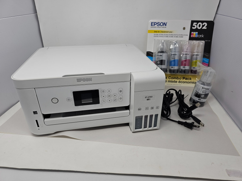Epson ET-2760 Wireless Color All-In-One Printer Cartridge-free EcoTank Print/Scan/Copy Auto-duplex printing High resolution flatbed scanner Includes printer cable, power cable, brand new ink combo pack and extra black ink Tested - Works! Looks nearly new!