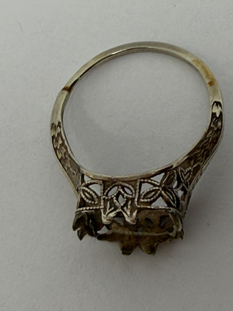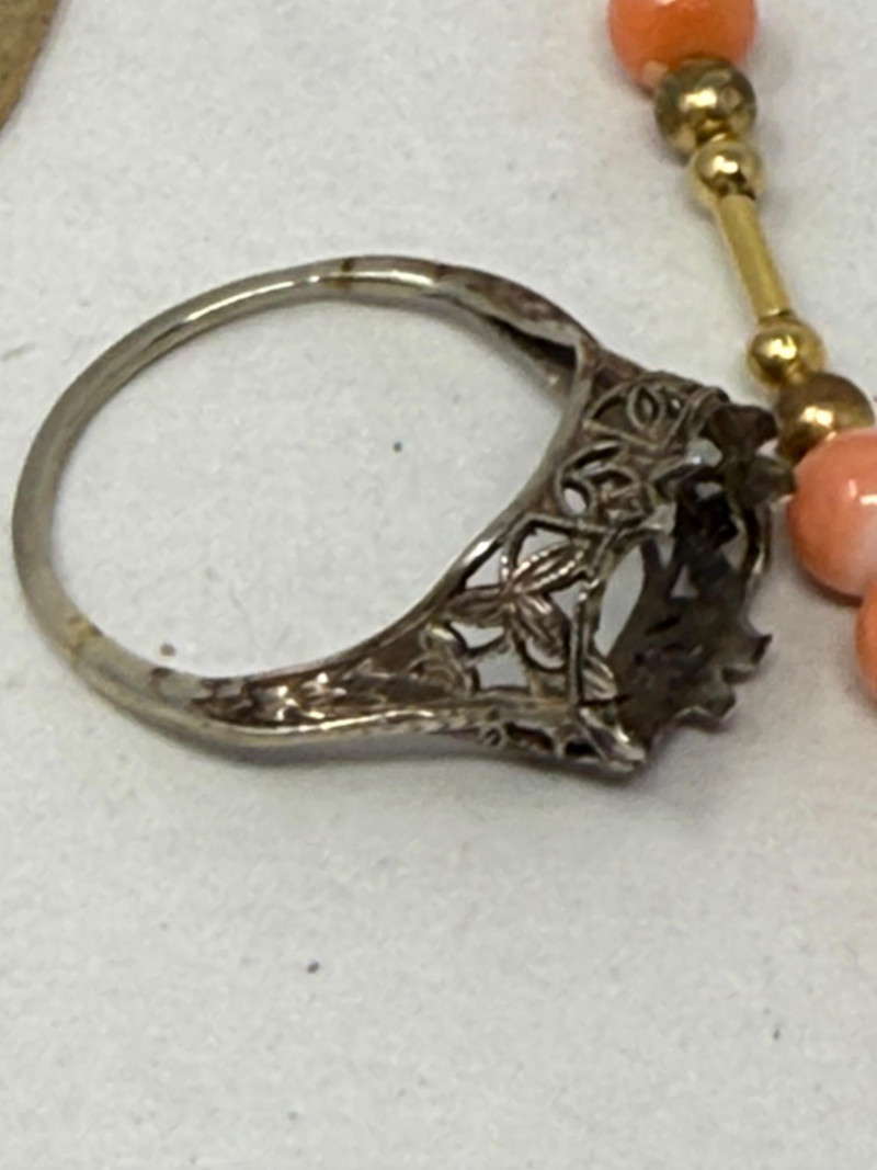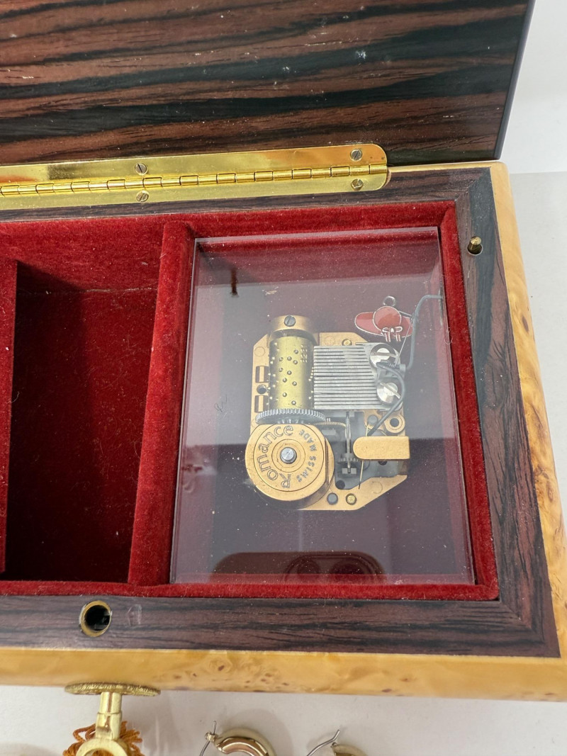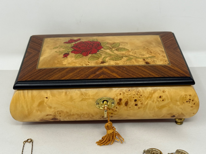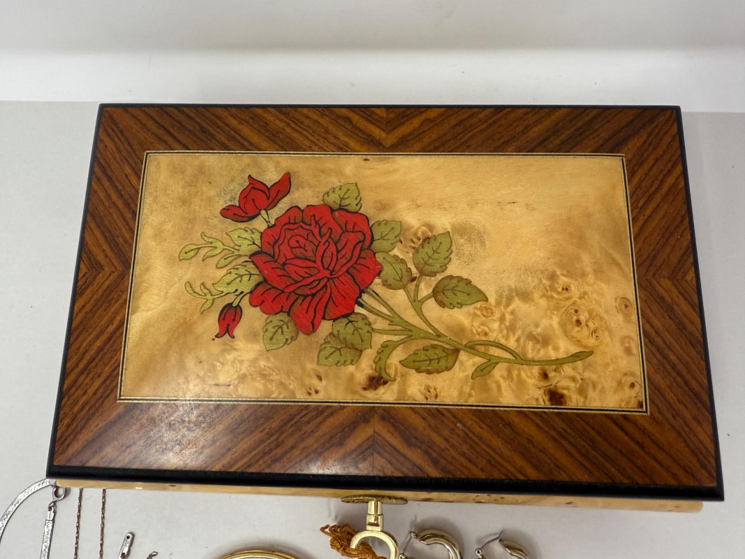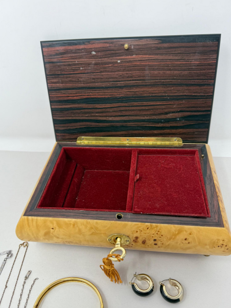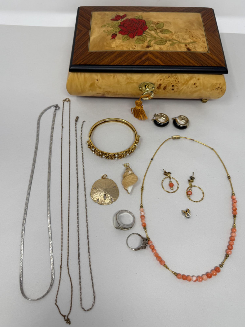Jewelry Box & Sterling Silver Chains & Ring + Locking wood box with key is equipped to play Unforgettable, but it is not working. Missing one front foot 2- Sterling silver chains weighing 6.36g and 2.72g Filigree ring setting of unknown metal. Appears hand crafted of silver. Weighs 1.15g Avon 925 ring with mother of pearl and filigree Avon GF chain 1.15g Other costume pieces