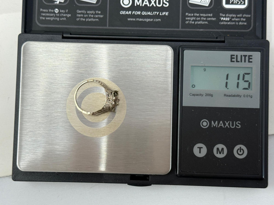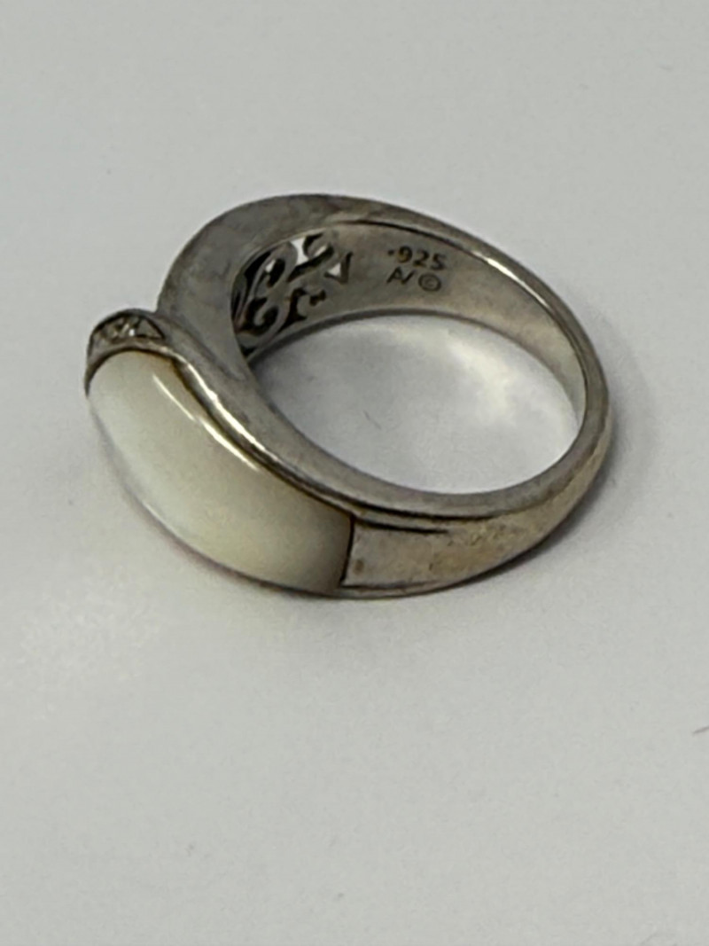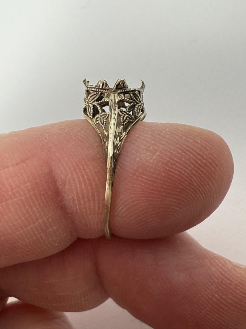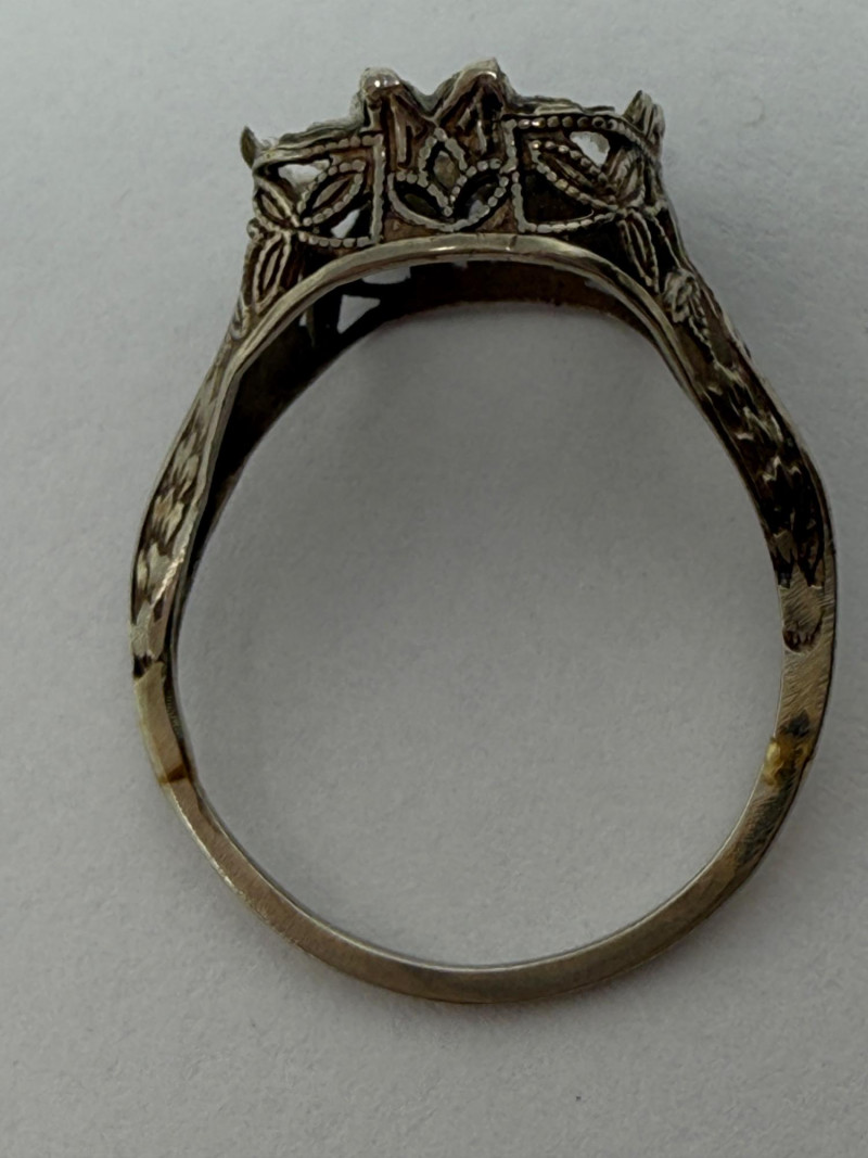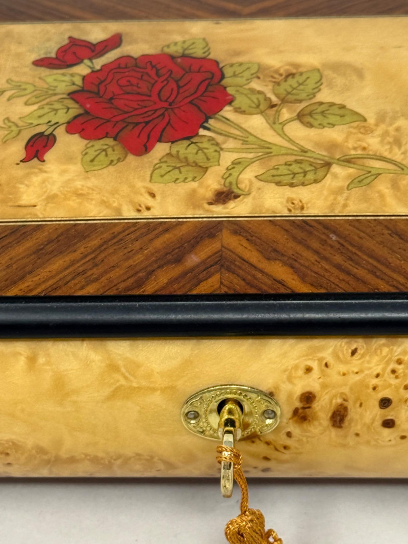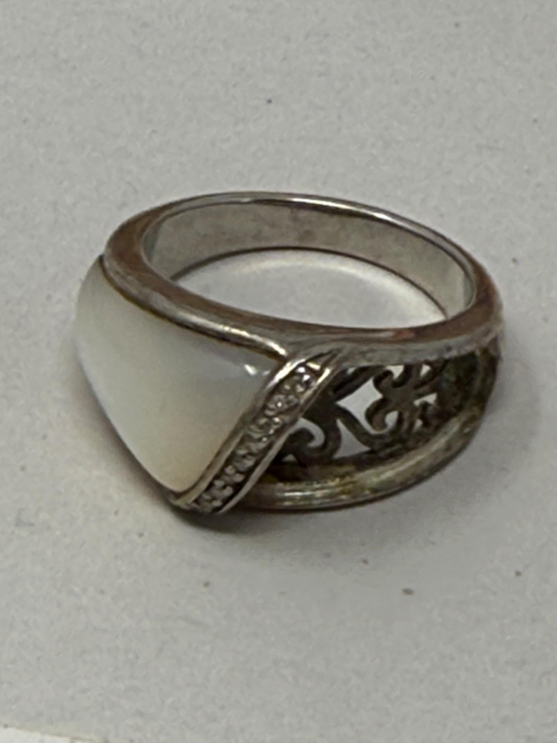Jewelry Box & Sterling Silver Chains & Ring + Locking wood box with key is equipped to play Unforgettable, but it is not working. Missing one front foot 2- Sterling silver chains weighing 6.36g and 2.72g Filigree ring setting of unknown metal. Appears hand crafted of silver. Weighs 1.15g Avon 925 ring with mother of pearl and filigree Avon GF chain 1.15g Other costume pieces