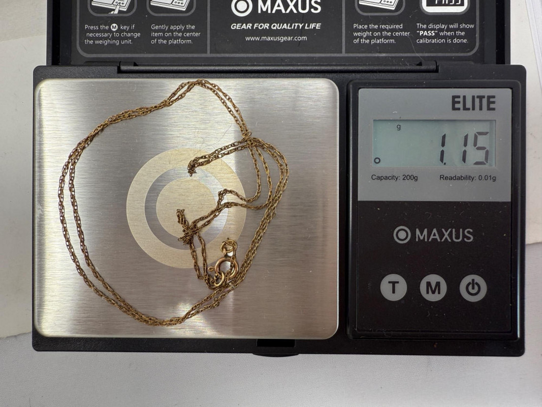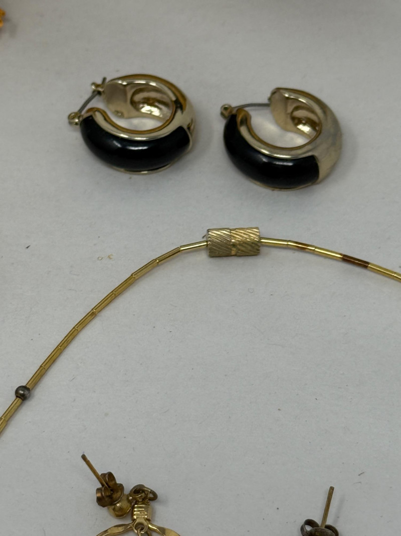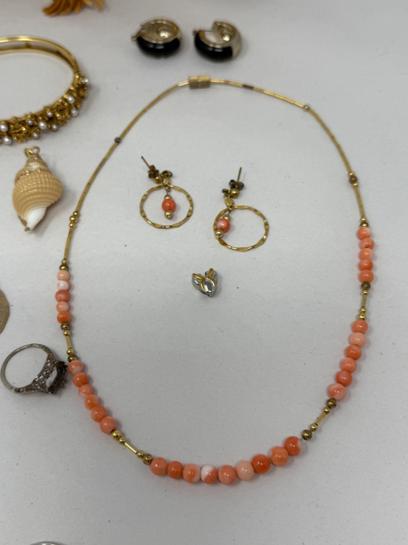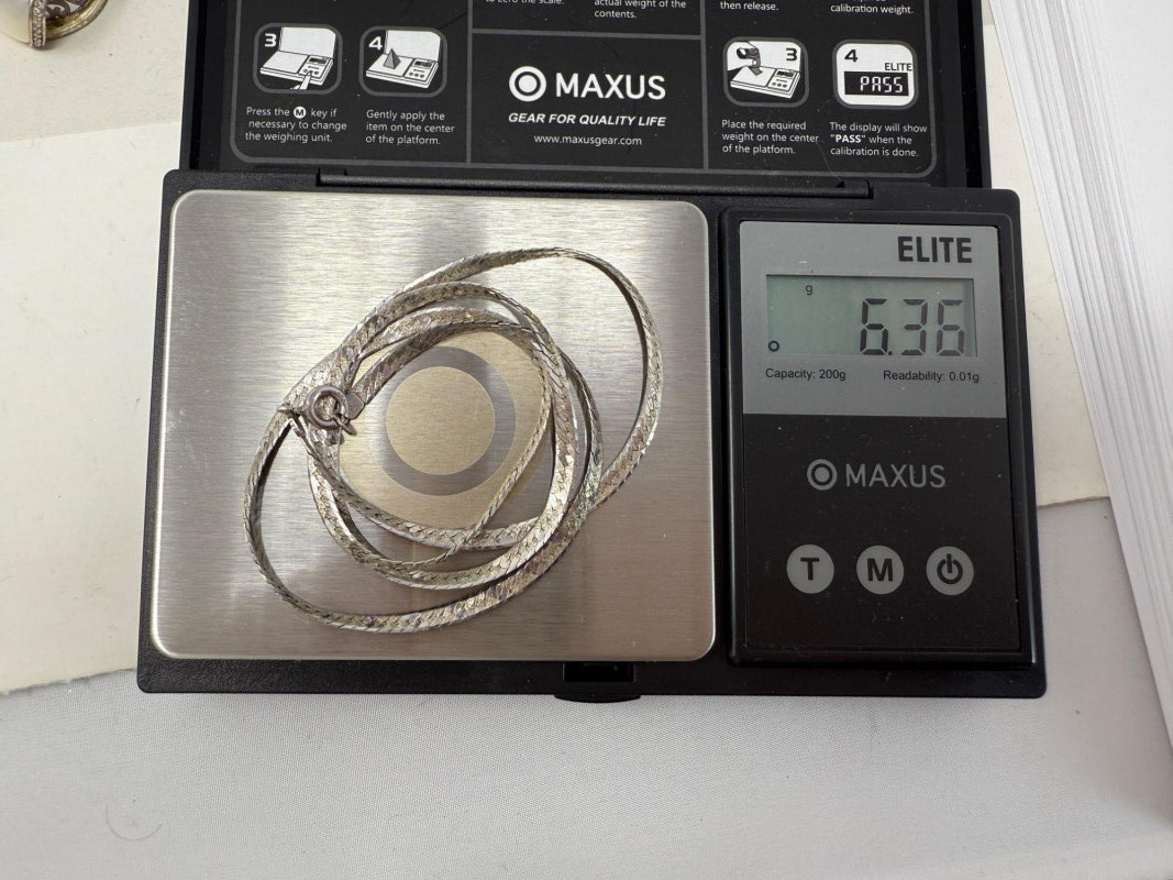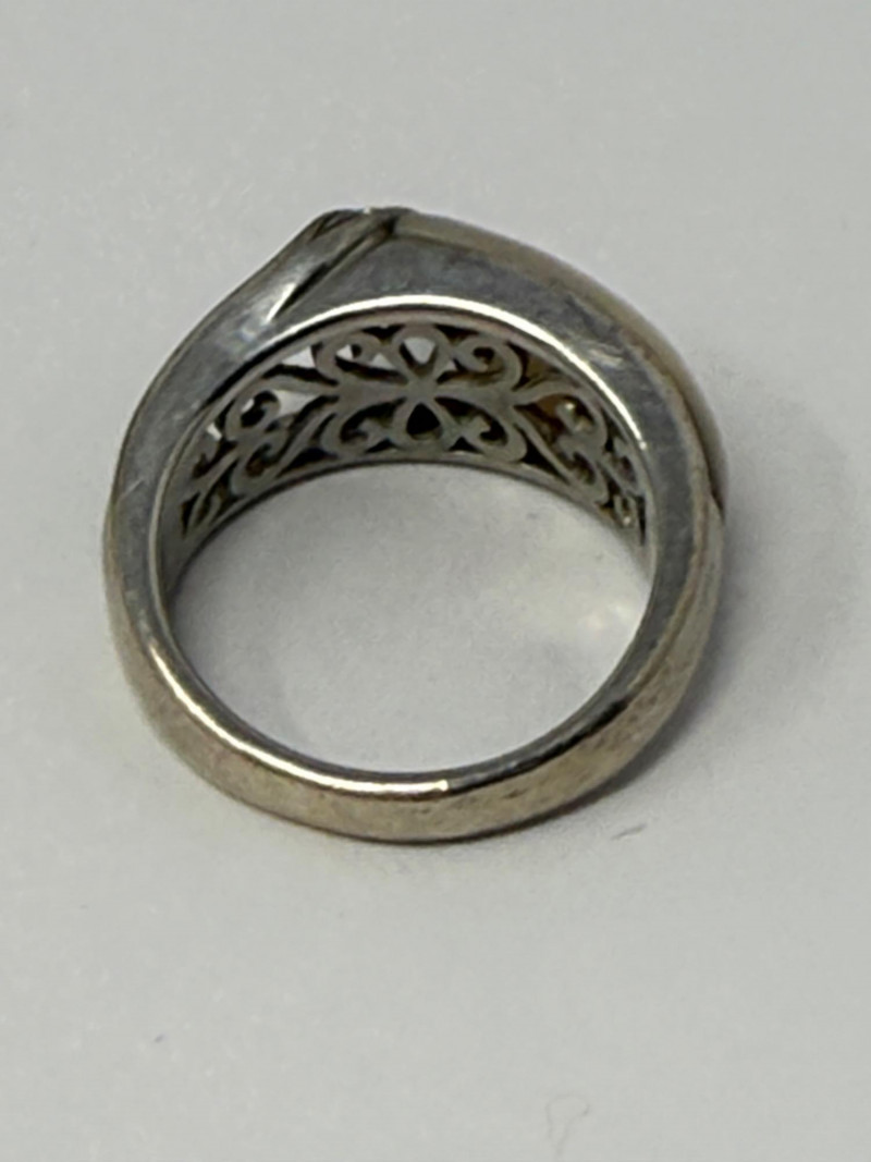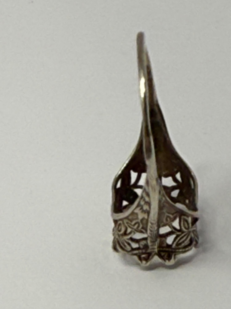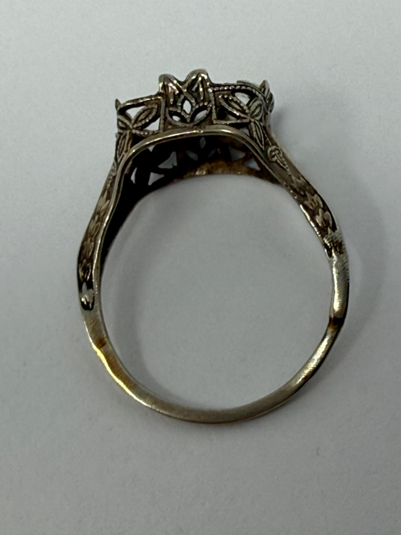 Jewelry Box & Sterling Silver Chains & Ring + Locking wood box with key is equipped to play Unforgettable, but it is not working. Missing one front foot 2- Sterling silver chains weighing 6.36g and 2.72g Filigree ring setting of unknown metal. Appears hand crafted of silver. Weighs 1.15g Avon 925 ring with mother of pearl and filigree Avon GF chain 1.15g Other costume pieces