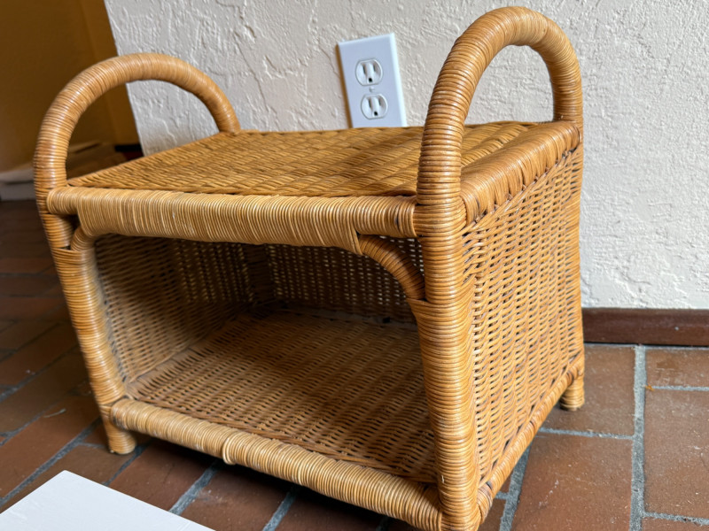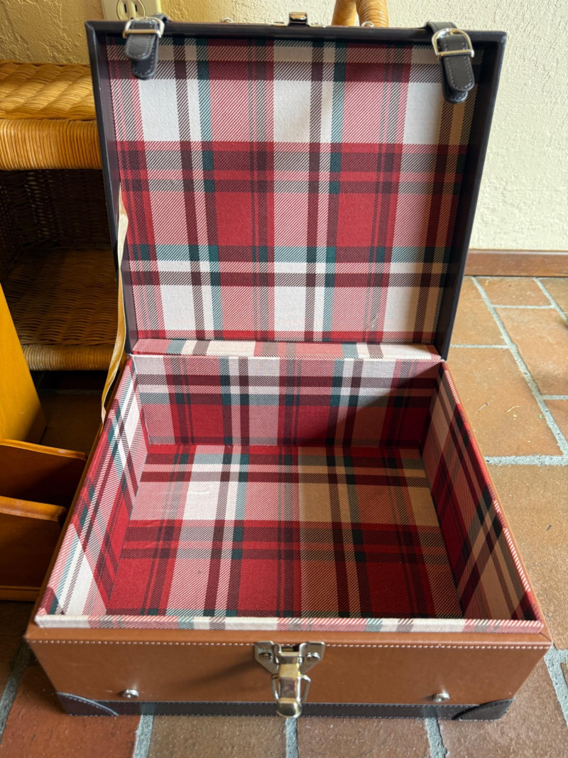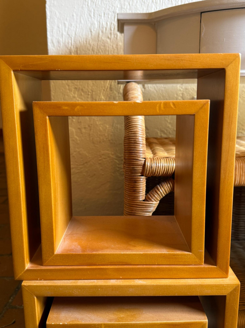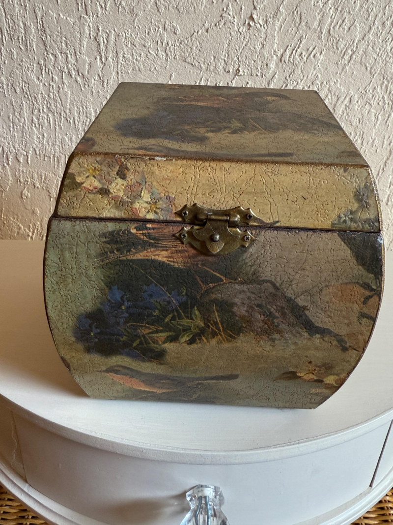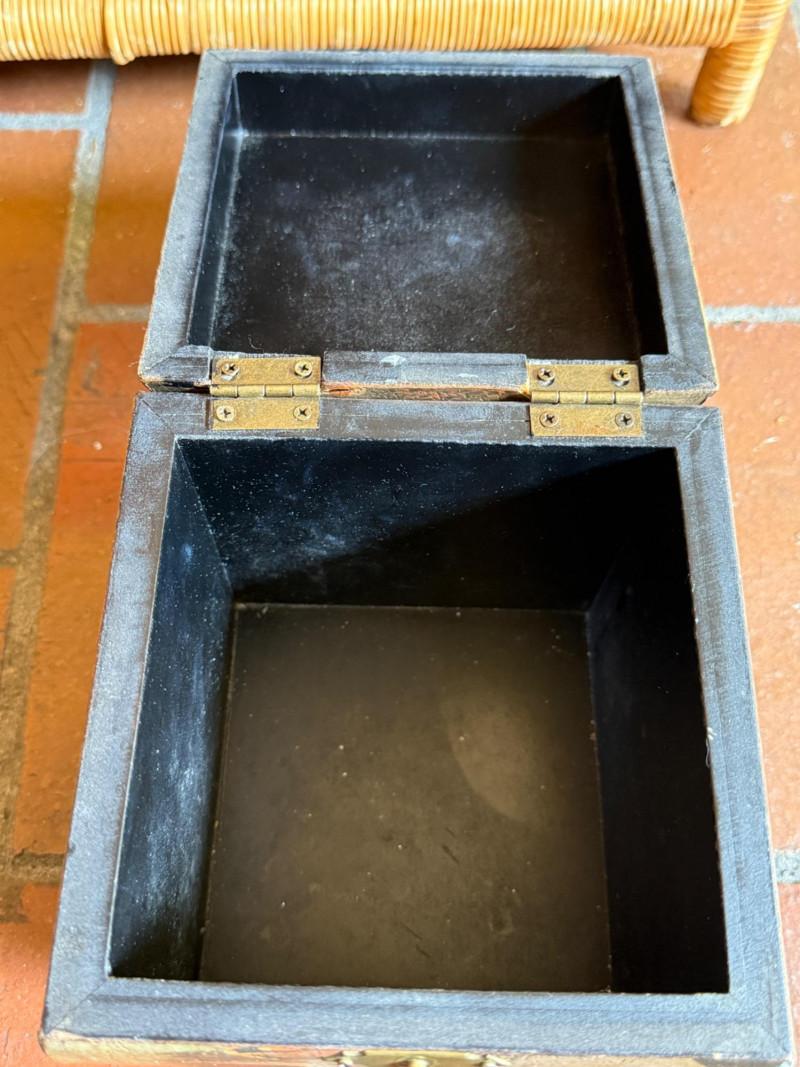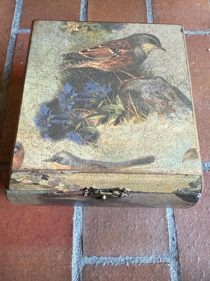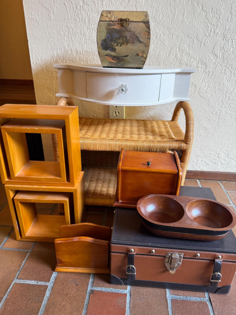 Wicker display piece is 17.5 x 11 x 15.5” Black and brown vinyl box measures 11.75 x 10.25 x 6 Wood hanging cubes measure 8 in.² and 6 in.². Bird motif wood box with hinged lid.