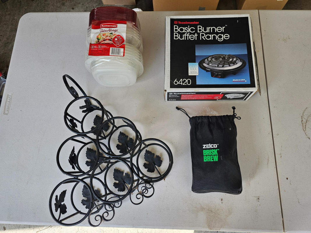 Miscellaneous Kitchen Lot! Toastmaster Basic Burner Buffet Range Zelco Brisk Brew (single-cup coffee maker) 6 Bottle Wine Rack Rubbermaid Take Alongs (5 Containers With Lids)