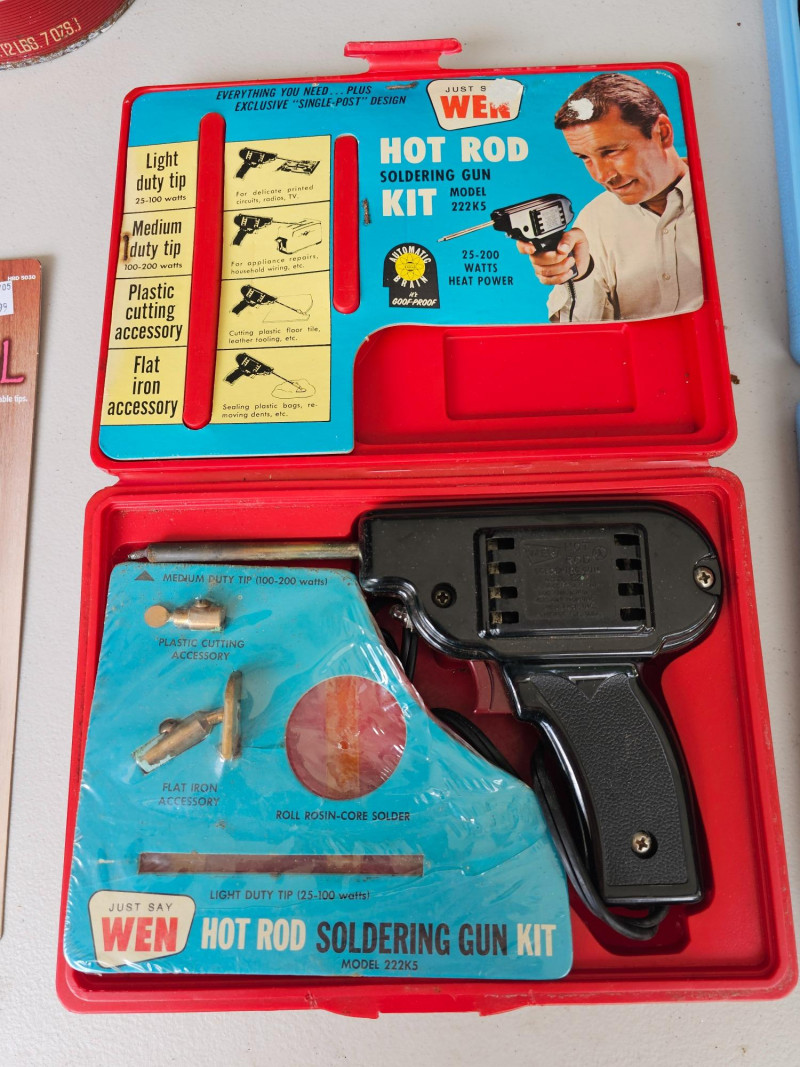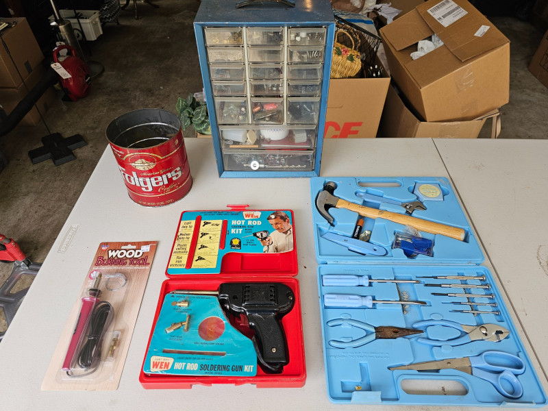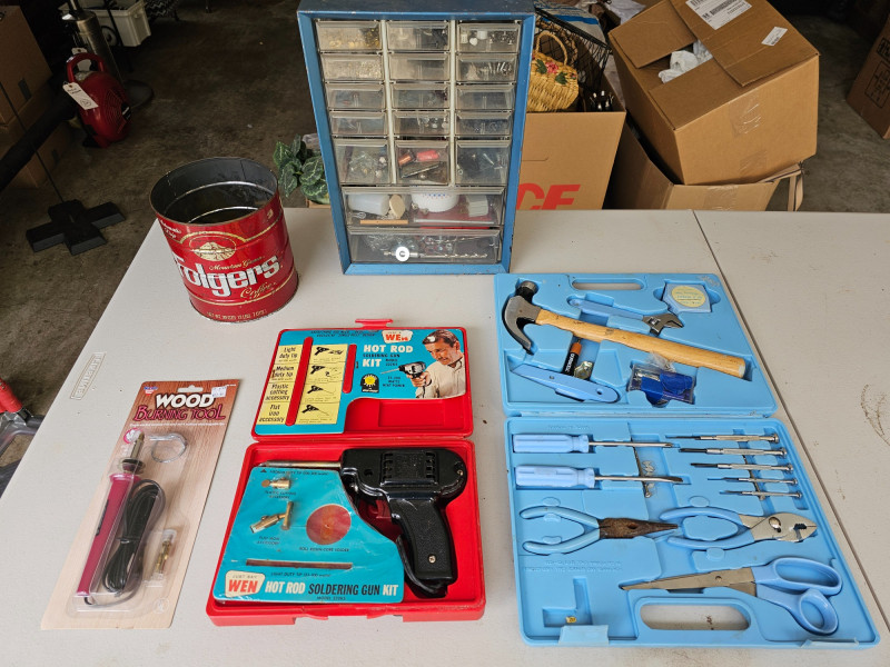 Miscellaneous Garage Lot! Wen Hot Rod Soldering Gun Kit Wood Burning Tool Do It Herself 99-Piece Tool Kit 17-Drawer Hardware Bin Coffee Can 1/2 Full Of New 3.25" Nails Park 'N Place STOP Sign Light (needs batteries)