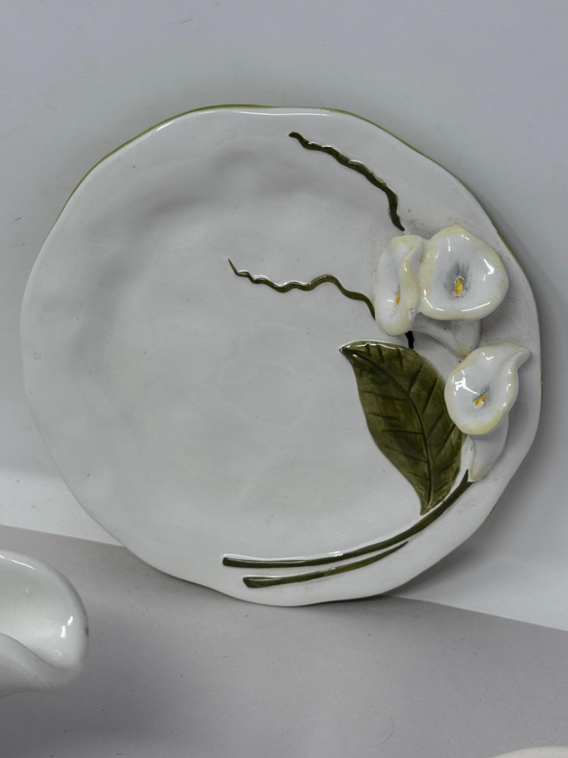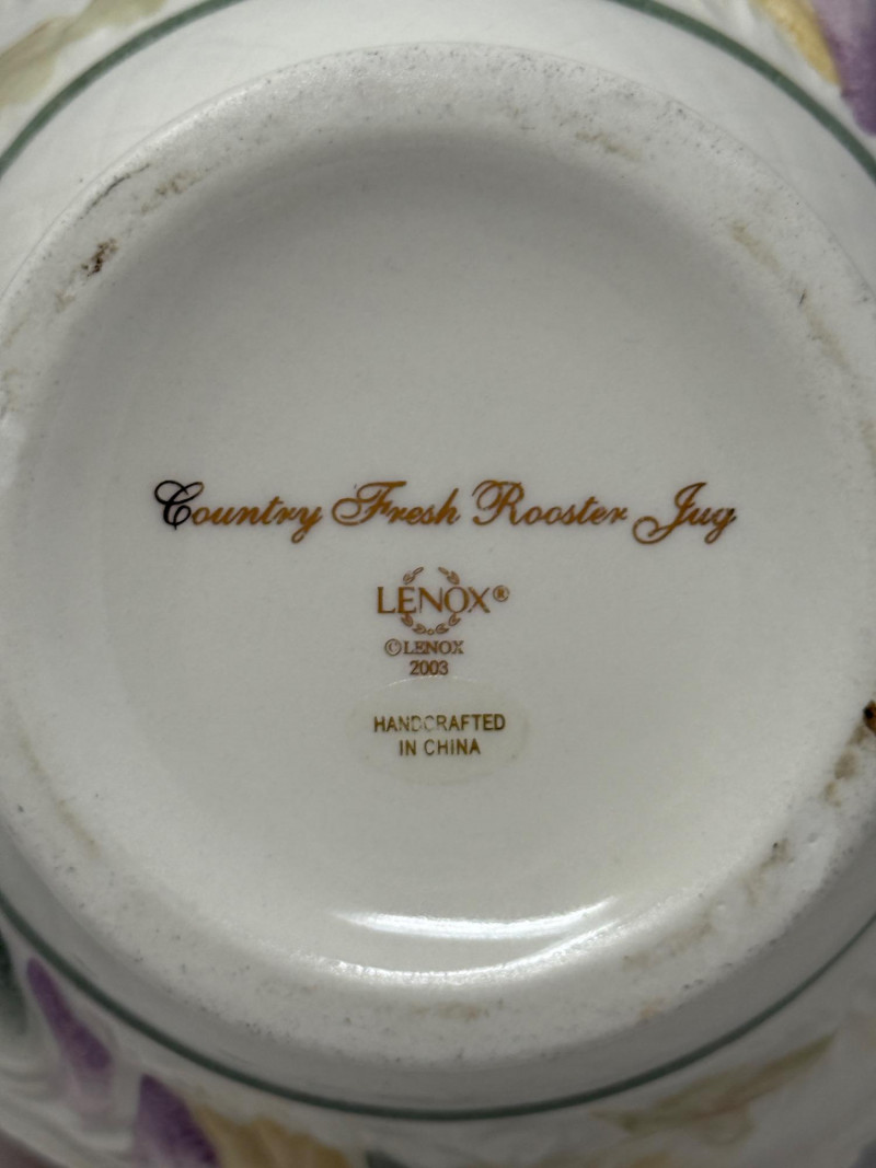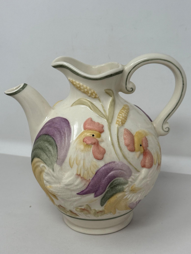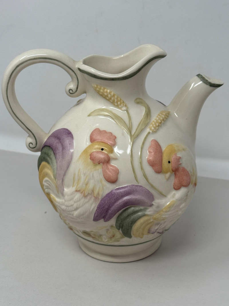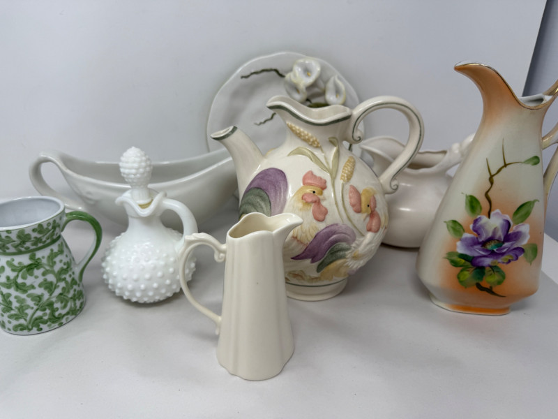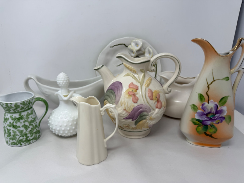 Premium Vessel Collection and a plate. Ucagco China Handpainted Vessel is tallest at 8.25x4x2.25” Lenox Country Fresh Rooster Jug Andrea by Sadek green painted vessel Avon milk glass hobnail decanter Ivory I.Godinger & Co Shenango China, Newcastle PA Gravy Boat