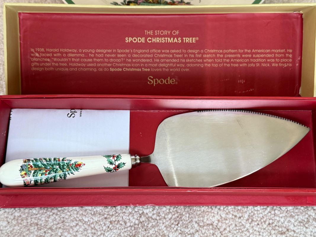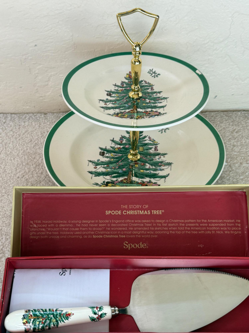 Spode Christmas Tree Two Tier Server & Cake Slicer 2 Tier server is 10.5”x10” with one spot of paint loss. Cake Server in original box