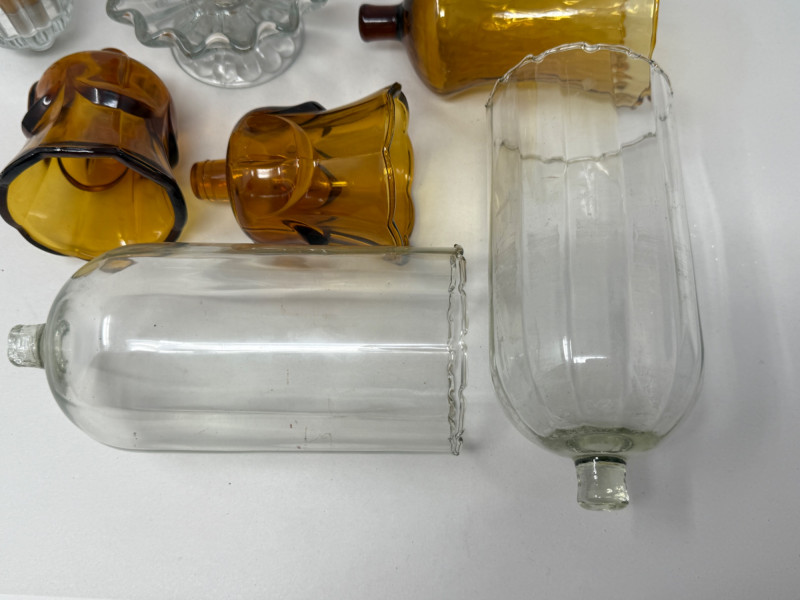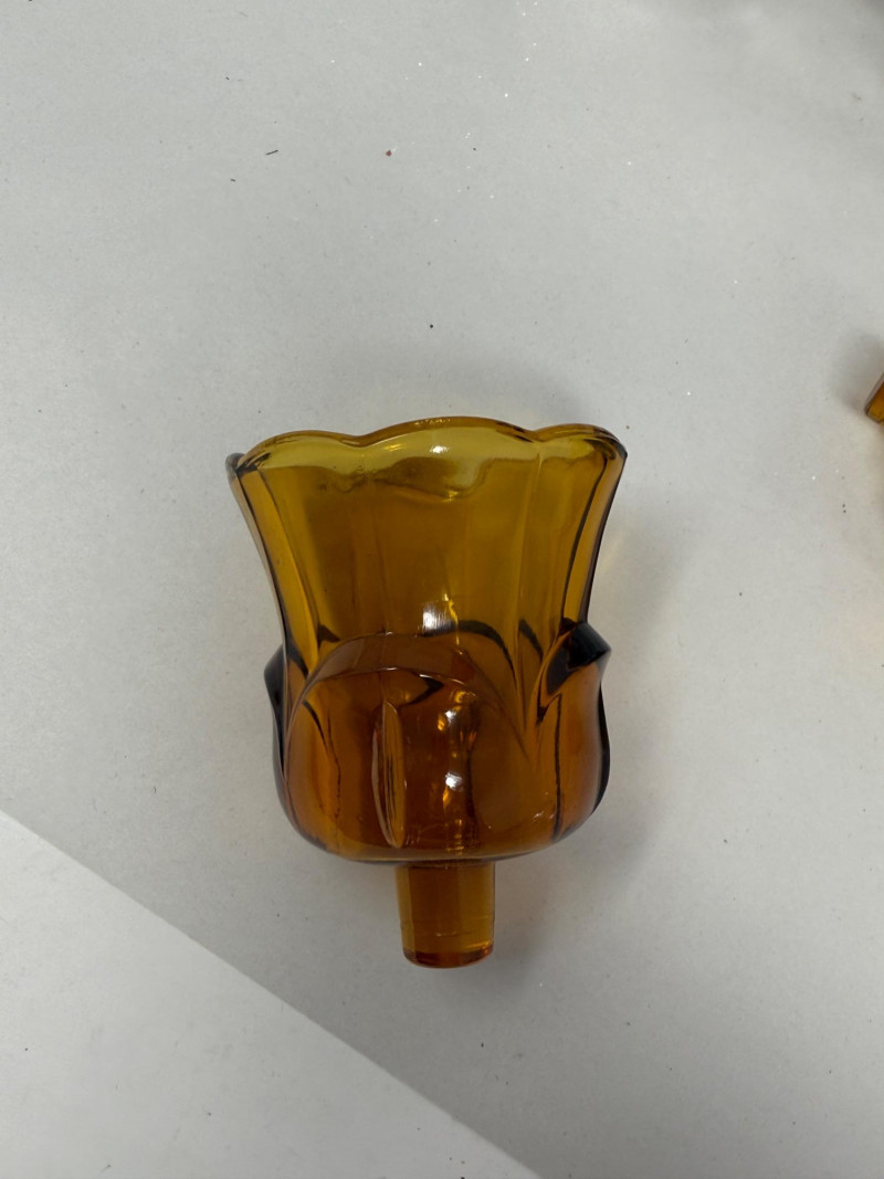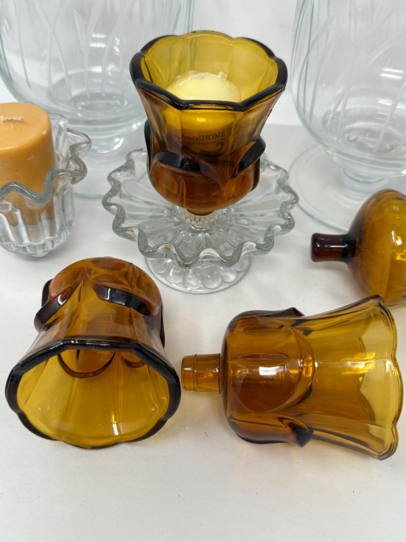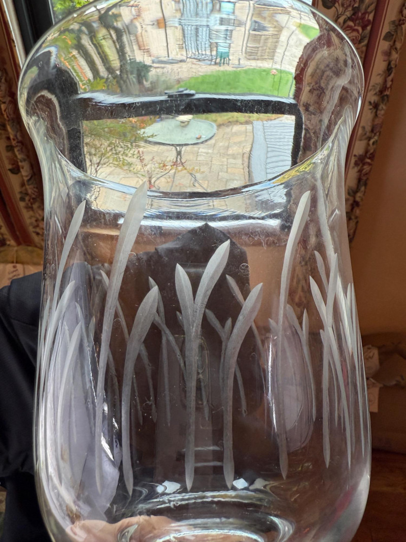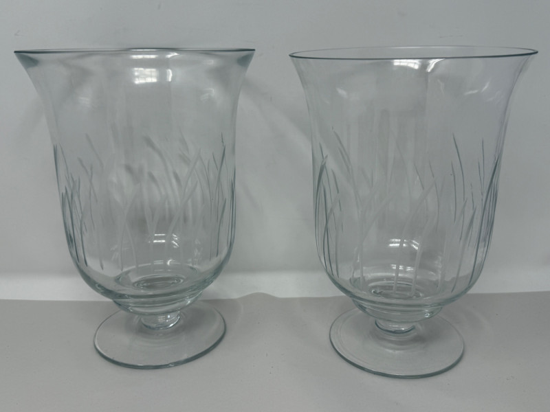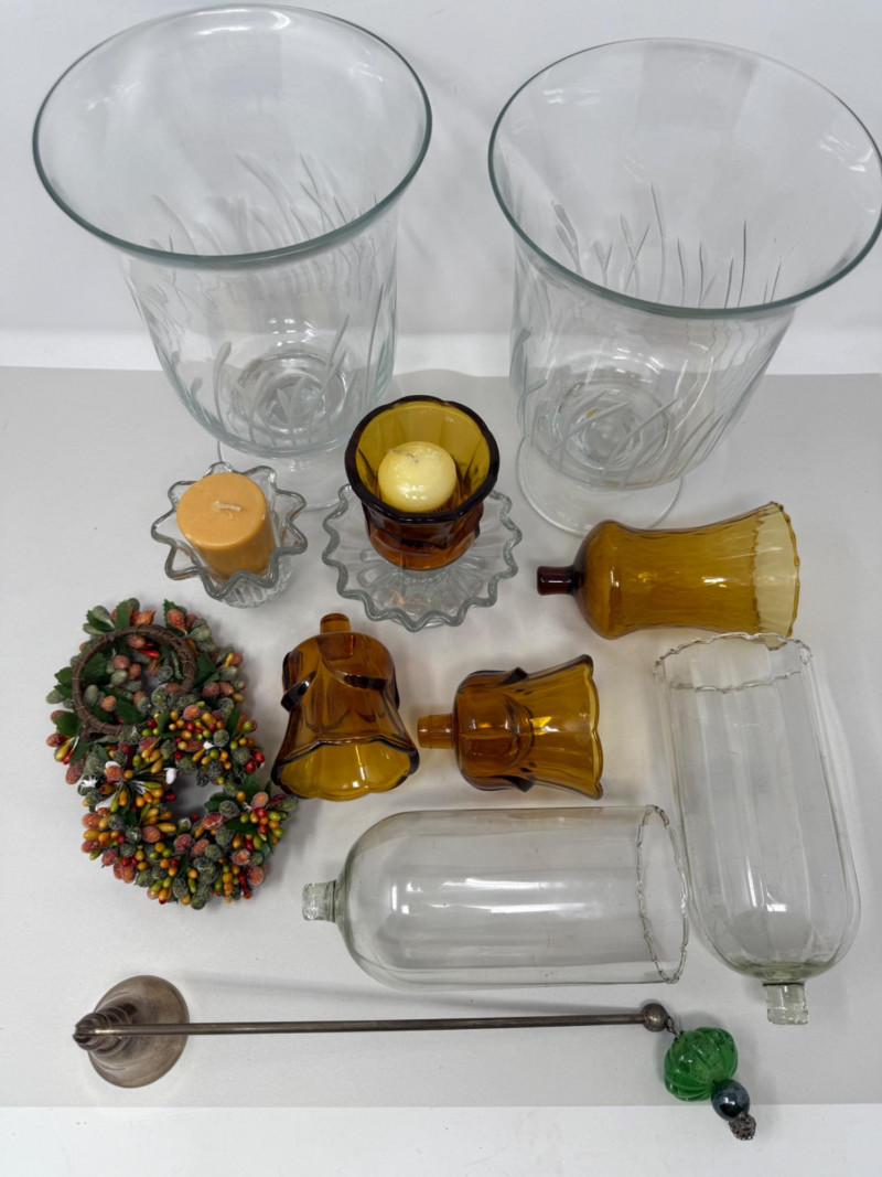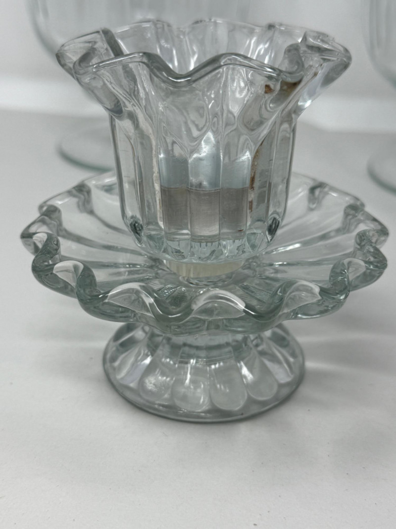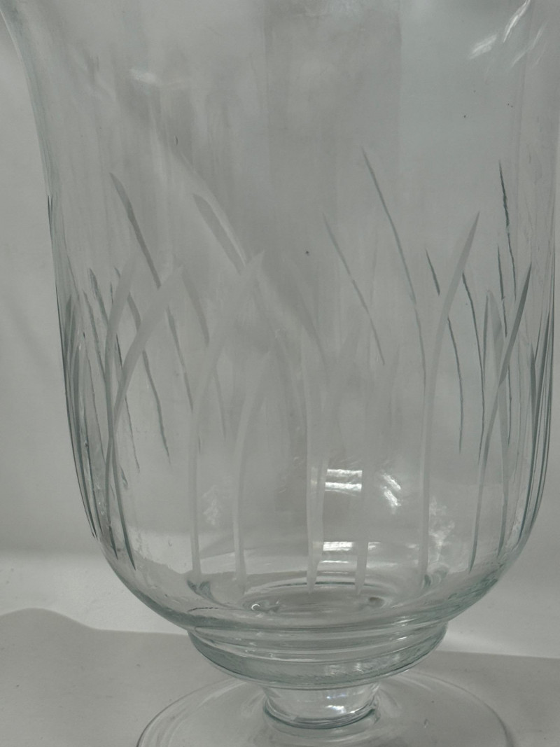 Vintage Candle Holders - Silver Snuffer - Etched Pillar Vases One base, many options. 2 Pillar vases with cut and etched grass design 6.5”x9” 2 Candle rings 2 Votives