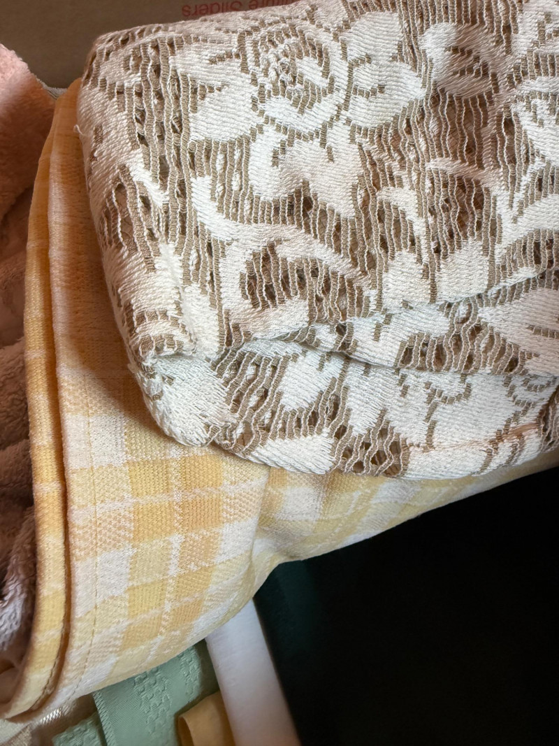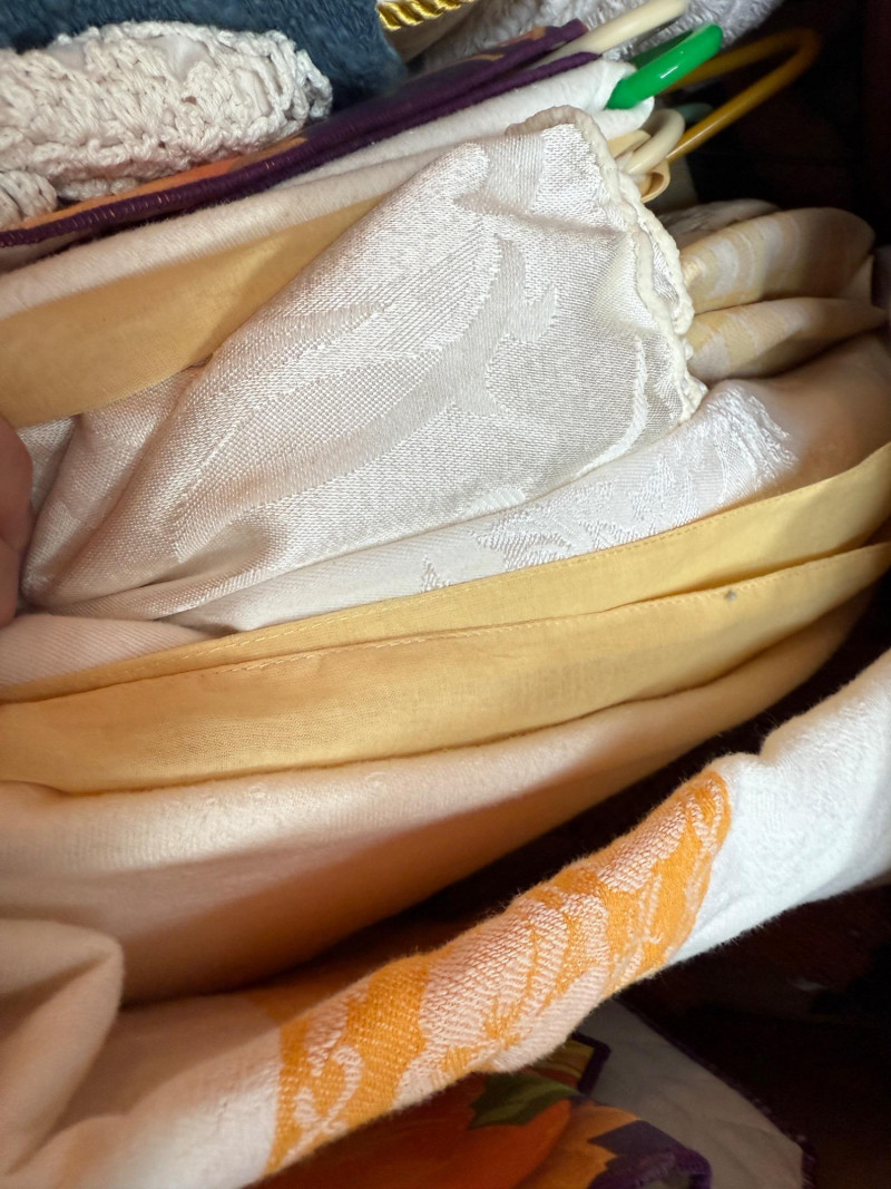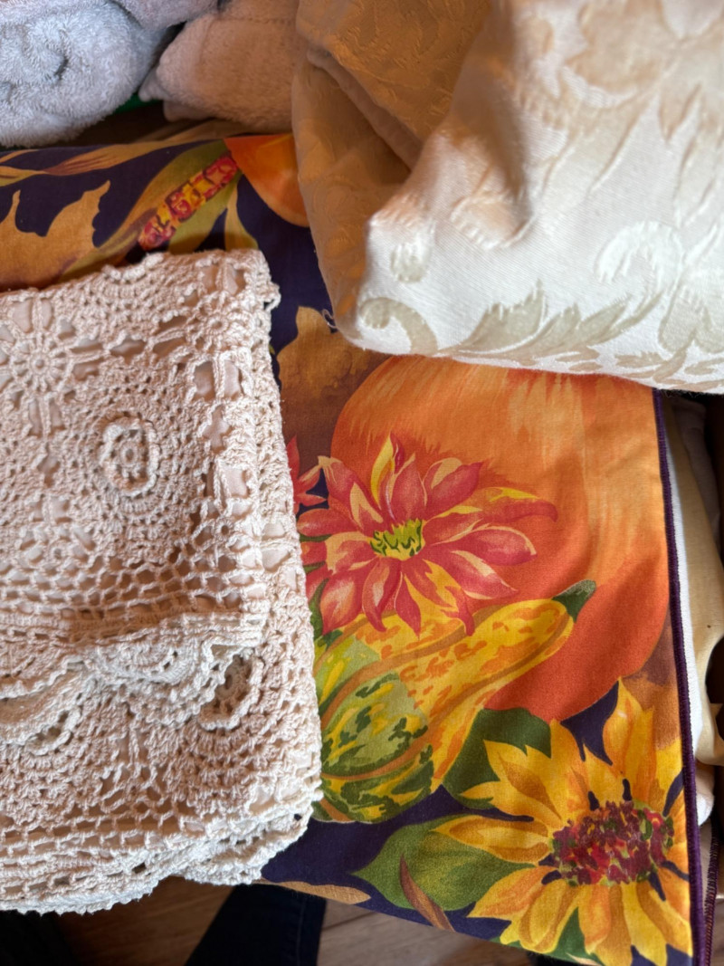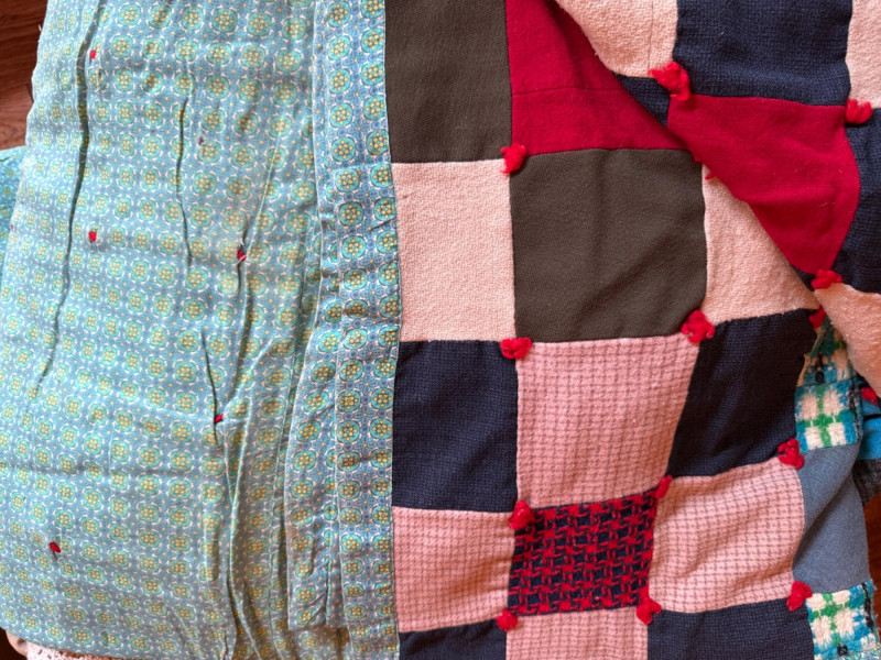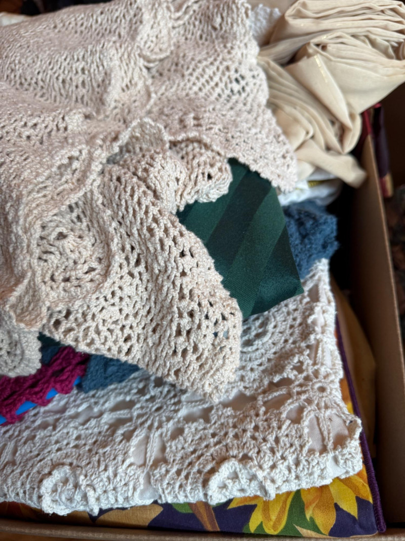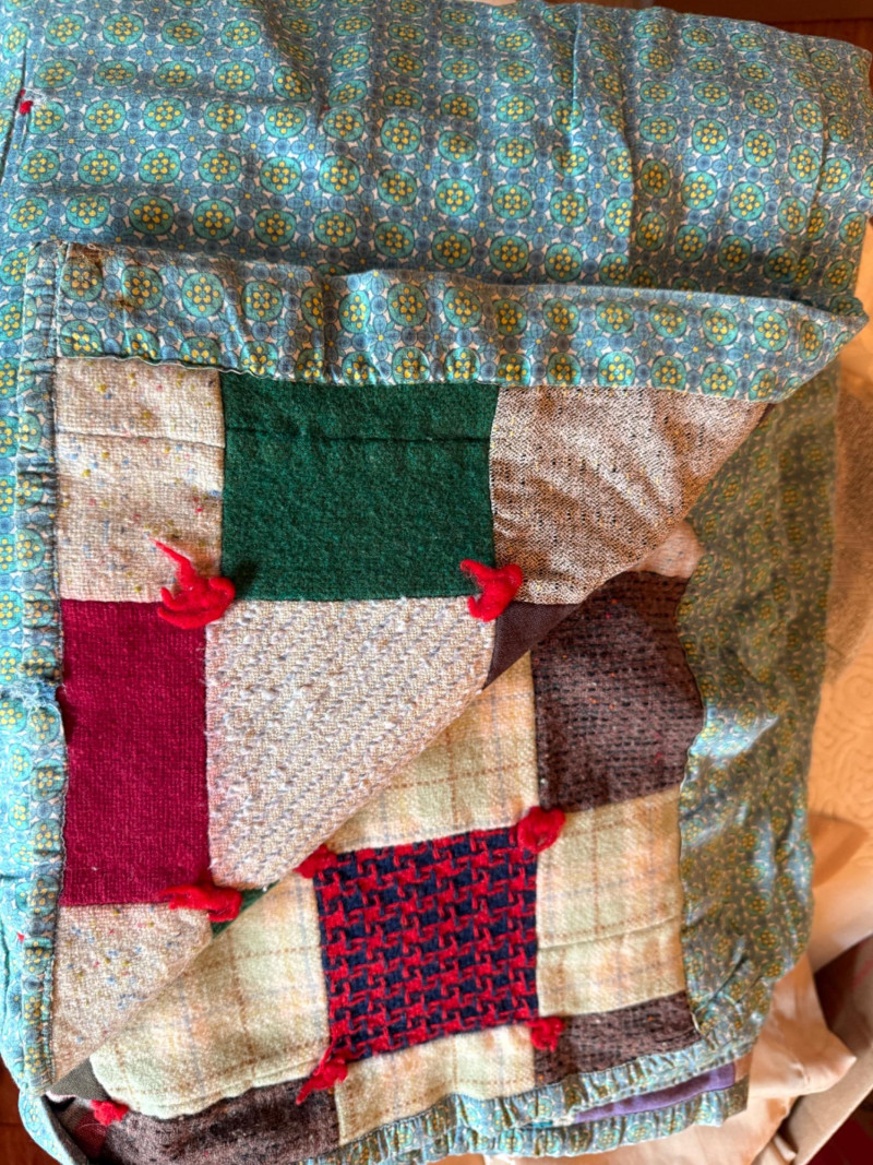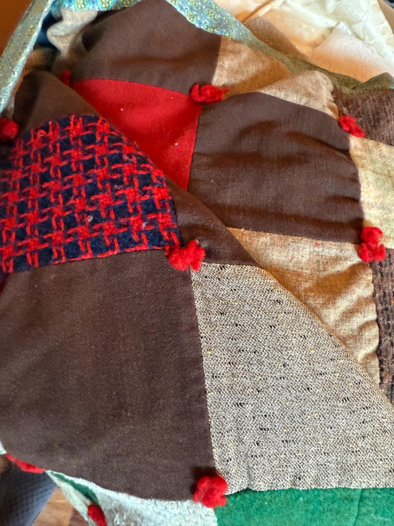 Handmade Tie Quilt and XL Box of Blankets, Linens. Vintage thick handmade tie quilt made from colorful wool squares and red tie. This is a 24x24x18” box of bed and table linens, sheer curtains, table cloths, runners and bath linens.