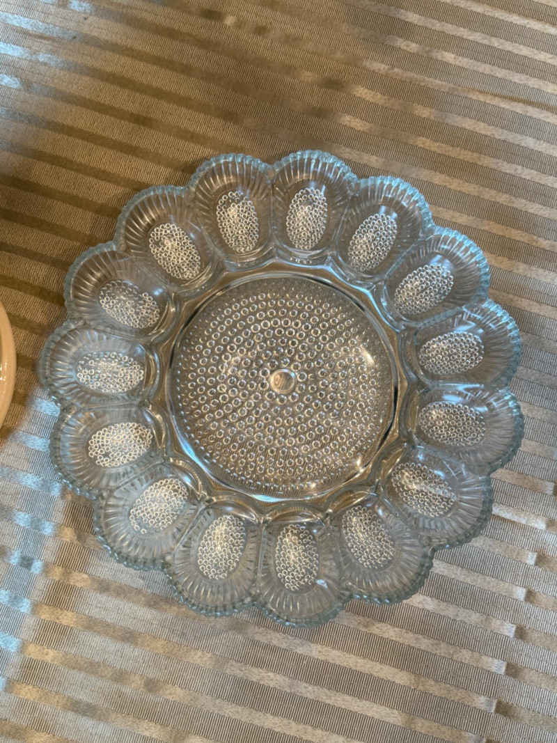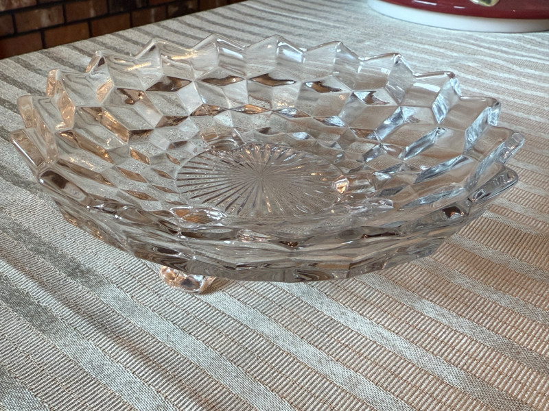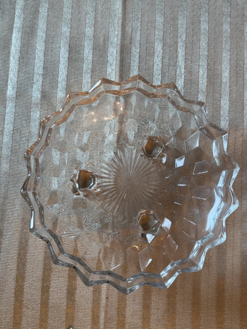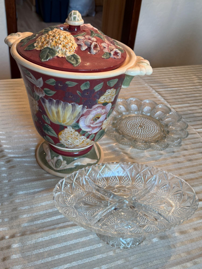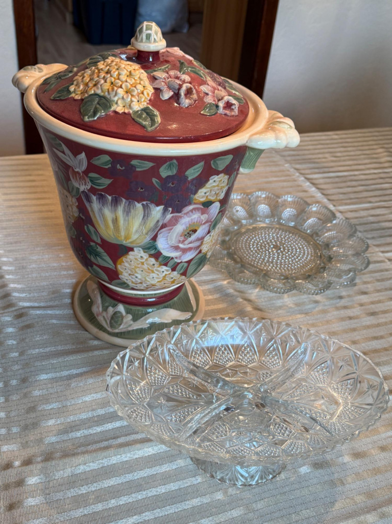 Ceramic Jar with Crystal Egg Plate Plus Egg plate is 11” Oval pedestal 4 section server round diamond design footed candy dish