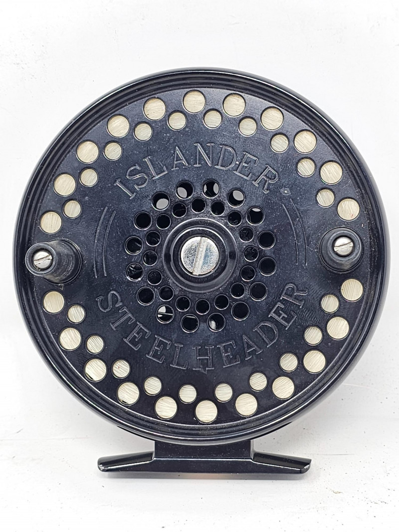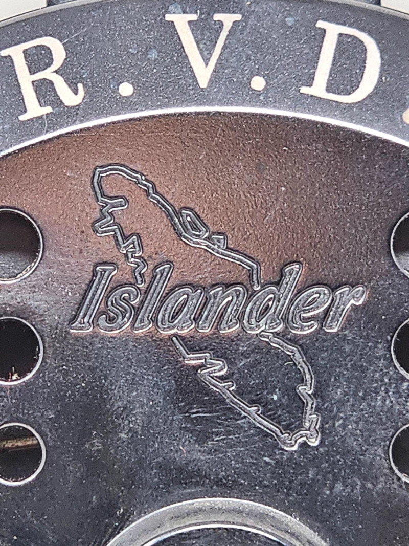 Islander Steelheader Center Pin Reel By Islander Reels Laser engraved R.V.D. and #1089 Made with precision CNC machining, bearings, and a thick aluminum frame and spool with a large stainless steel spindle, ensuring durability. It features a redesigned spool with an enhanced palming rim surface, a fully machined reel foot, and through-bolted, serviceable handles Islander Reels, based in British Columbia, Canada, has established a strong reputation for producing high-quality fly fishing reels since its inception. Known for their precision engineering and durable construction, Islander reels are favored by anglers who demand reliable performance in challenging conditions. The company focuses on creating reels that offer smooth operation and robust drag systems, essential for landing large and powerful fish. Centerpin reels, like the Steelheader model, are specifically designed for float fishing techniques, allowing for a natural drift presentation that entices wary fish. The Islander Steelheader is particularly well-regarded for its lightweight design, smooth rotation, and dependable braking system. These reels are often used in pursuit of steelhead and salmon, where a controlled and consistent drift is crucial for success. 4 3/8" Across Appears to be in beautiful, like new condition! Islander Steelheader Centerpin Reel can be valued between $300-$400 depending upon condition
