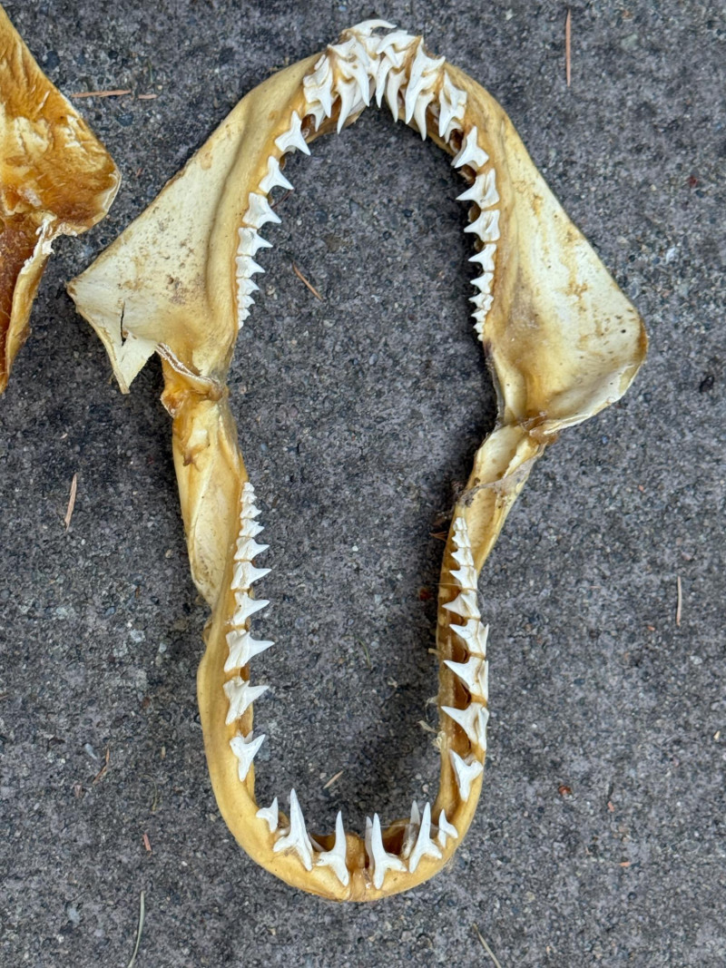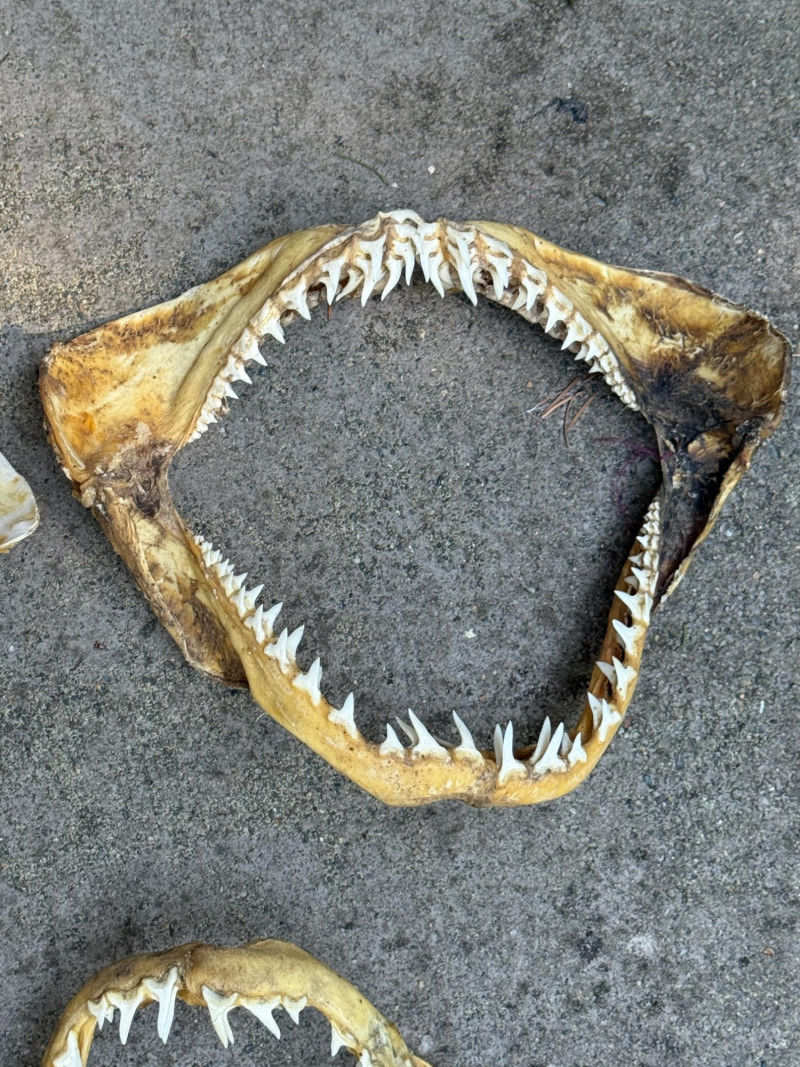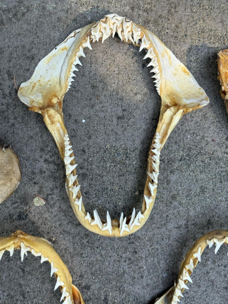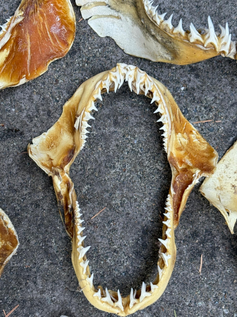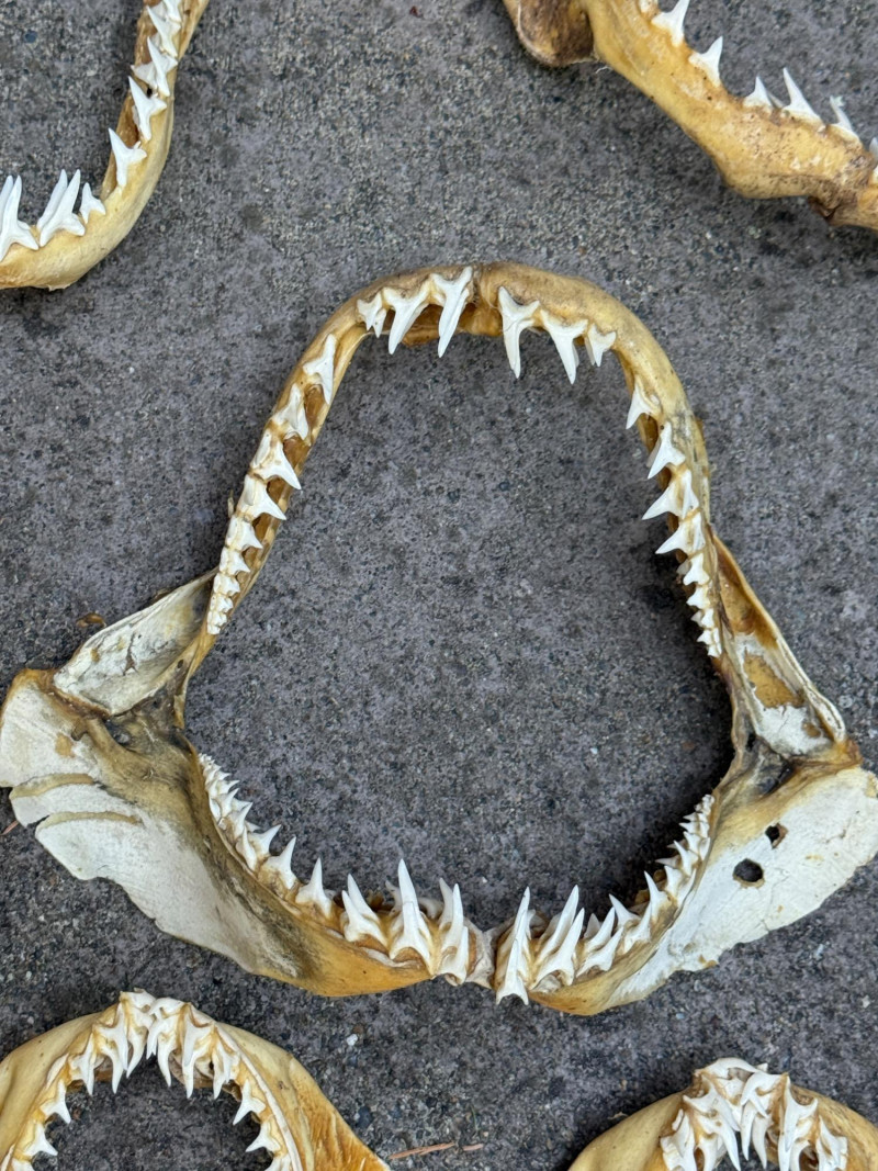Decades of salt water fishing produces this group of 10 Sets of Shark Jaws - Teeth and Vertebrae Largest upper left jaw is 12x11” Small bag of loose teeth and vertebrae.