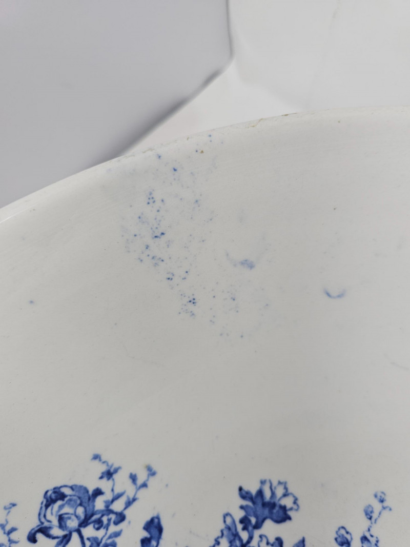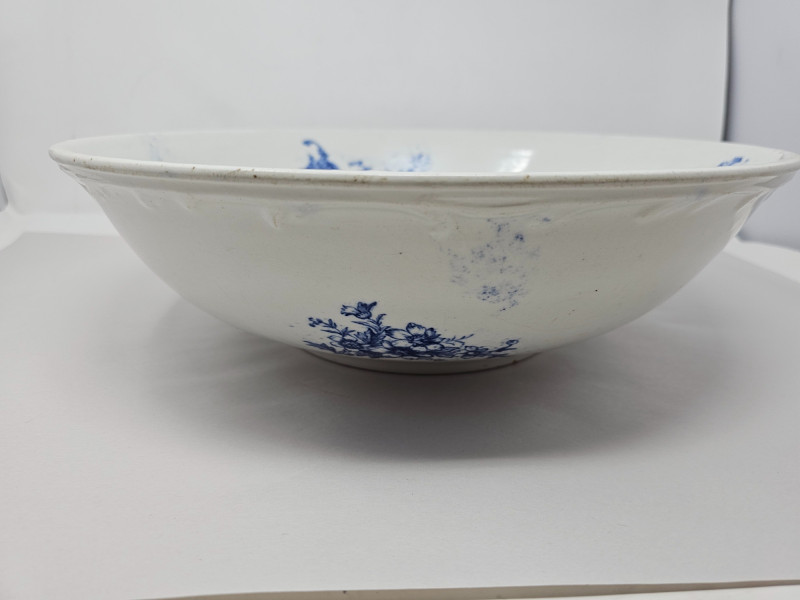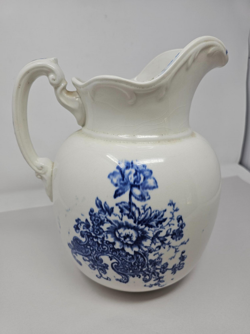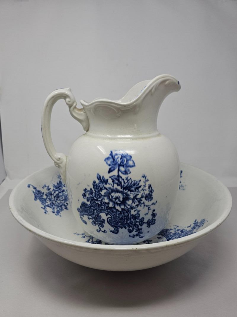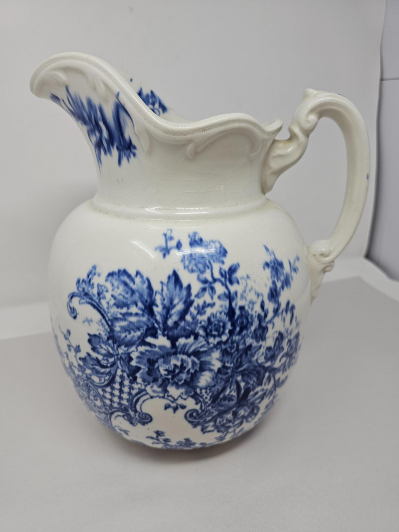Maddock's Lamberton Works Royal Vitreous Porcelain Pitcher & Wash Basin Set Possibly made in the early 1900s Their 'Royal Porcelain' line was particularly popular, showcasing elegant shapes and decorative motifs of intricate transfer-printed designs The transfer-printed designs shows smearing in many places. Some of the blue is discolored some of the otherwise white porcelain finish. Some crazing as well (see pics for condition) Pitcher: 11"T x 9.5"W x 7.5"D Wash Basin: 4.5"T x 15.5"W