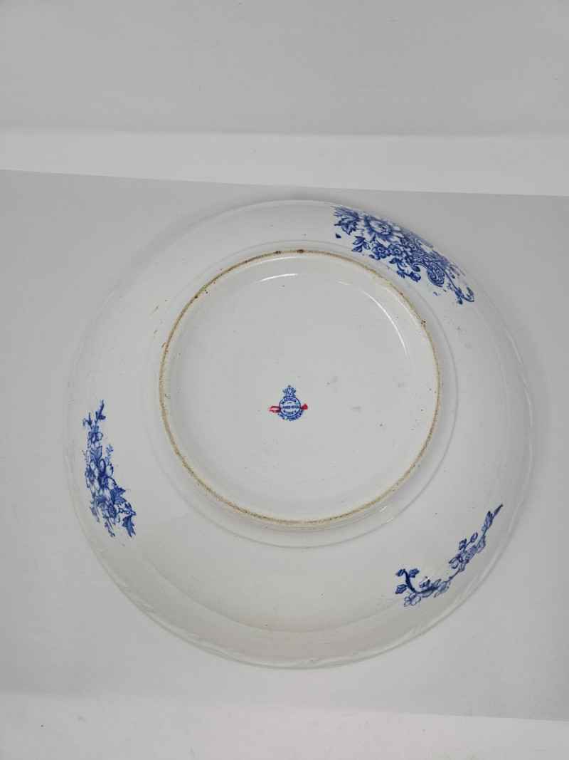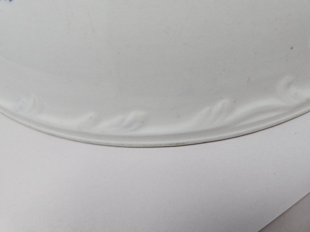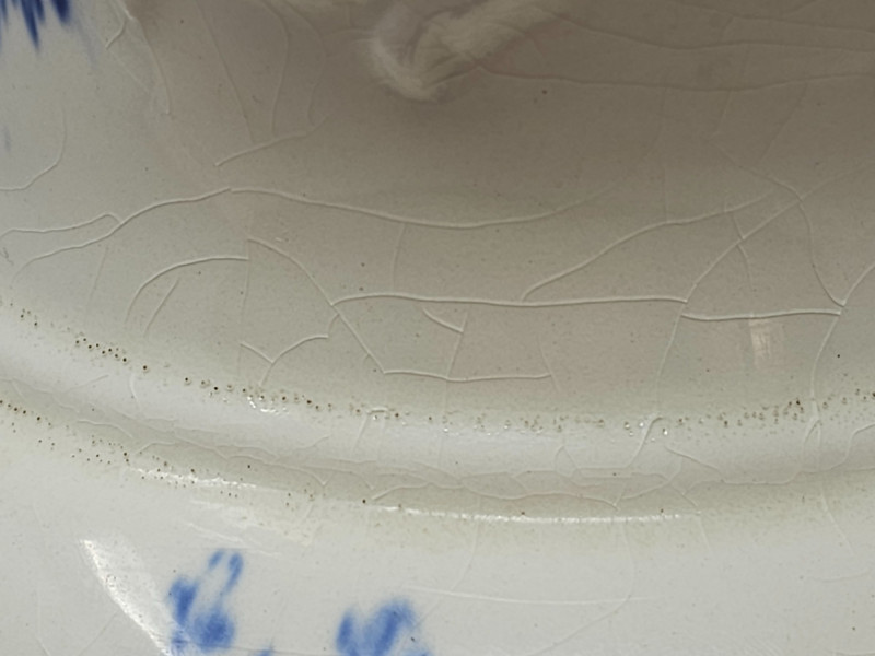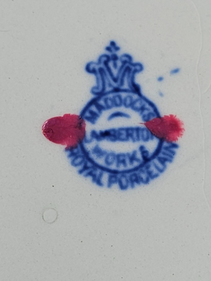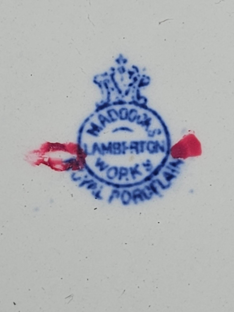 Maddock's Lamberton Works Royal Vitreous Porcelain Pitcher & Wash Basin Set Possibly made in the early 1900s Their 'Royal Porcelain' line was particularly popular, showcasing elegant shapes and decorative motifs of intricate transfer-printed designs The transfer-printed designs shows smearing in many places. Some of the blue is discolored some of the otherwise white porcelain finish. Some crazing as well (see pics for condition) Pitcher: 11"T x 9.5"W x 7.5"D Wash Basin: 4.5"T x 15.5"W