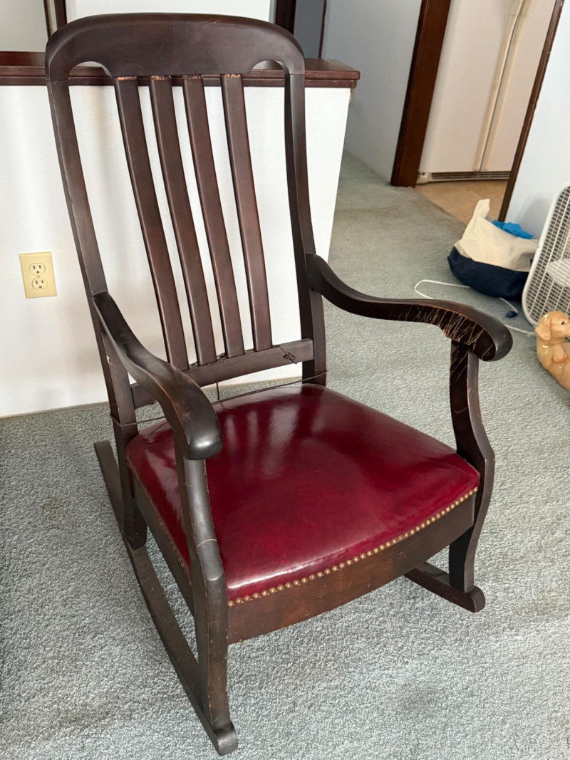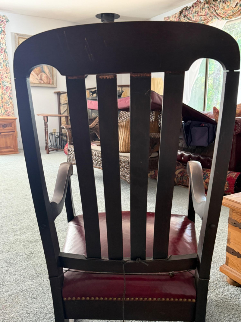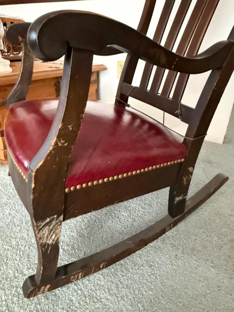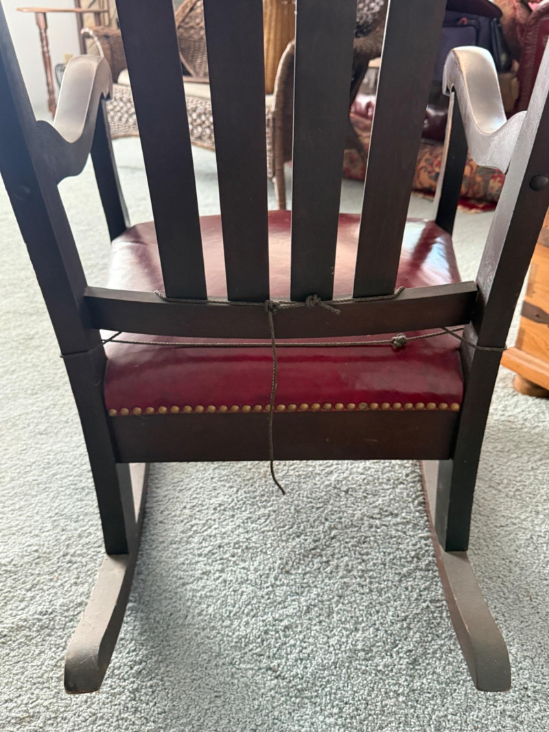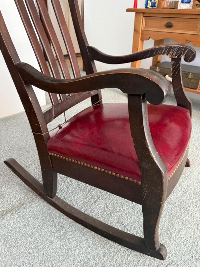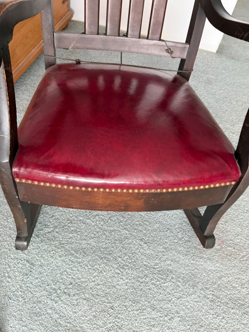 Vintage Spindle Back Rocking Chair Red leather studded seat Dark stained wood Spindles need to be reattached on back. See pics 23x30x39.5”