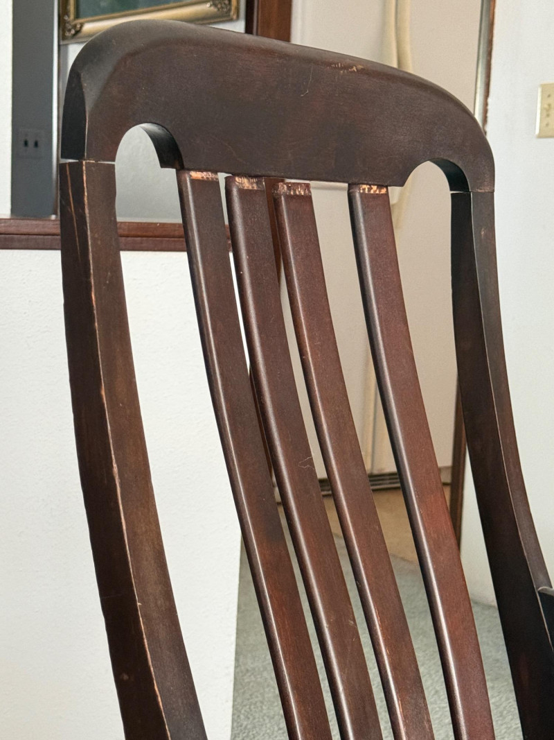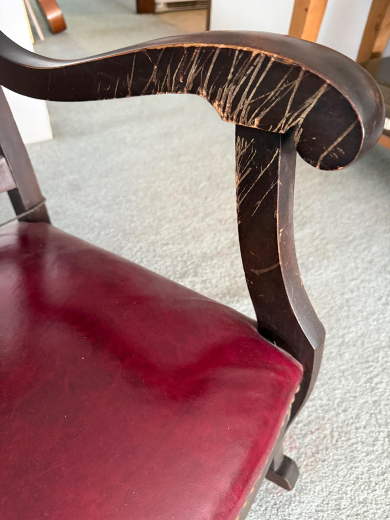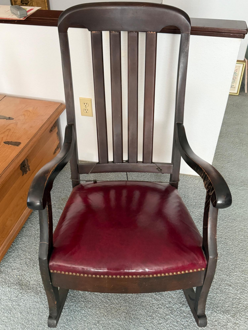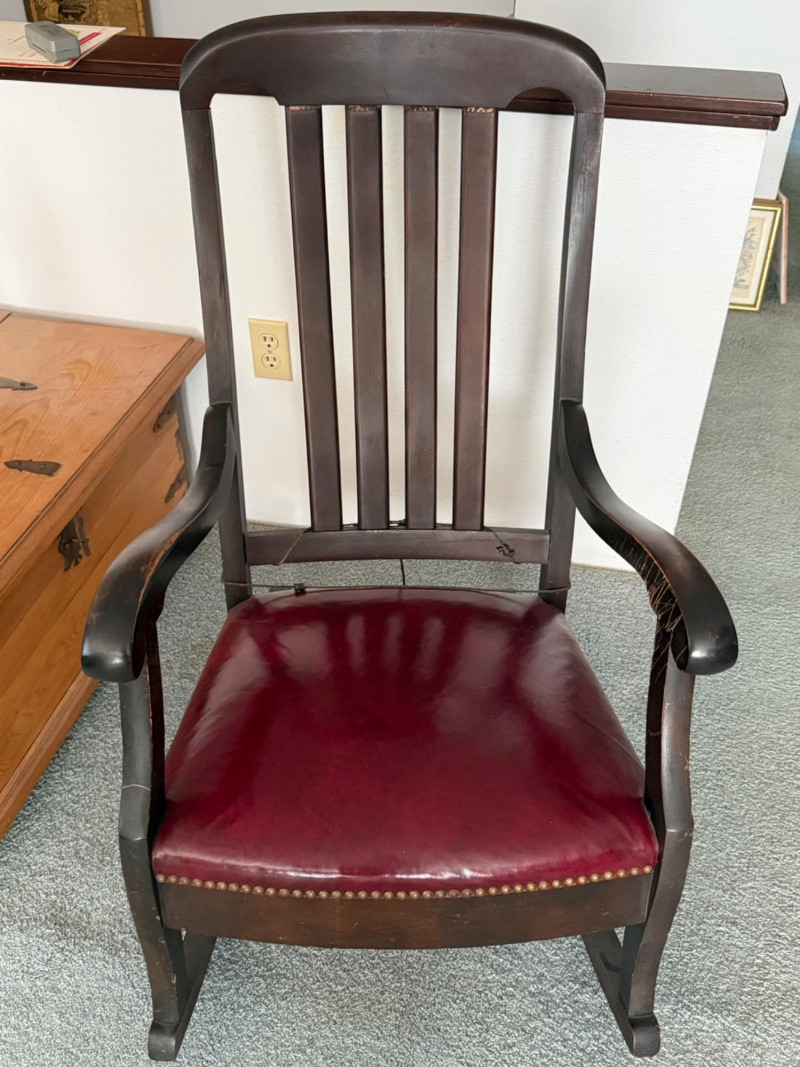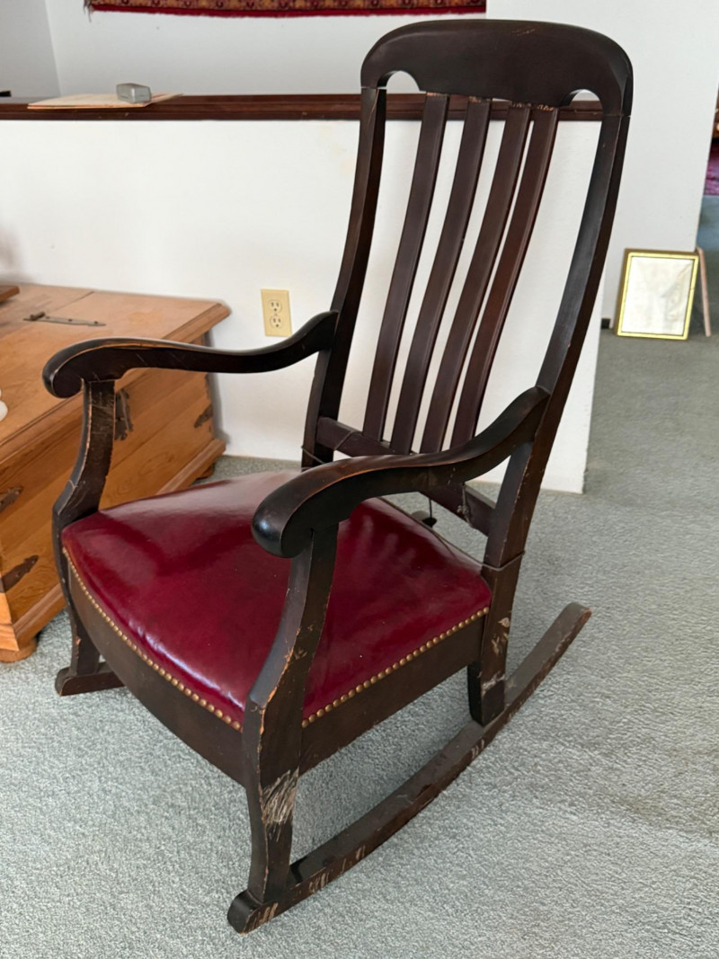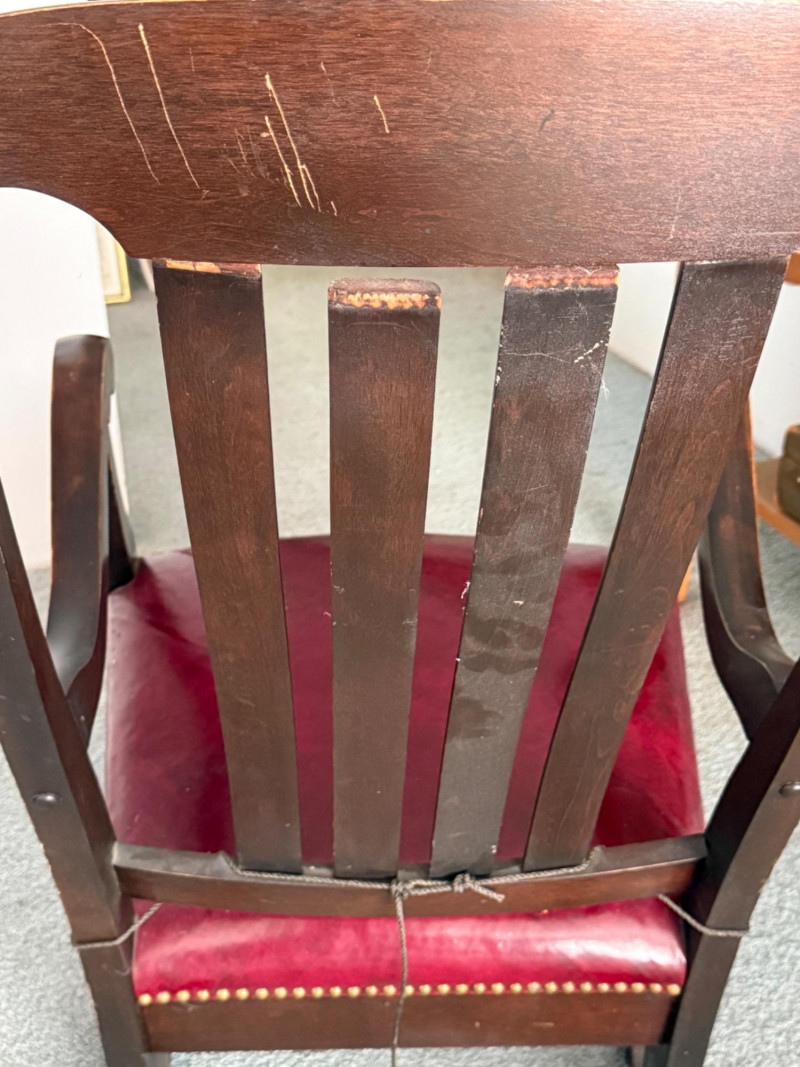 Vintage Spindle Back Rocking Chair Red leather studded seat Dark stained wood Spindles need to be reattached on back. See pics 23x30x39.5”