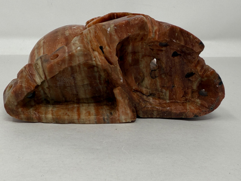 Soapstone carving in a soft red is 6x4x6” Has some white candle wax drippings that can be cleaned off.