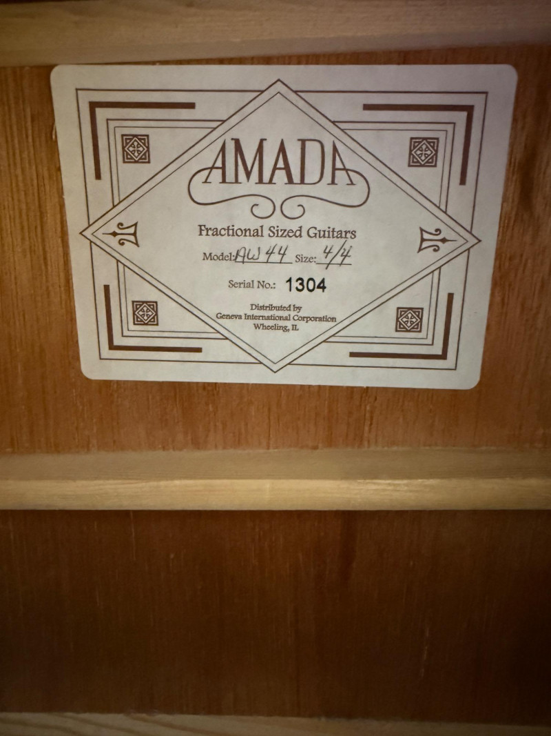 Amada AW44 Fractional Size 4/4 Guitar in protective padded carry case. This guitar is in excellent visual condition. Serial number 1404 Geneva International Corporation, Wheeling, IL