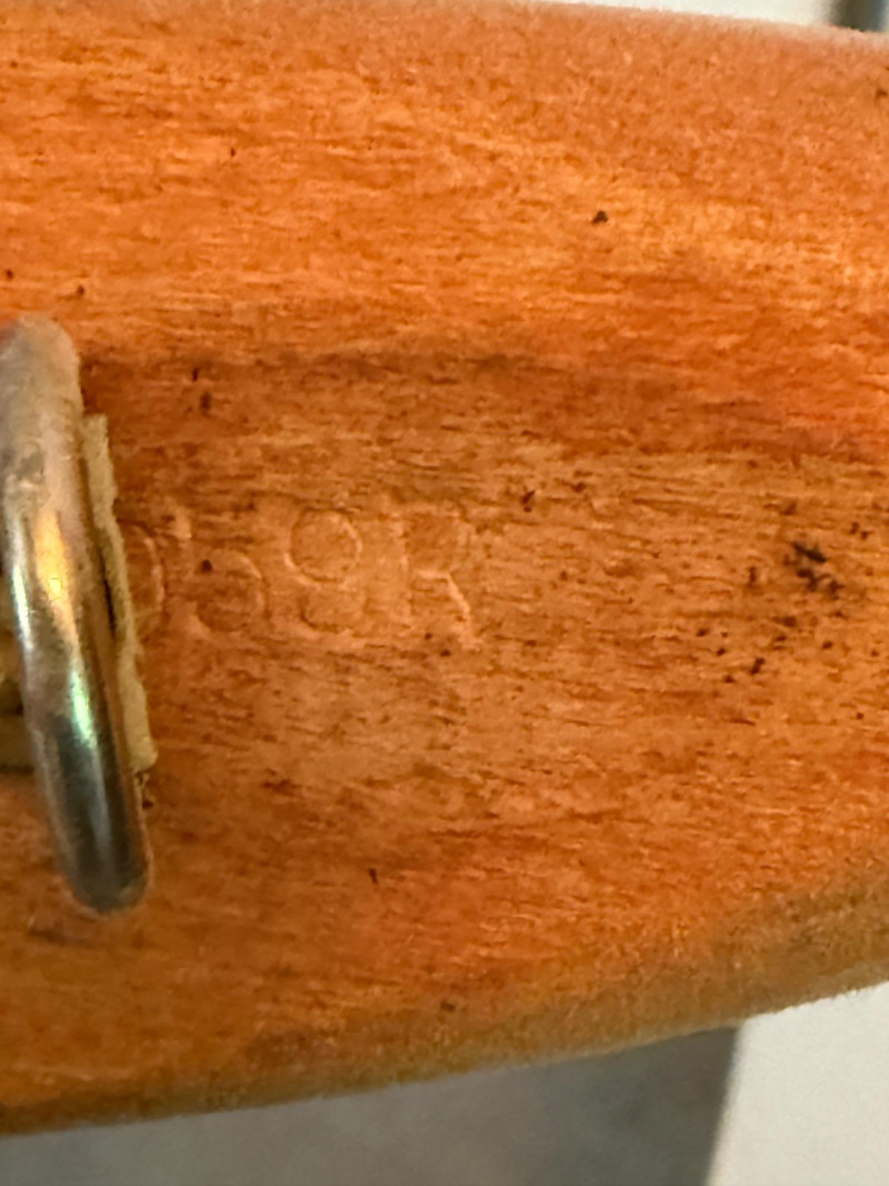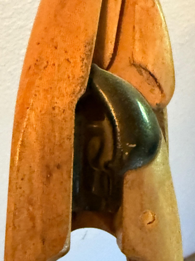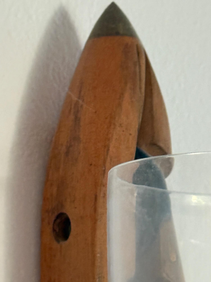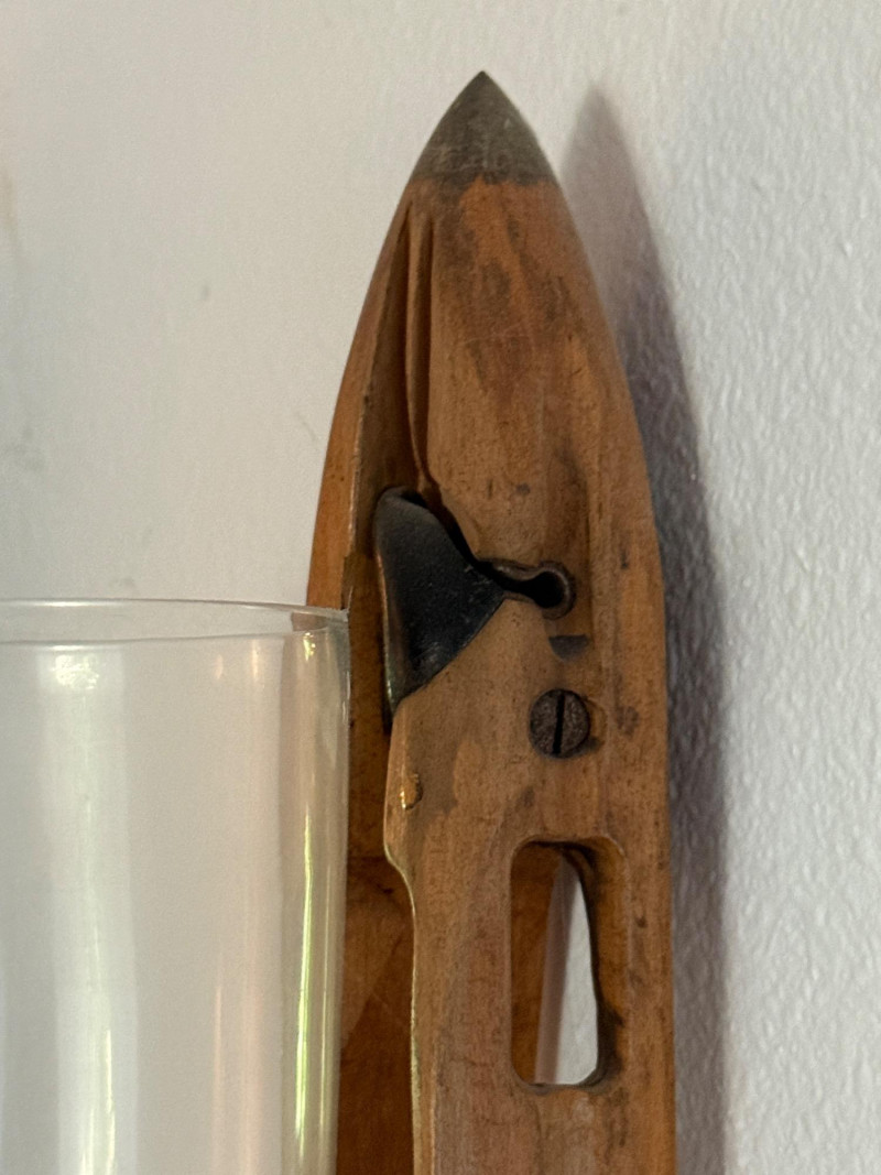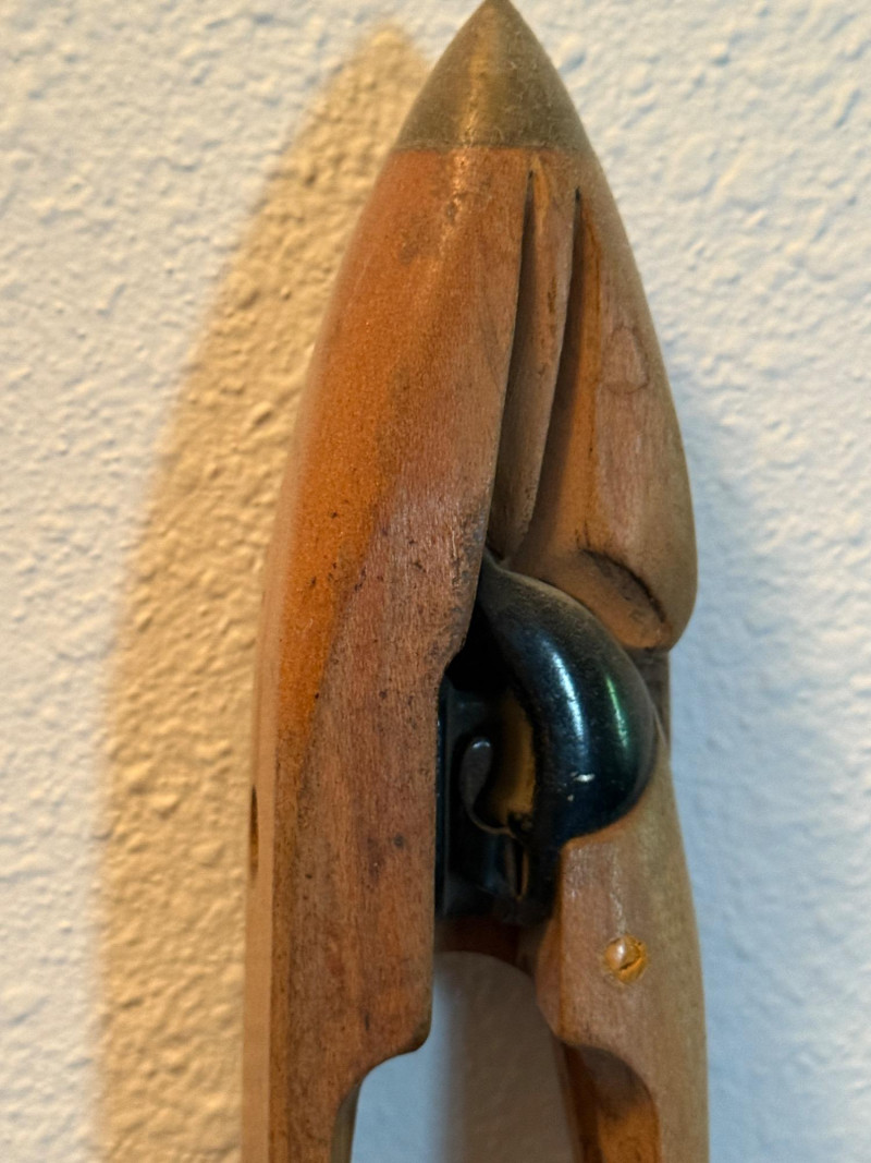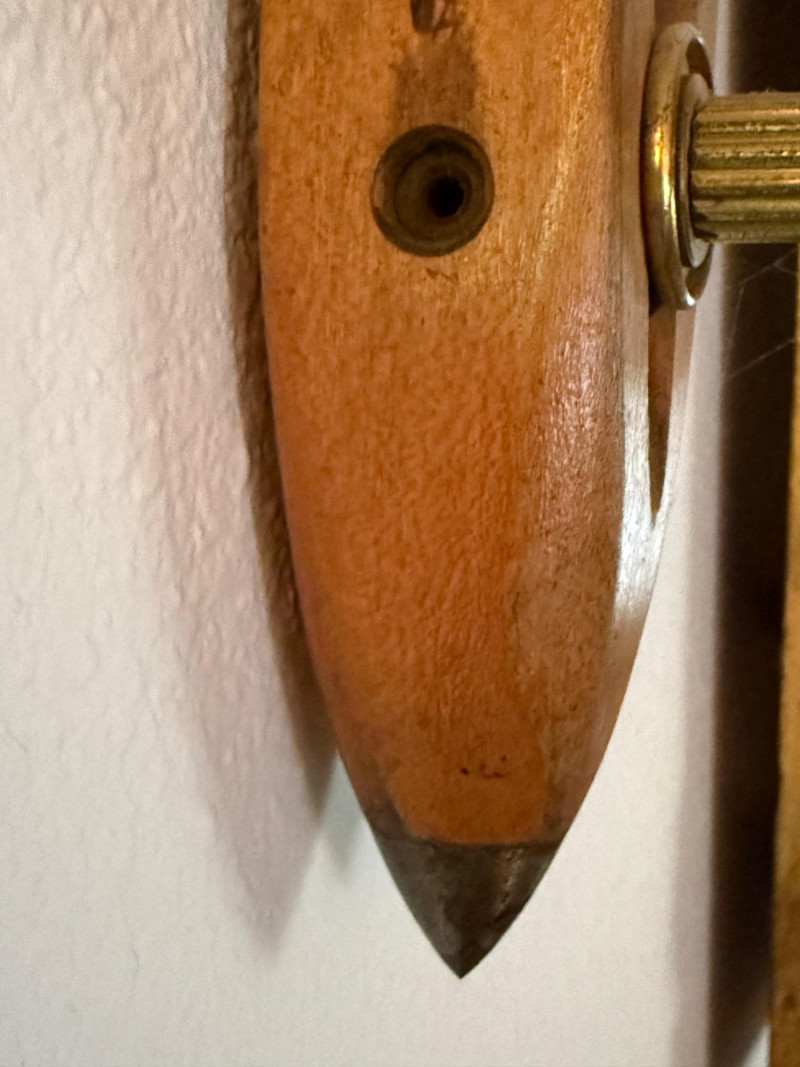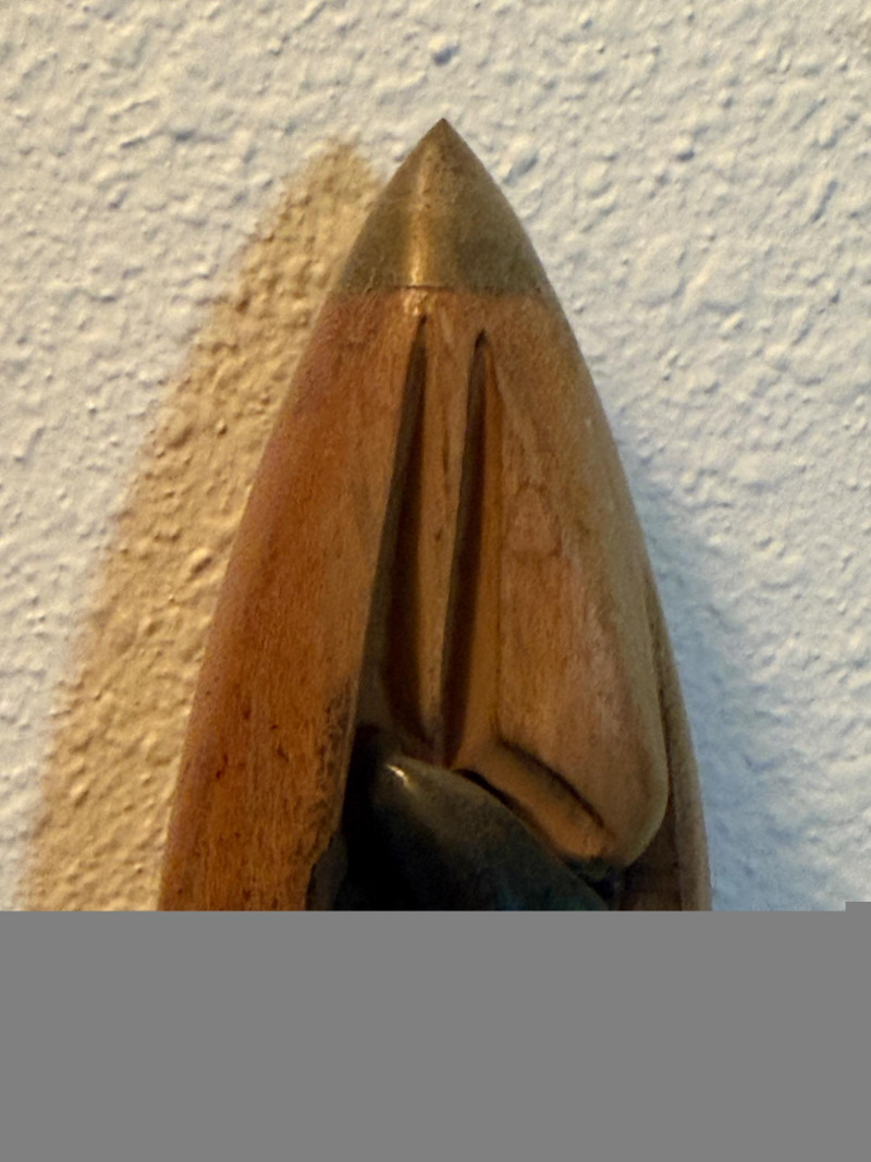Wood with metal tips and black decorative insert at top.