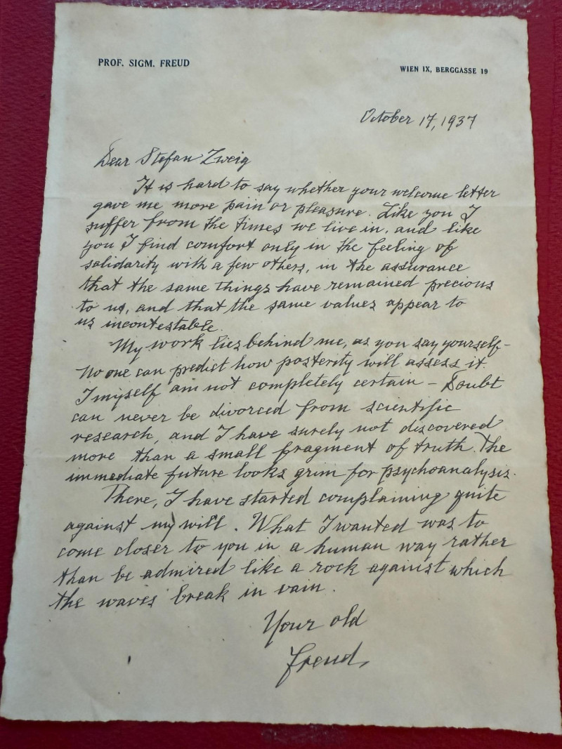 A 1937 handwritten letter from Sigmund Freud to Stefan Zweig (a prominent author in 1920-30’s i.e. Charles Dickens)
