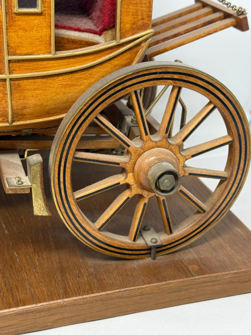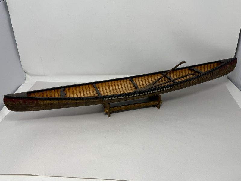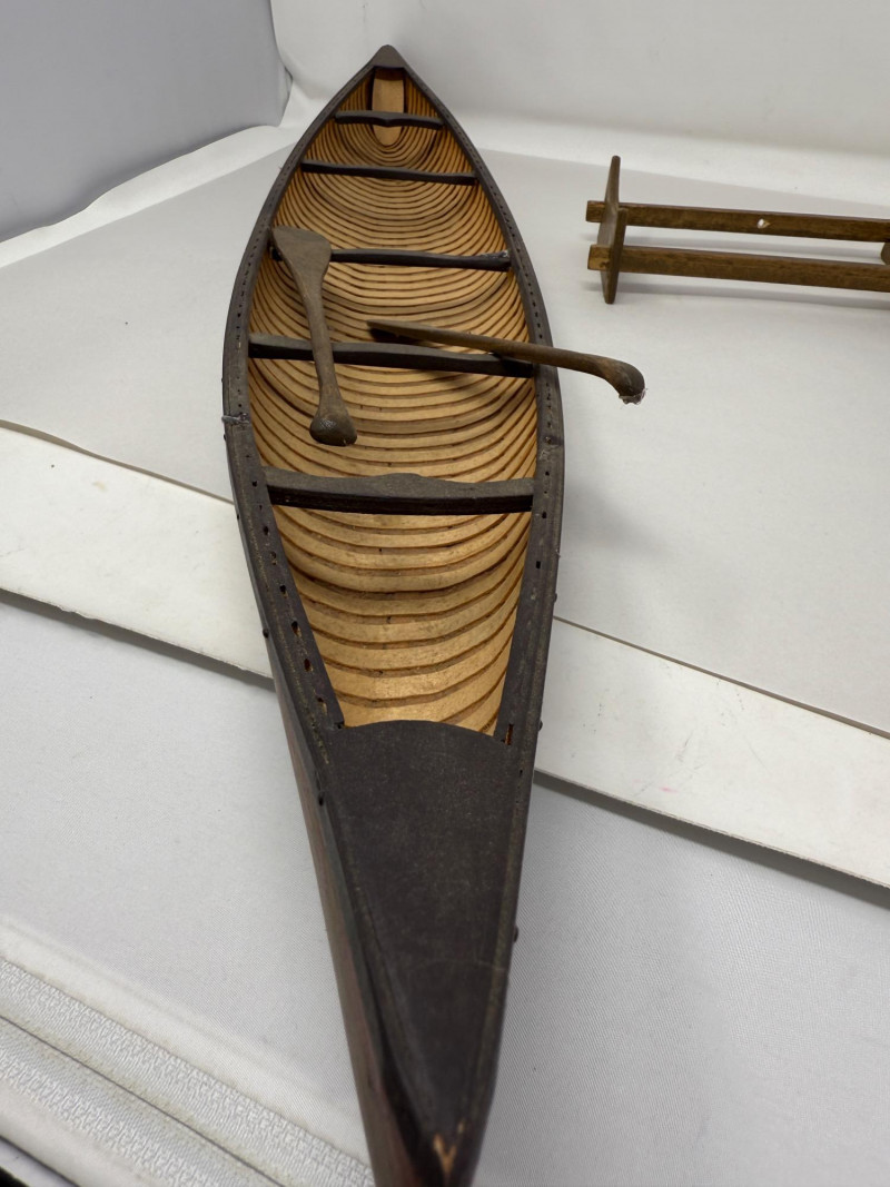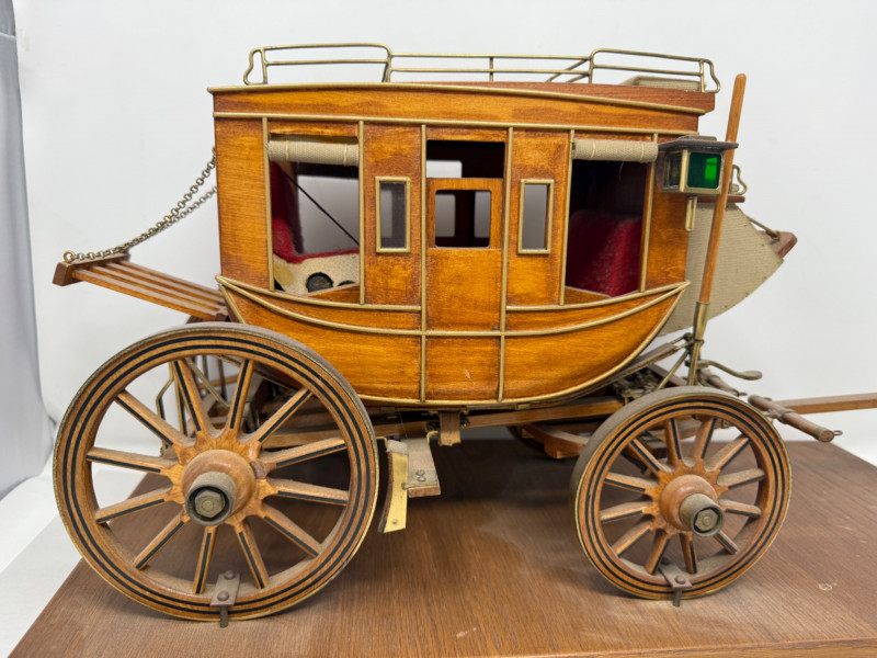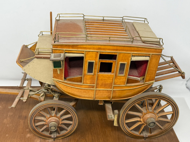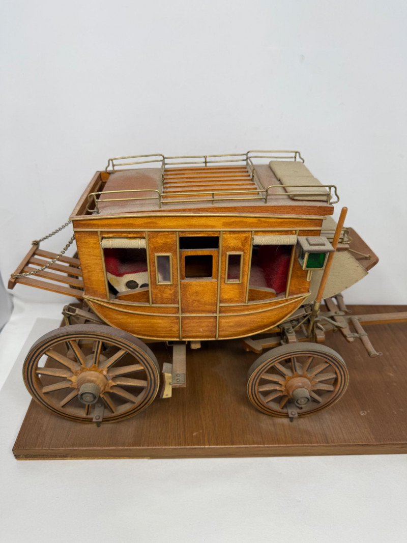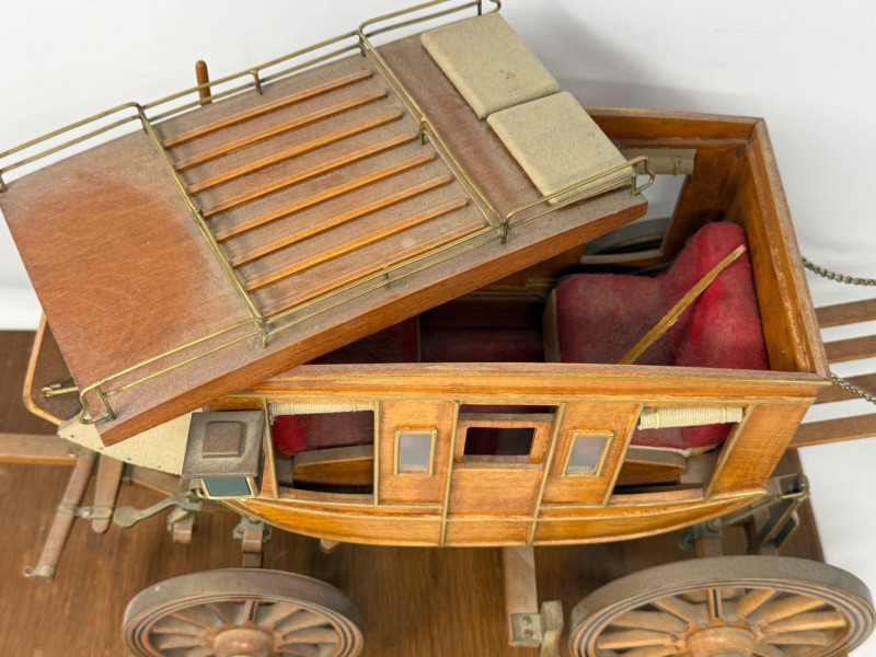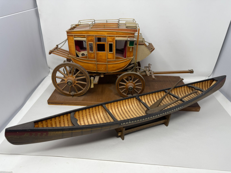 Handcrafted Stagecoach and Canoe Canoe is 27.5x4.5” on stand Stagecoach is attached to a 21”x9.5” board. All hinges and mechanisms work. Extreme detail.