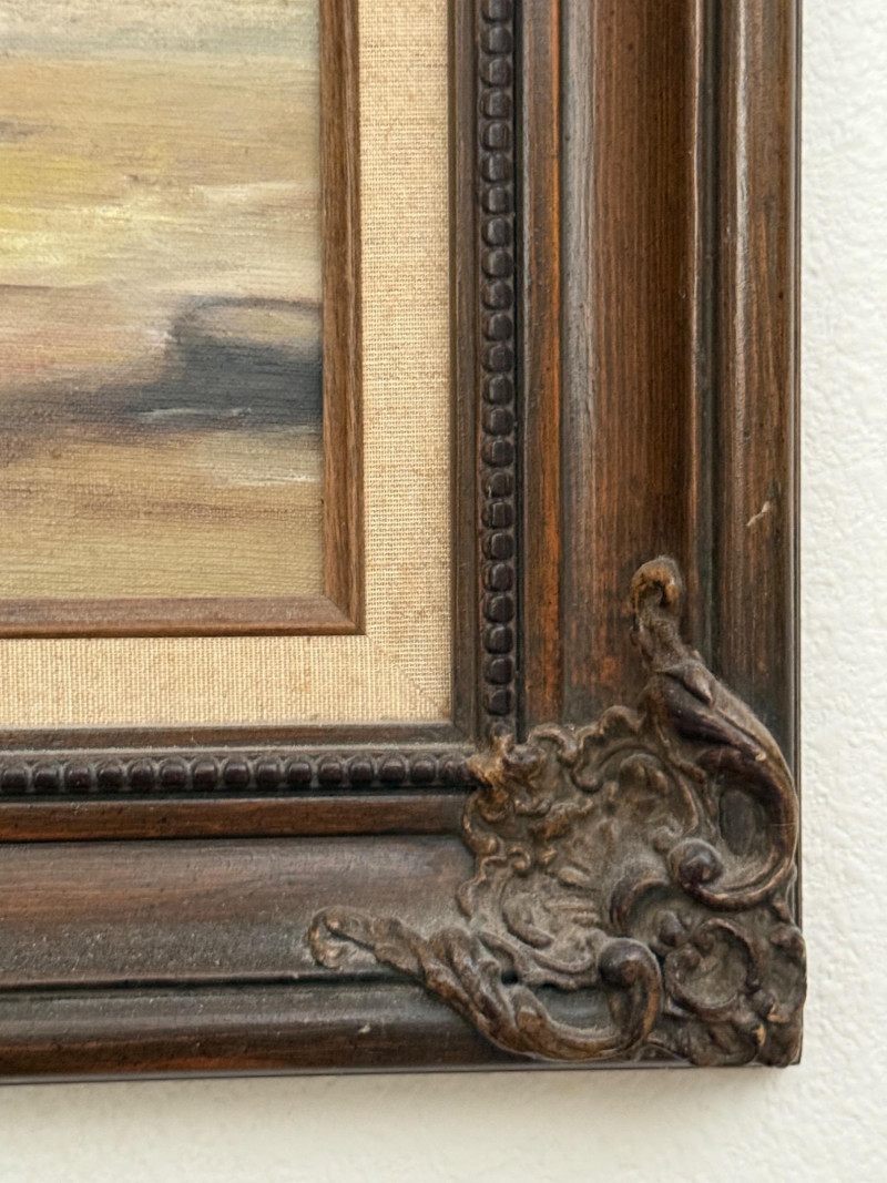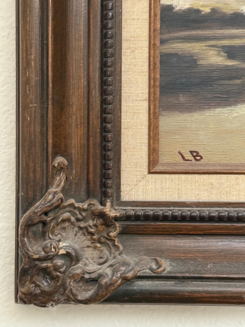 Original oil on canvas board in ornate wood frame from Mexico. signed LB. 16x20 canvas and 19x22.5” framed