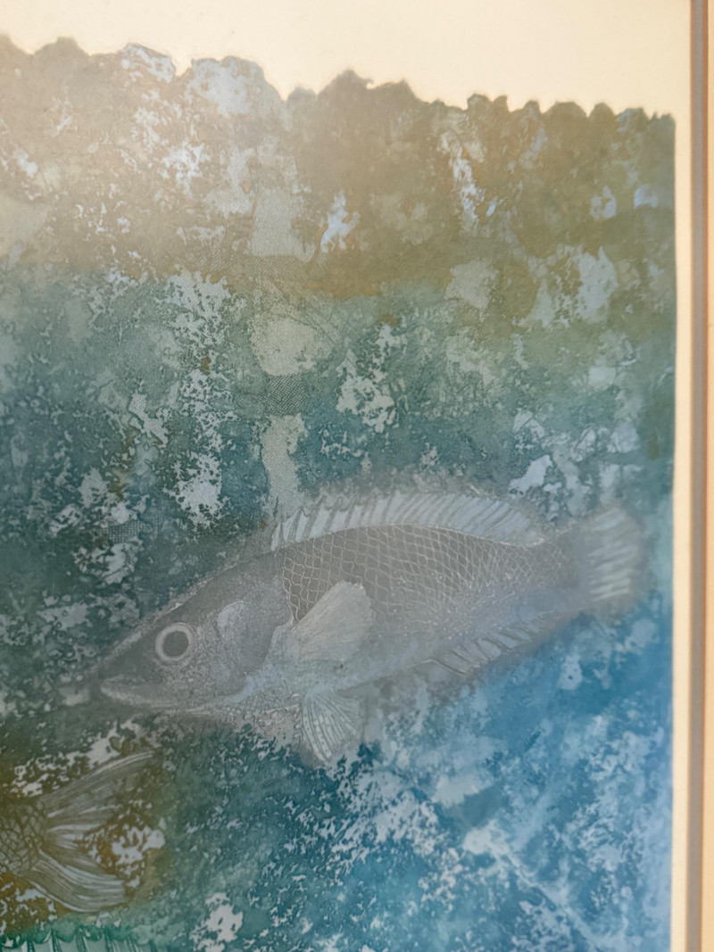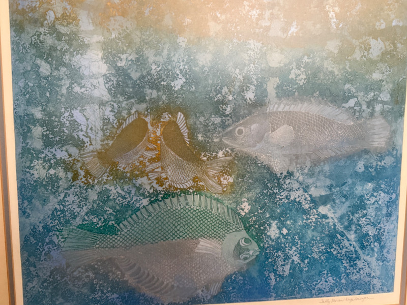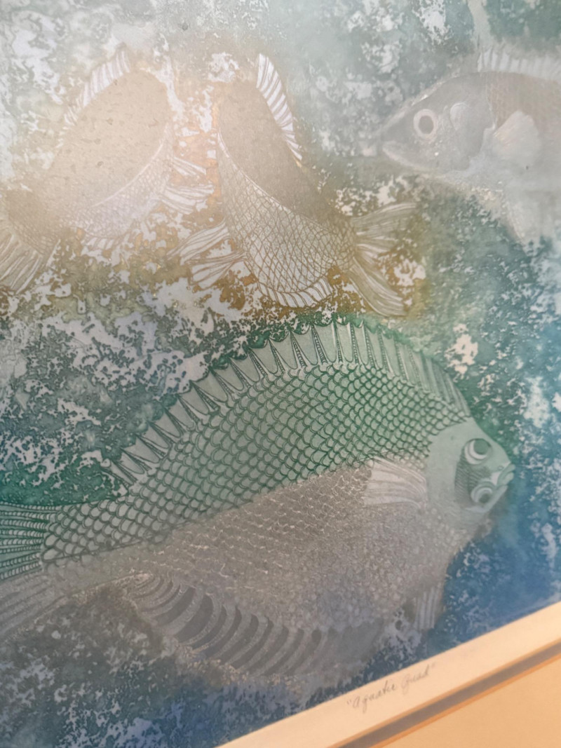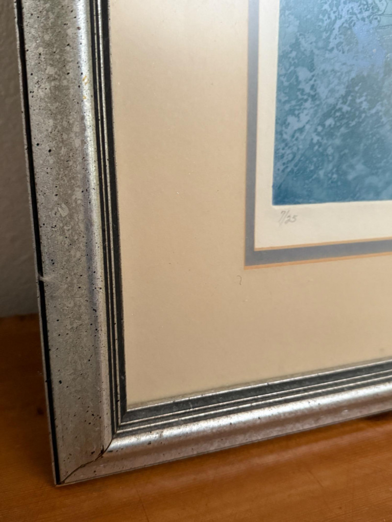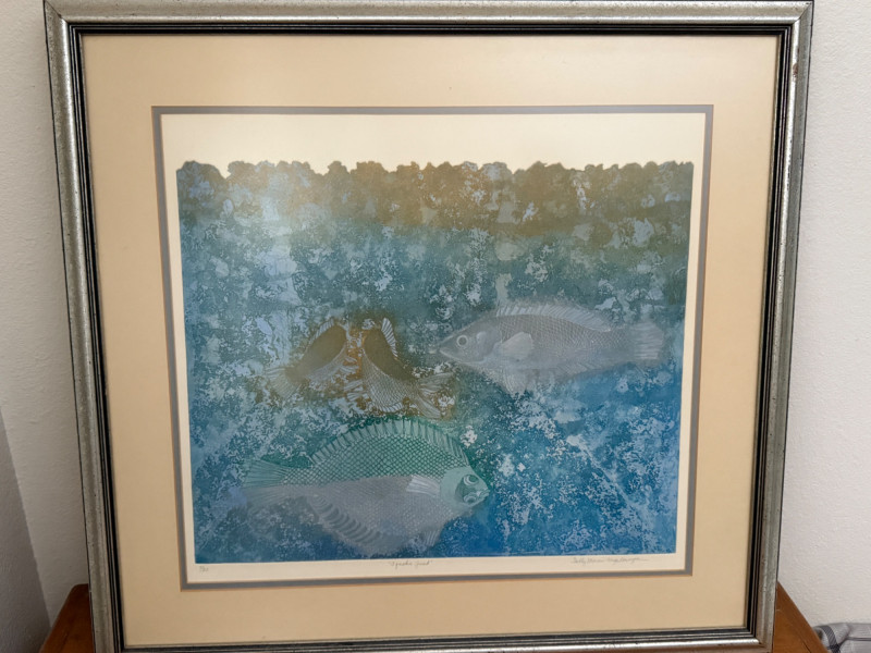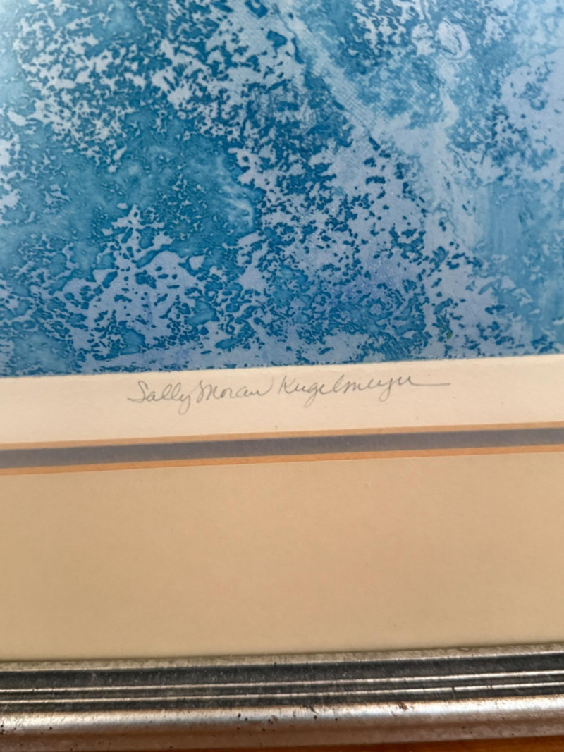 “Aquatic Quad” L/E 7/25 Signed Art Sally Moran Kugelmeyer double matted in mottled silver frame under glass. 28x26”