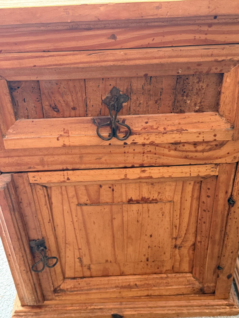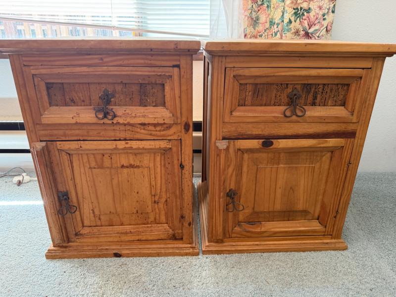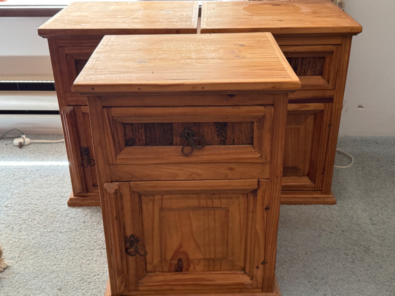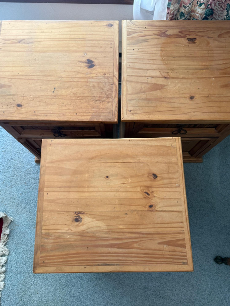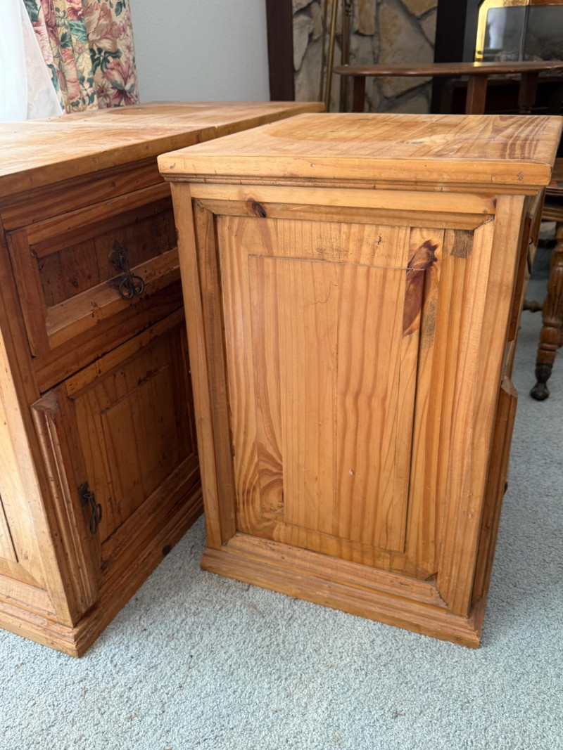 (3) Mexican Pine Bedside Tables One has unaddressed splashes and possible staining. See pics. 18x16x24”