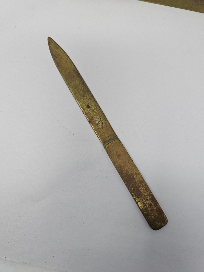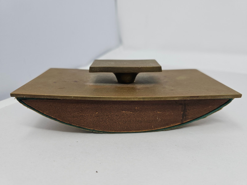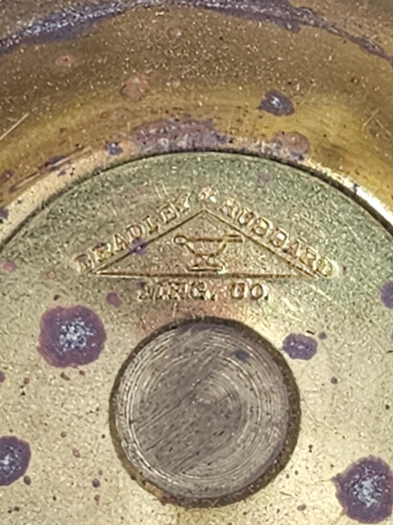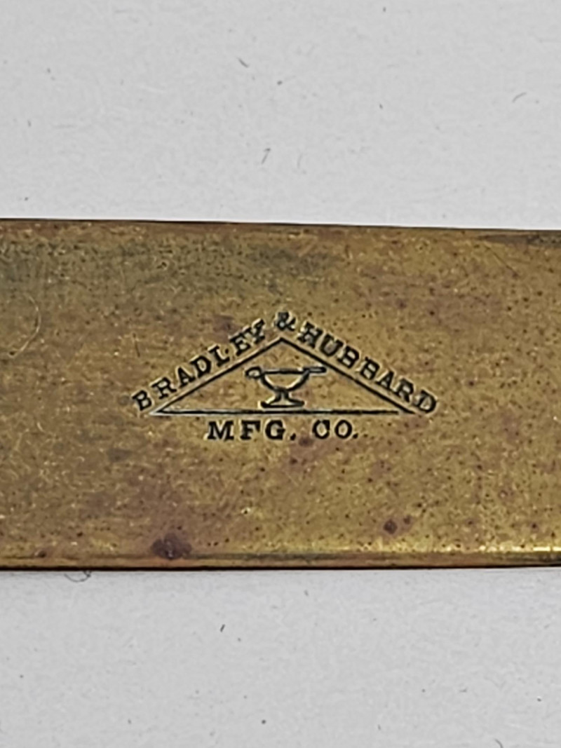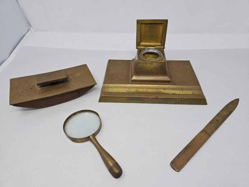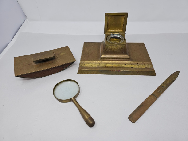 Bradley & Hubbard Brass Inkwell Set Bradley & Hubbard inkwells were popular desk accessories during the late 1800s & early 1900s, reflecting the Victorian era's emphasis on elaborate design and functional elegance. The company's attention to detail and use of durable materials ensured that their pieces were both beautiful and long-lasting. Includes brass inkwell, glass inkwell cup, brass magnifying glass, brass letter opener, and brass & wood ink blotter