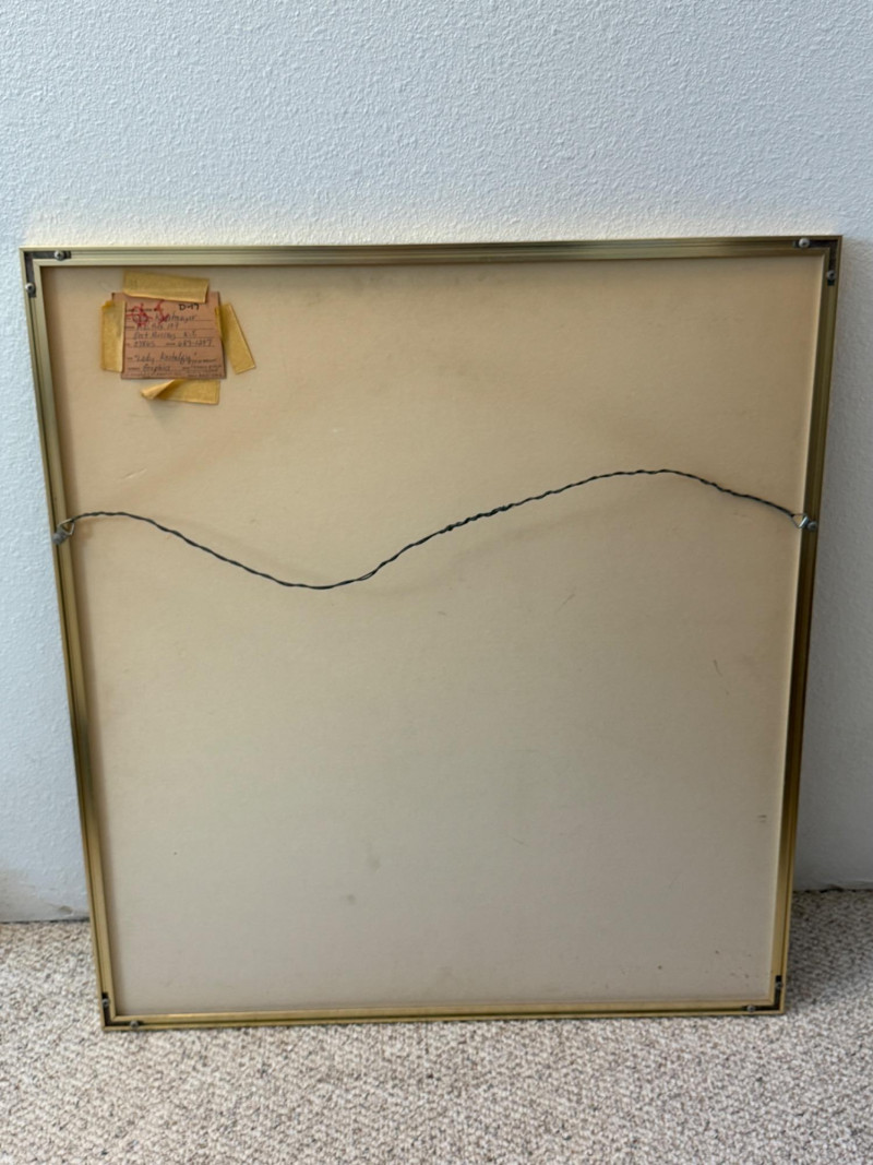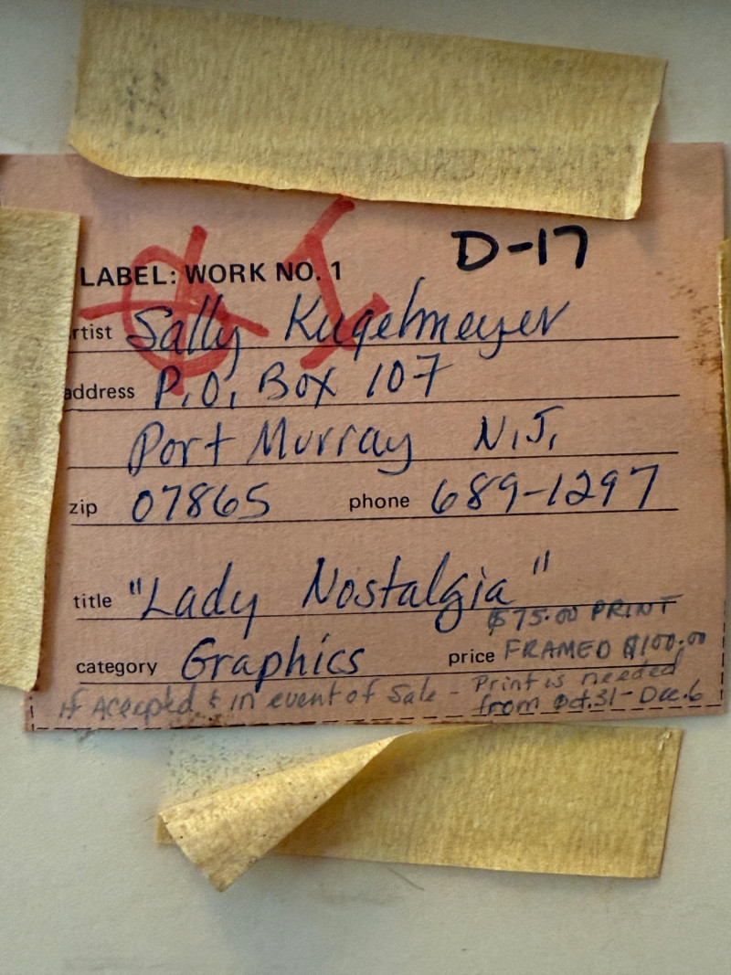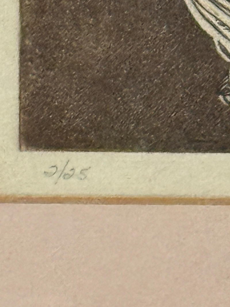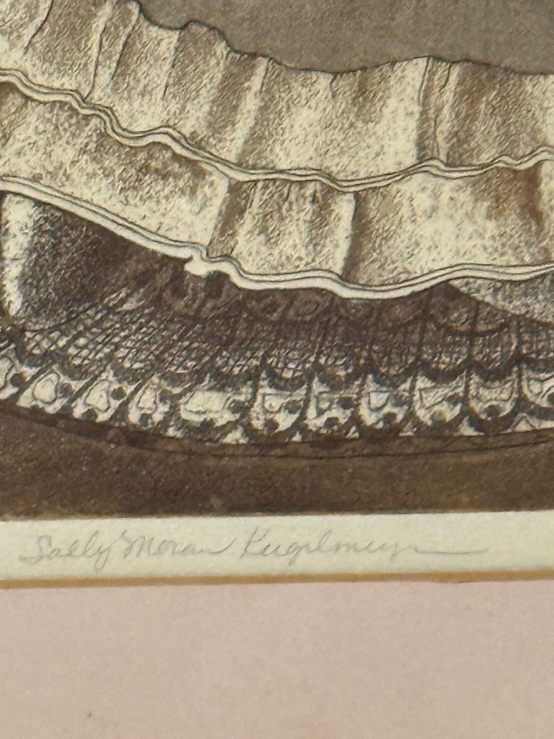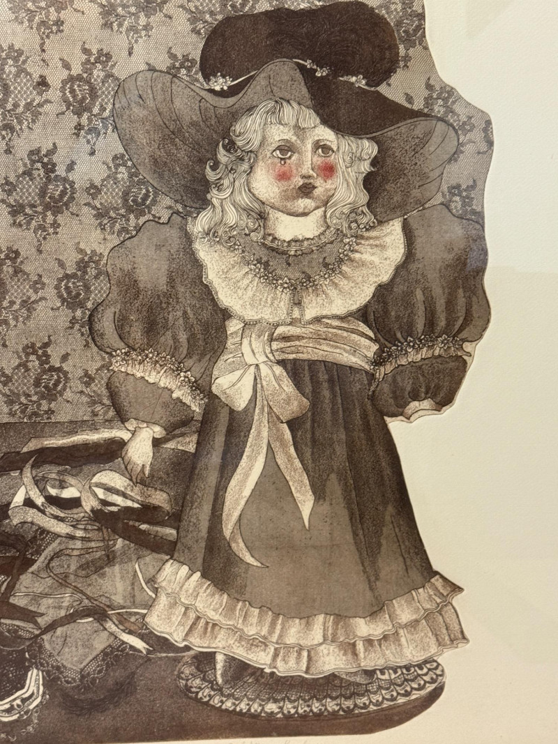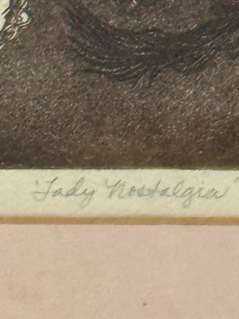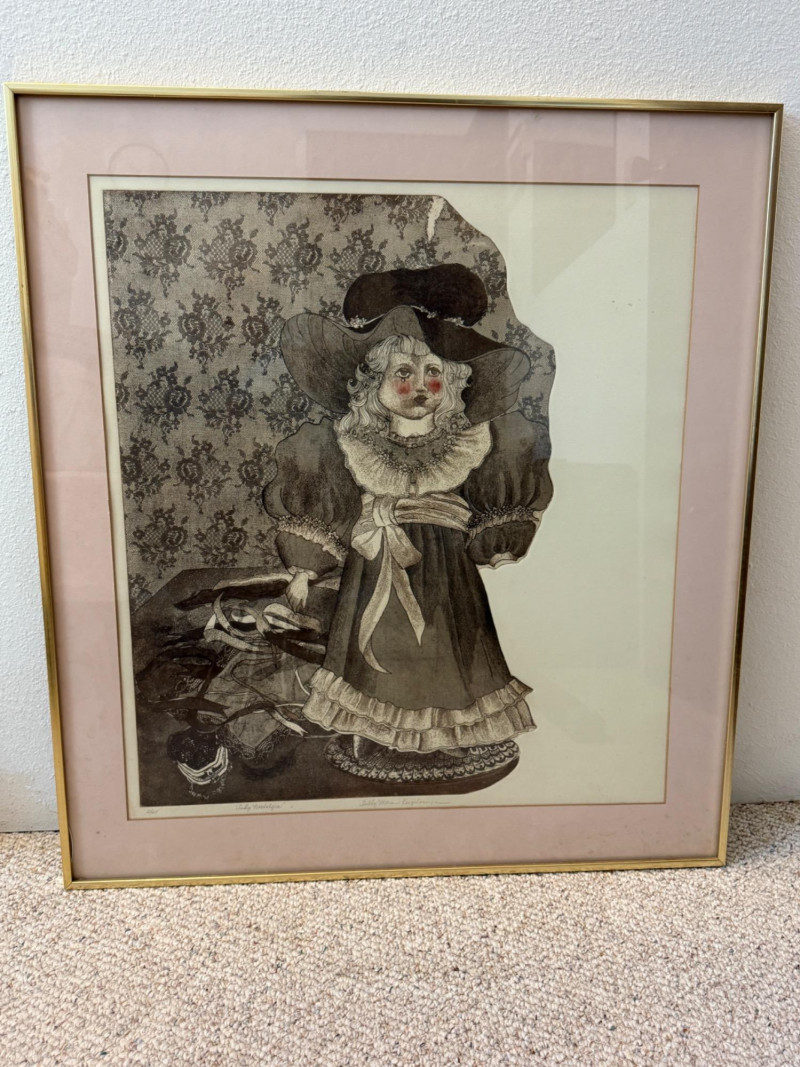 “Lady Nostalgia” L/E 2/25 by Sally Moran Kugelmeyer. Black and white with rosy cheeks, pink matting, gold metal frame under glass. Frame could use some tightening. 27.5x30.75”