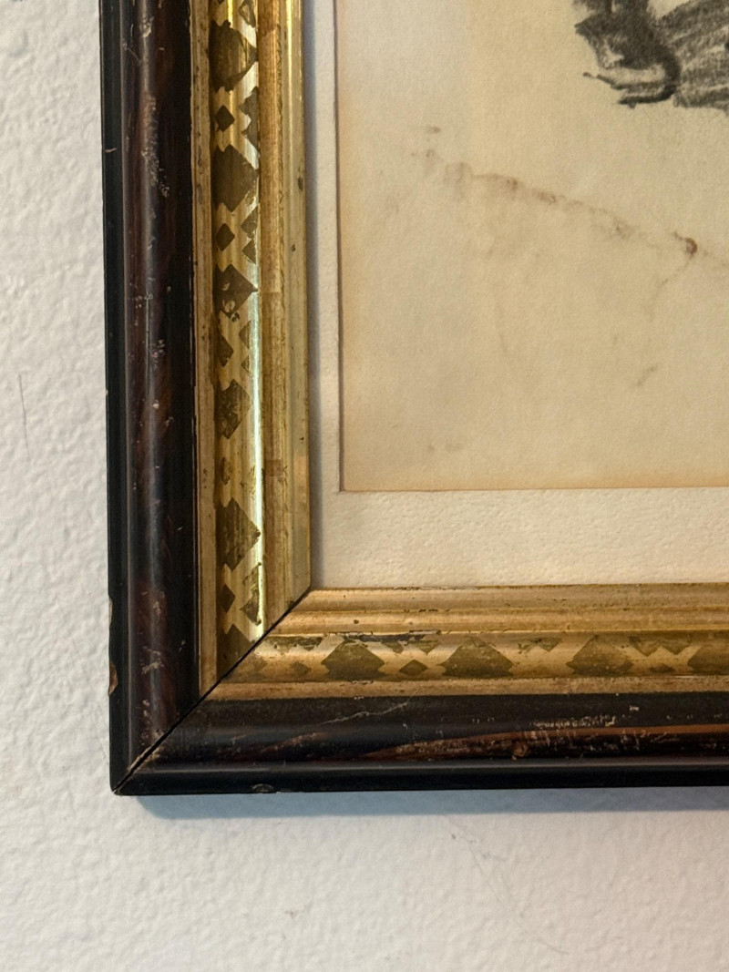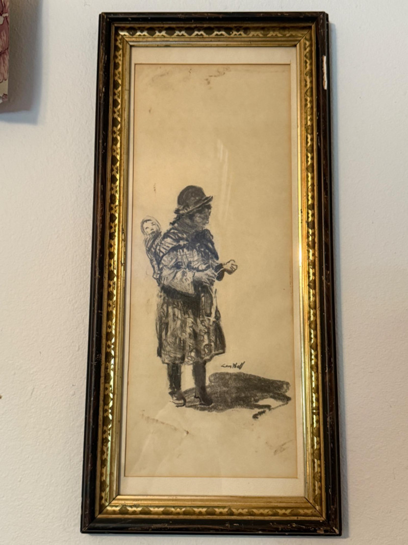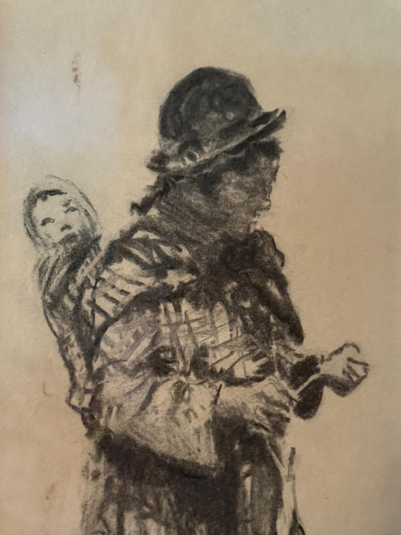 Woman Carrying Baby - Early 1900’s Charcoal Art by Campbell 11x23.5”
