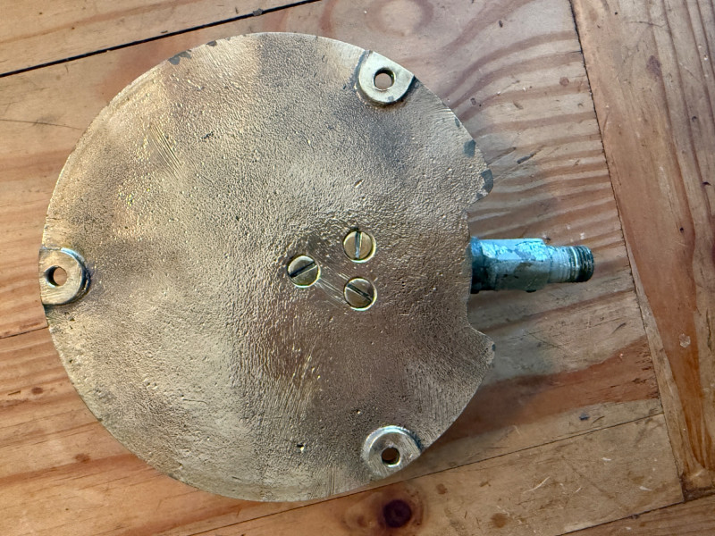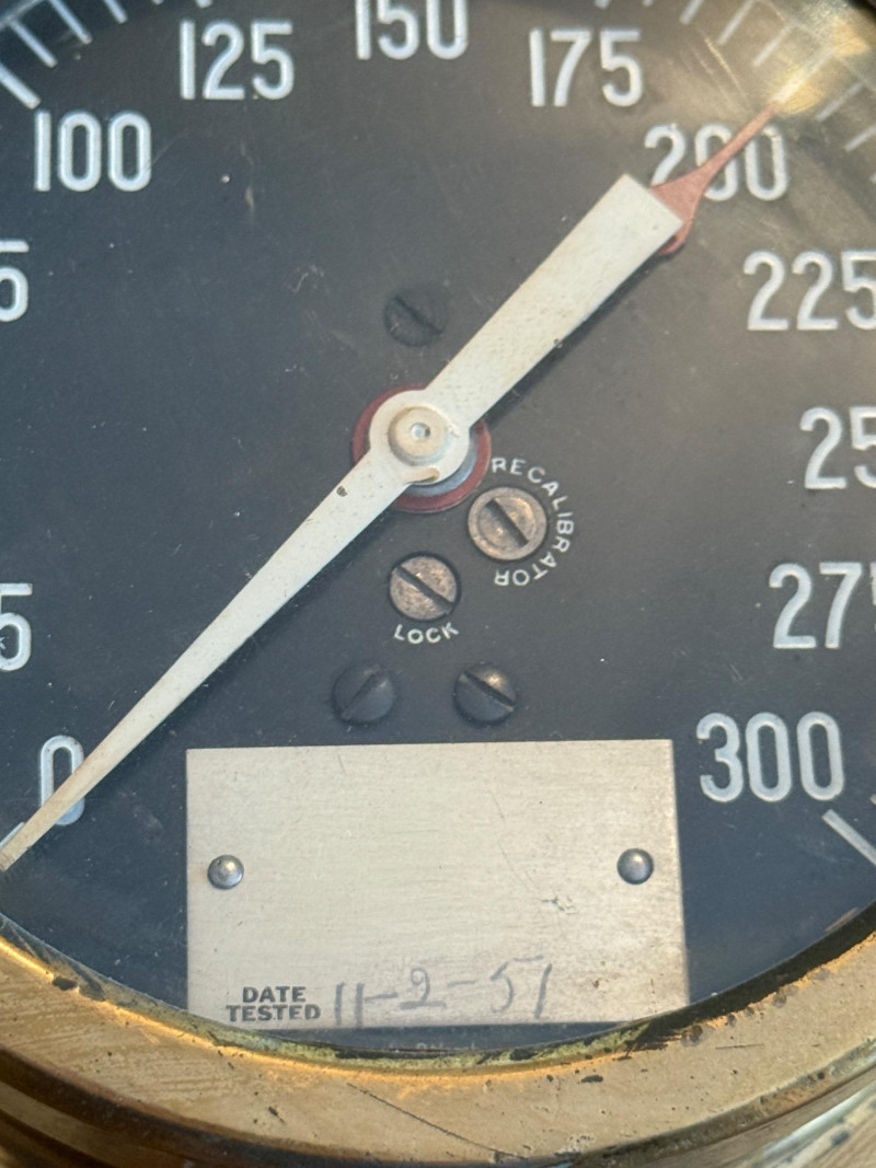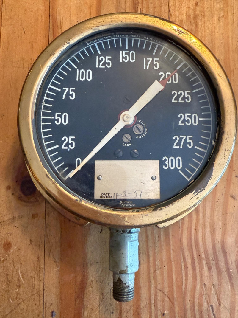 A pressure gauge, designed to measure pressure in a system, possibly a steam system on a ship or in an industrial setting, 300psi Jas P Marsh Corporation Chicago Brass Pressure Gauge Date tested 11-2-51 6x2x7.5”