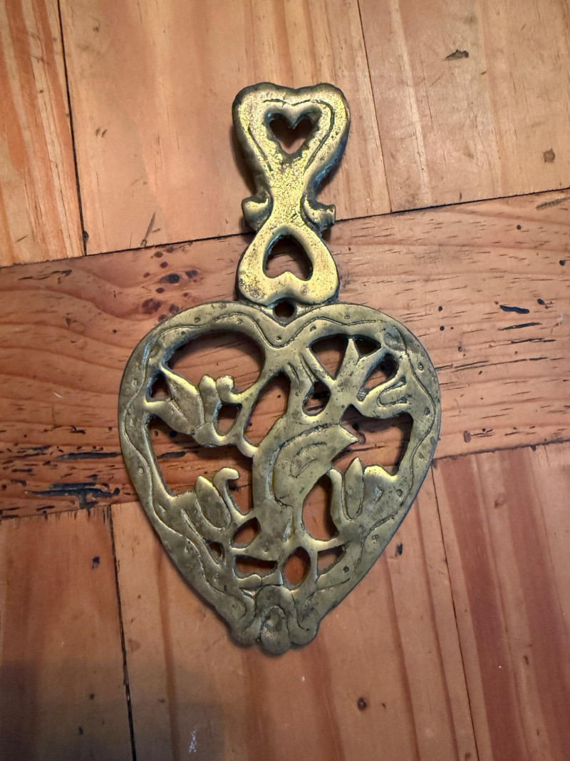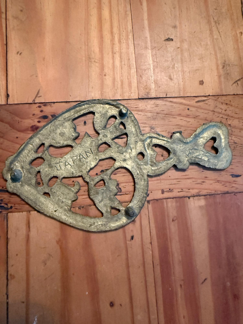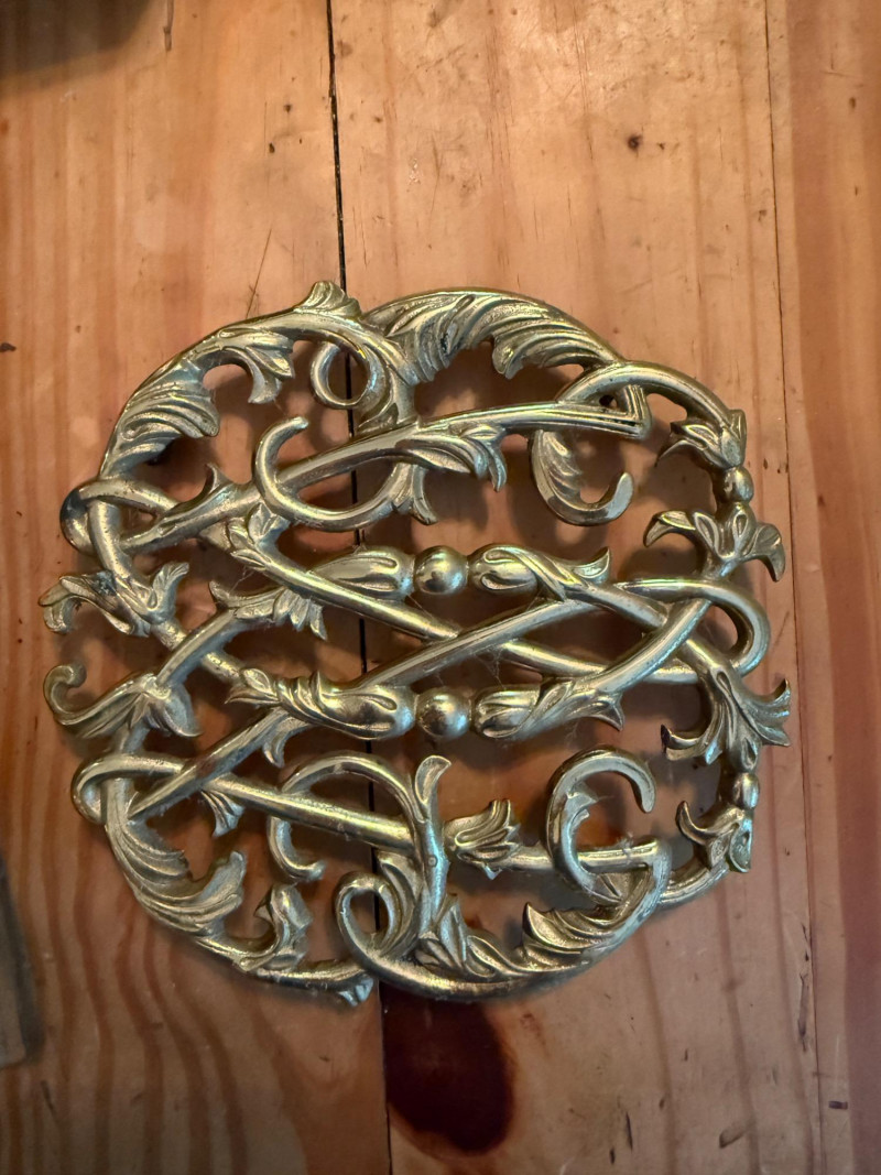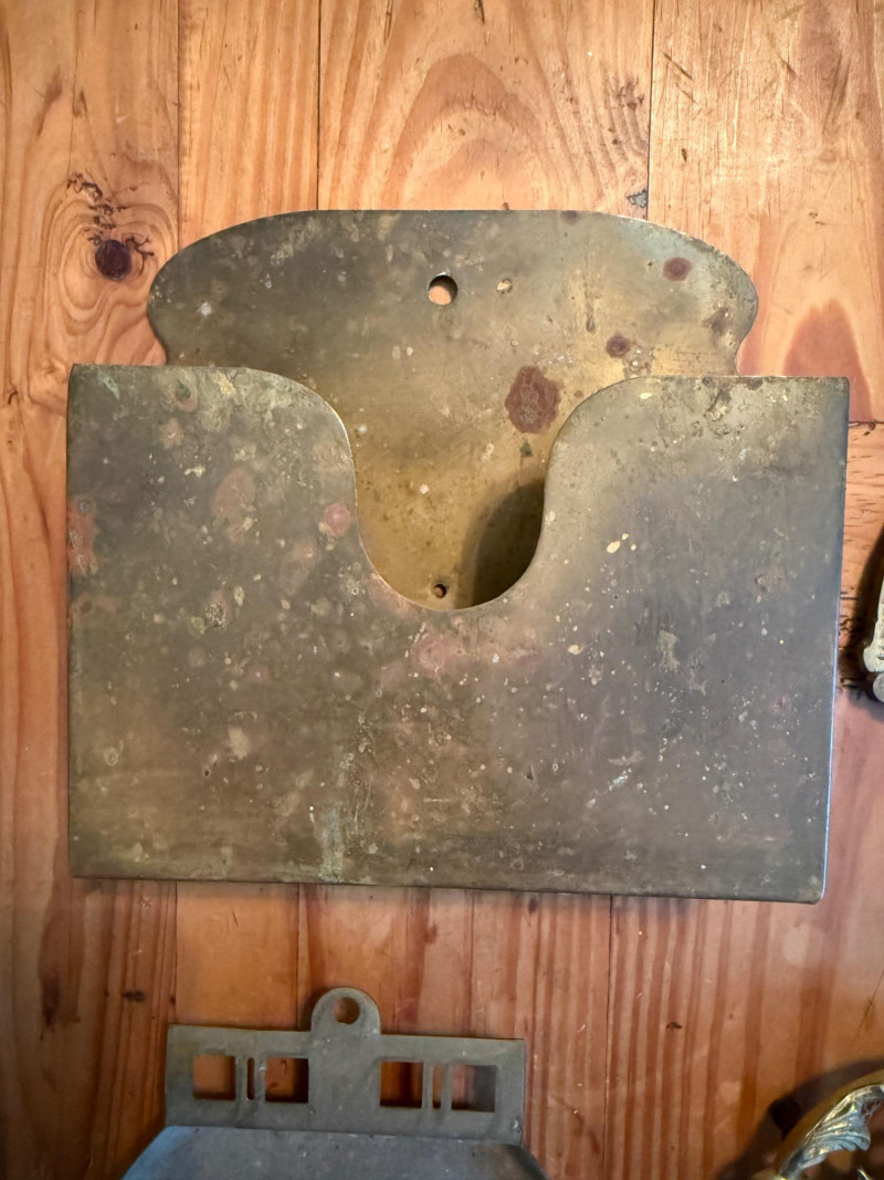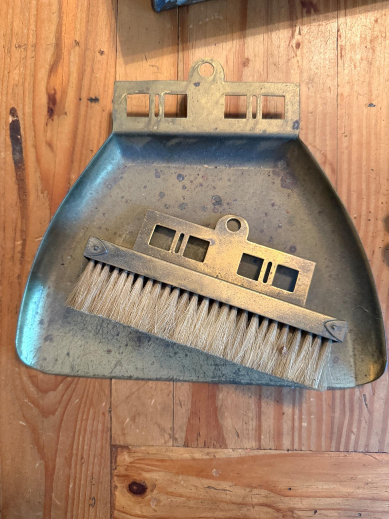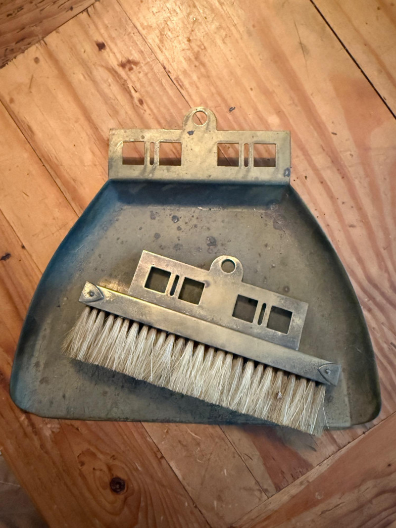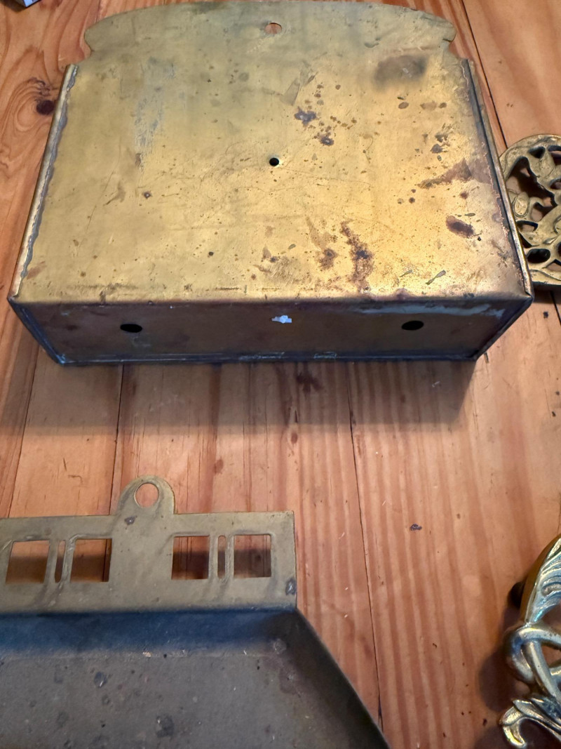Vintage Brass Butler Crumb Tray, Brush, Napkin Holder & Trivets Colonial Williamsburg Cypher CW 10-14 Copyright 1950 Brass Trivet 6” Crumb brush and tray. Tray is 8x7” Brass hanging box 7x7” Japanese trivet 4x7”