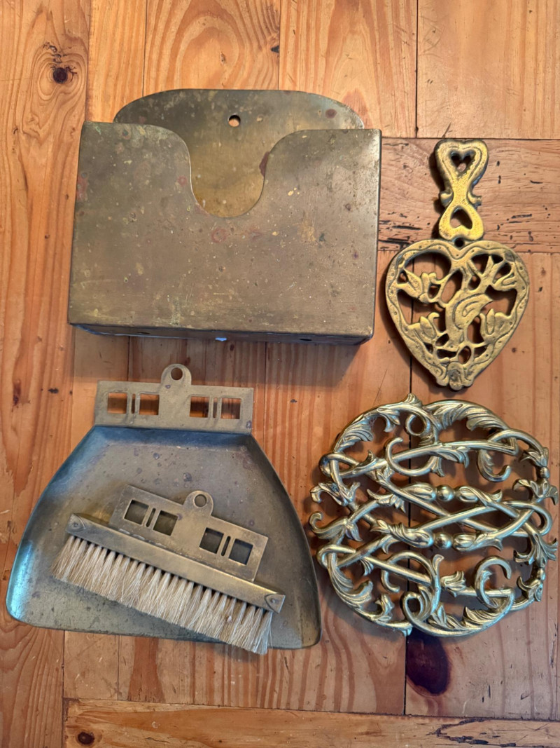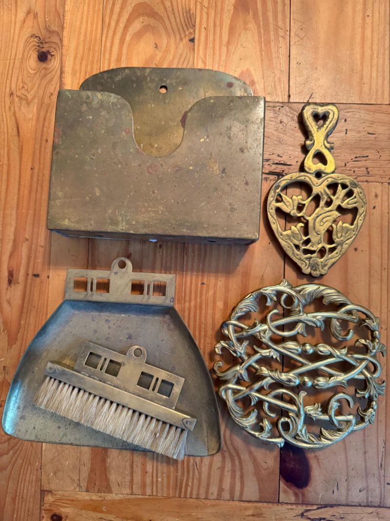 Lot # 78 - Vintage Brass Butler Crumb Tray, Brush, Napkin Holder & Trivets