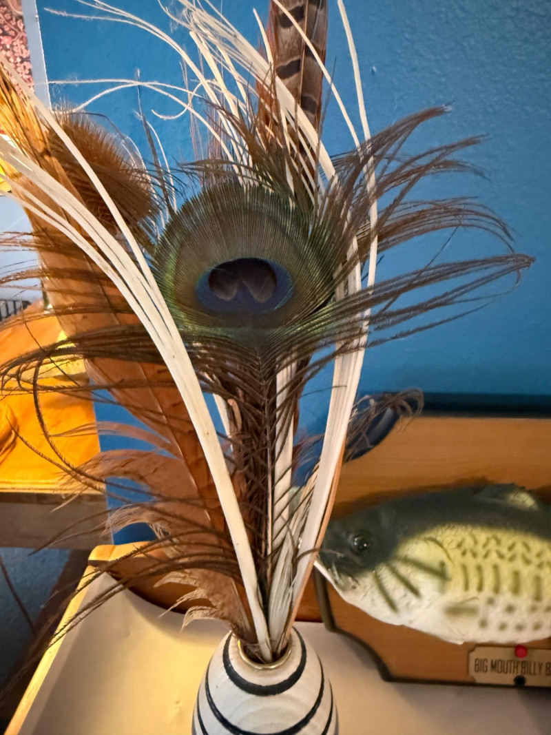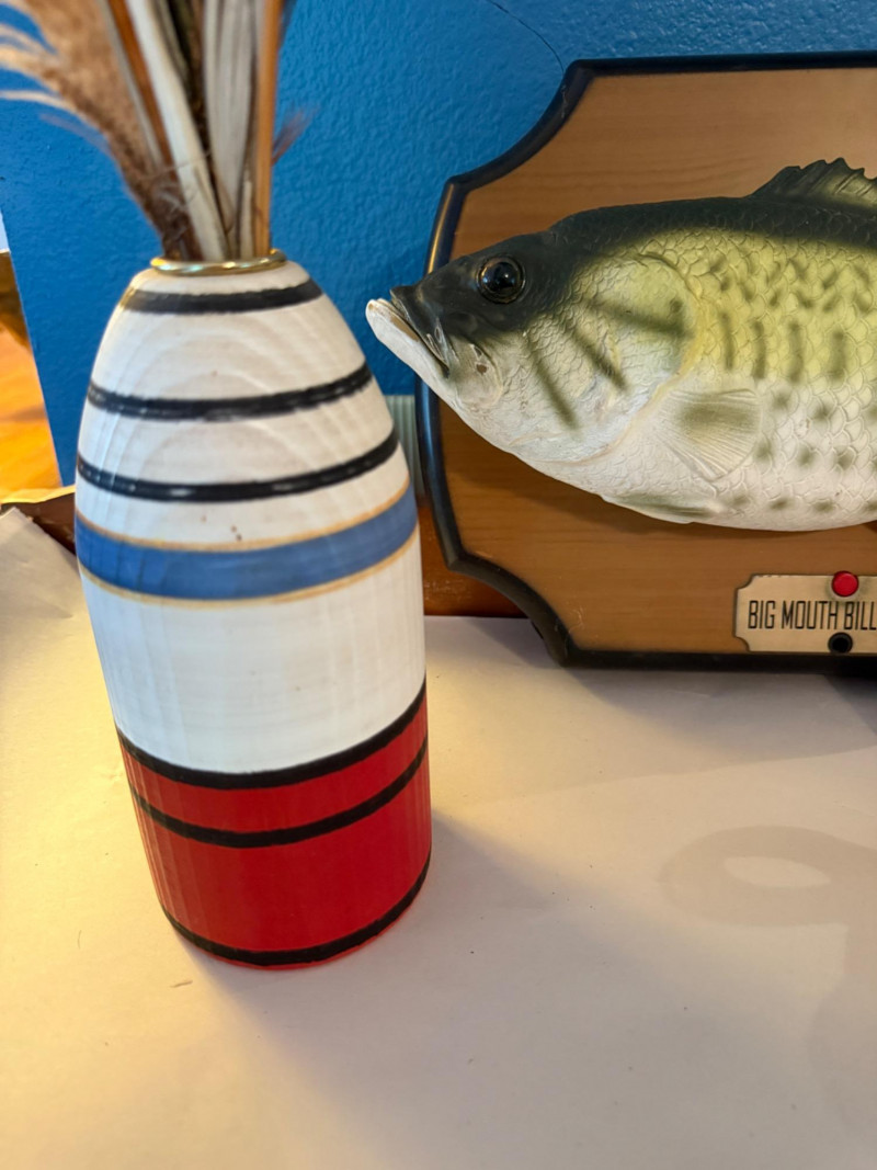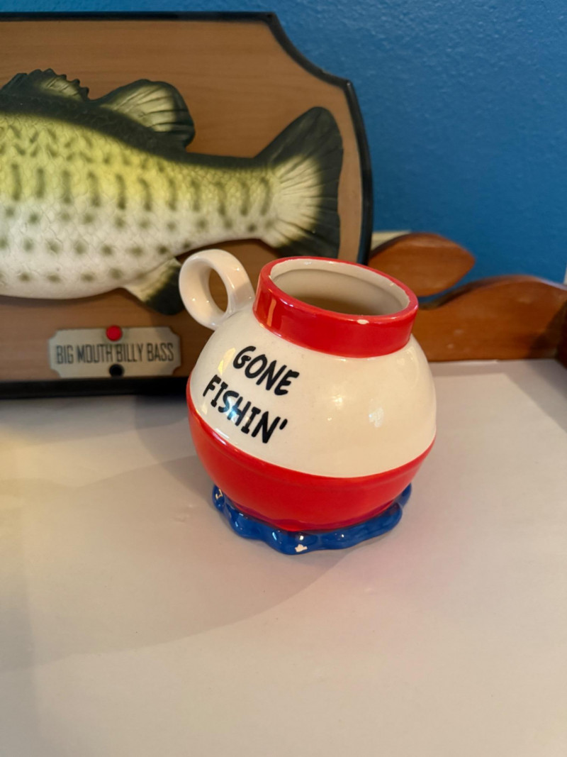 Big Mouth Billy Bass Animatronic Singing Fish with movement sensor. Gone Fishin’ bobber cup by Big Mouth Inc Hand made wood bouy with feathers and stick picks