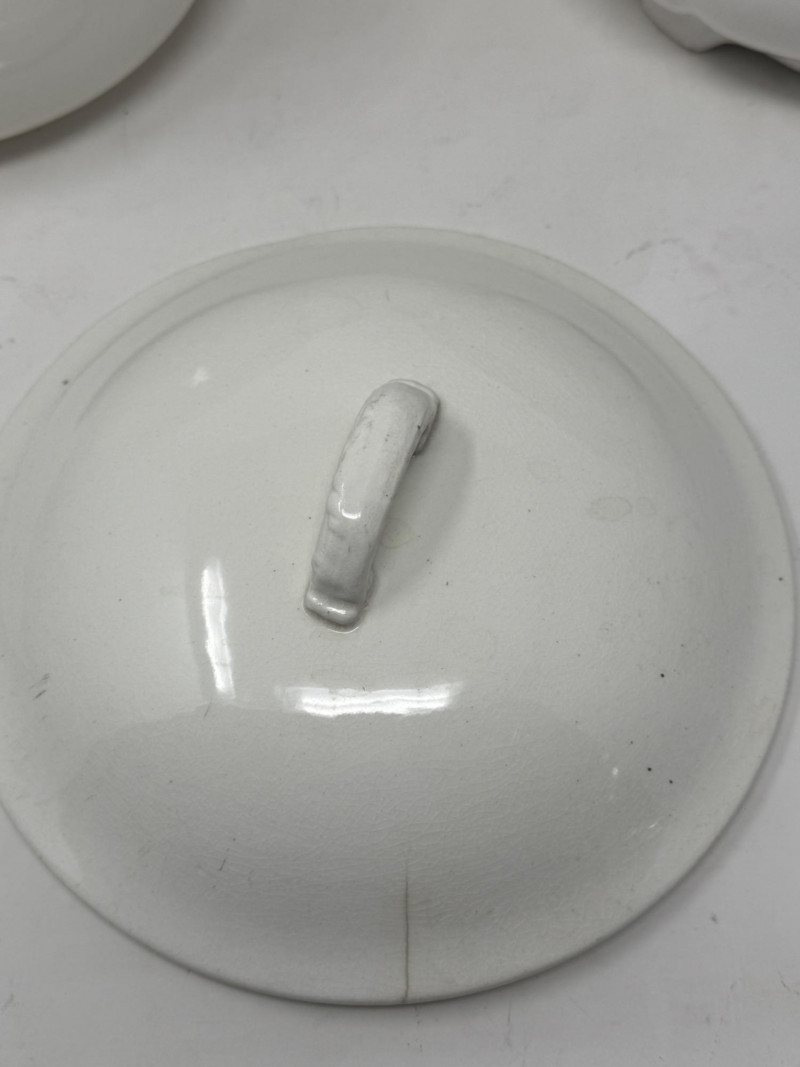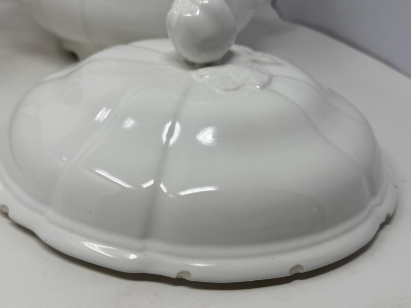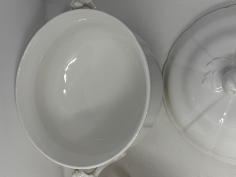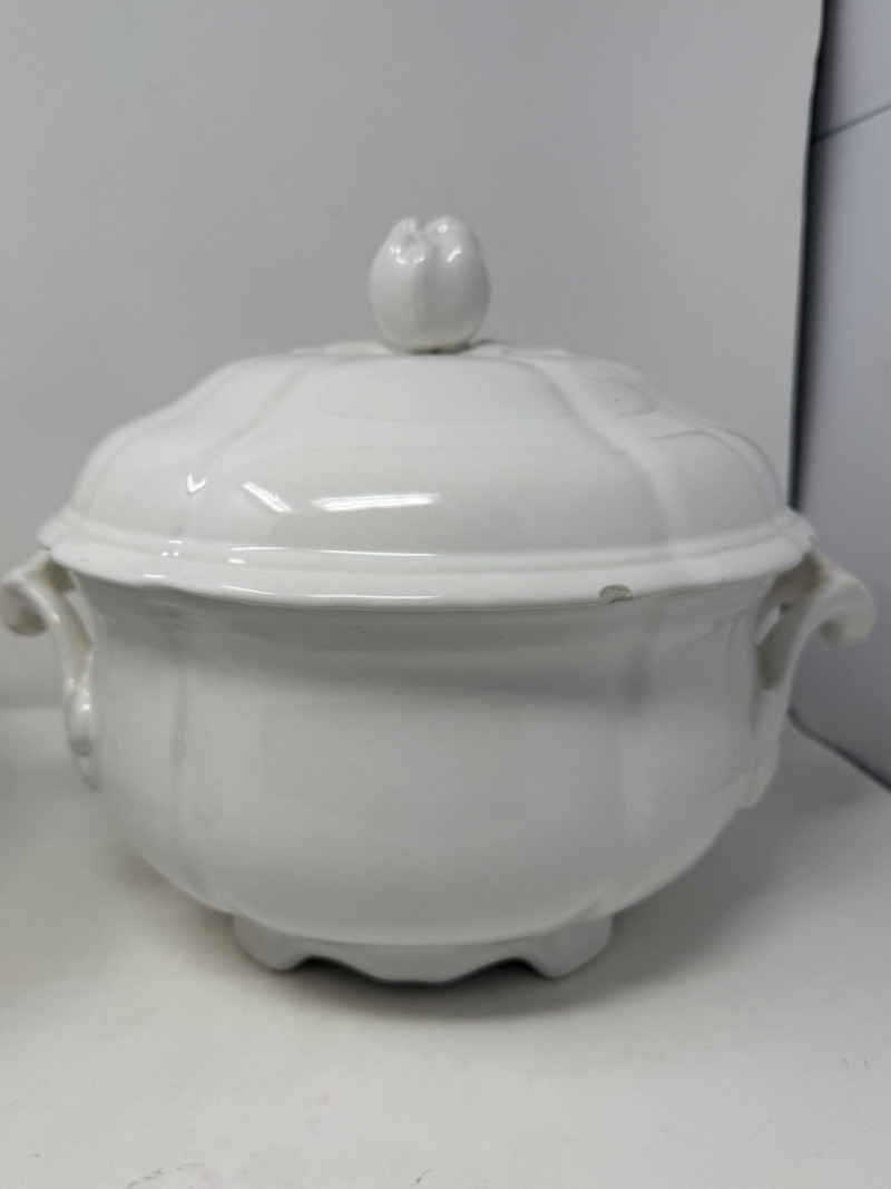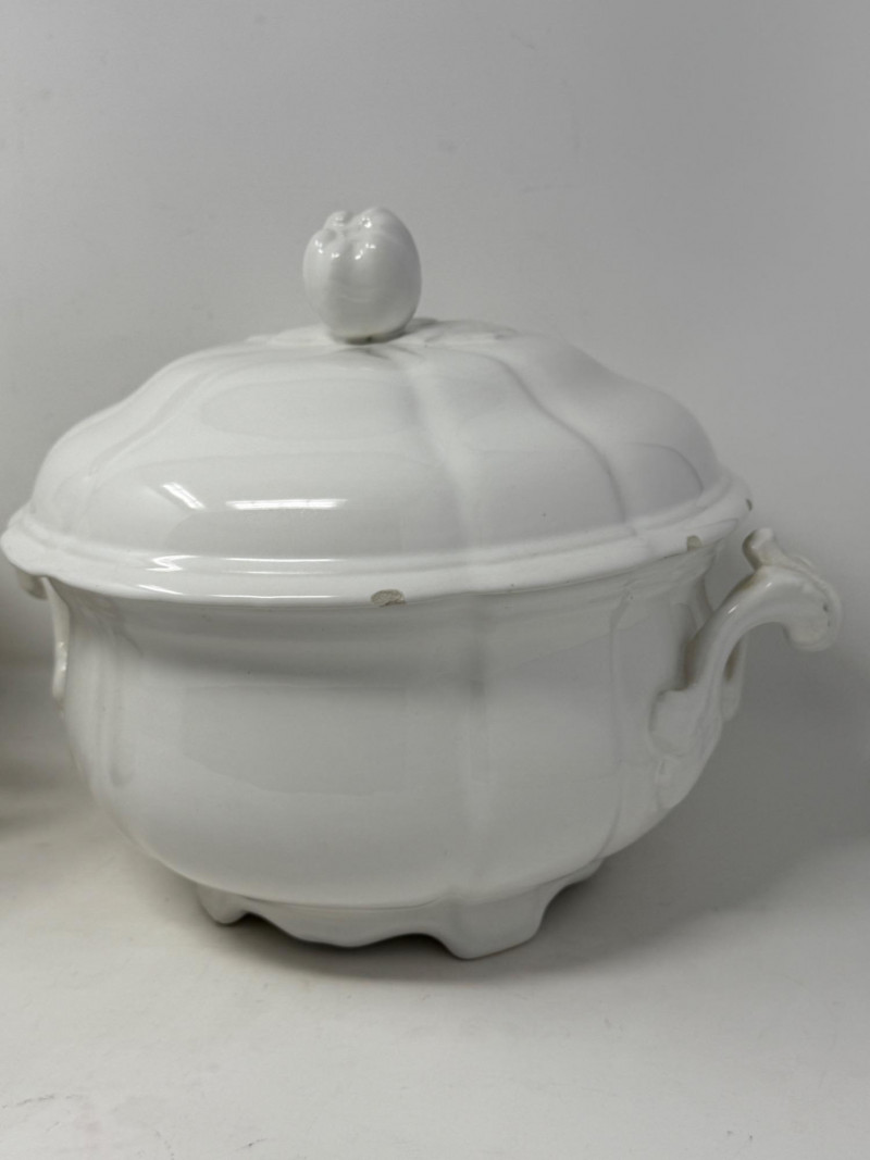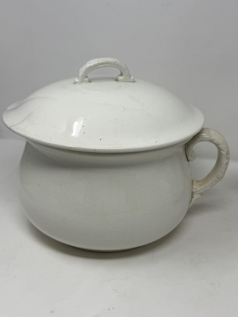 Earthenware tureen from the K&G (Keller & Guérin) Lunéville Badonviller pottery factory in France Antique Royal Ironstone China chamber pot with a lid, manufactured by Alfred Meakin in England around the late 19th or early 20th century.