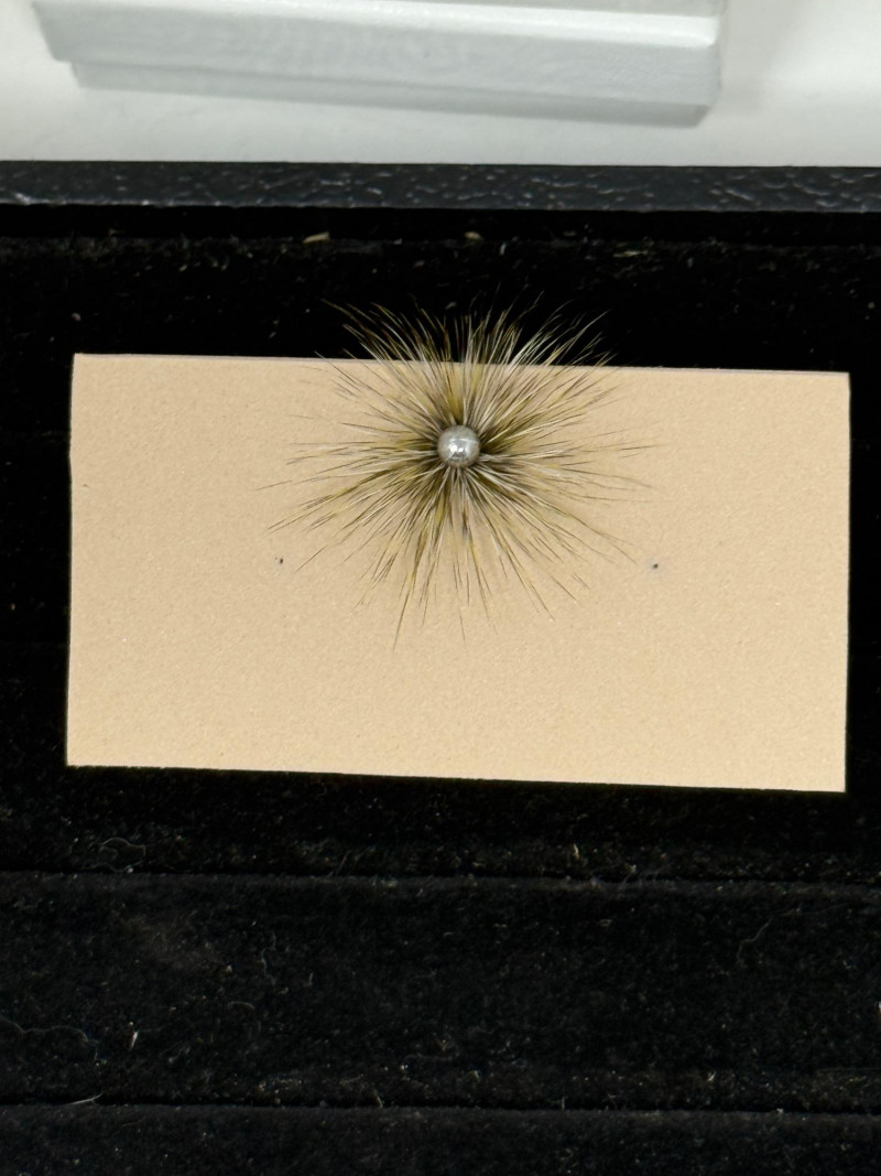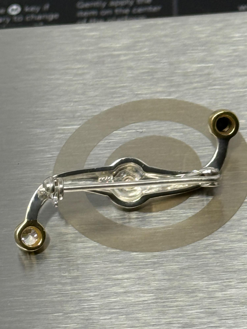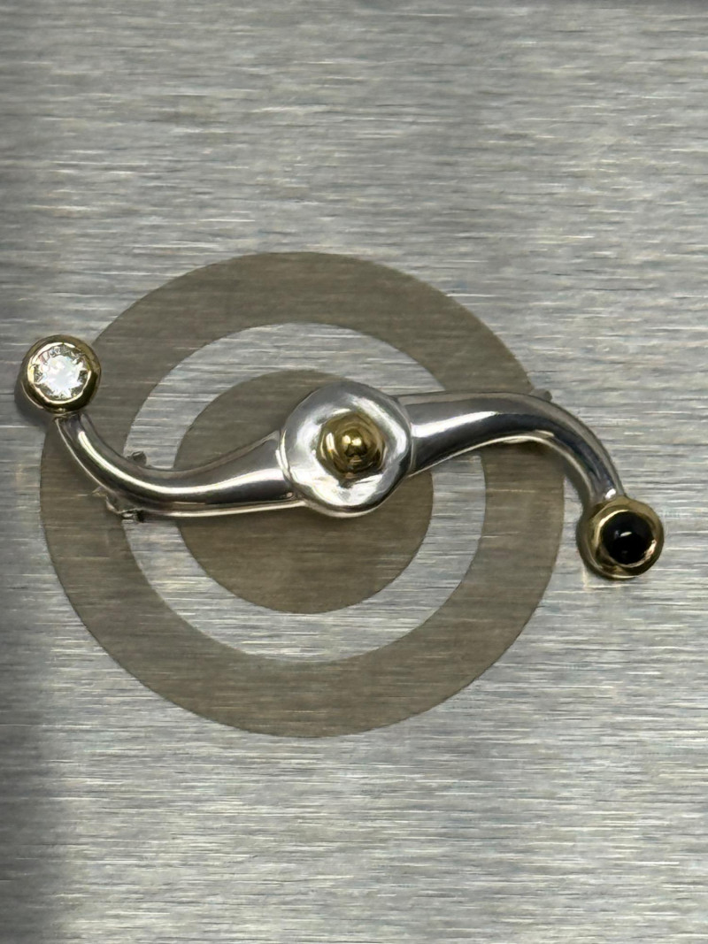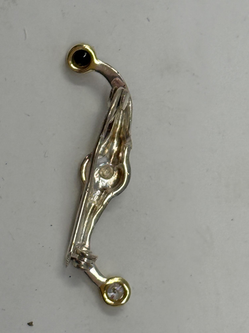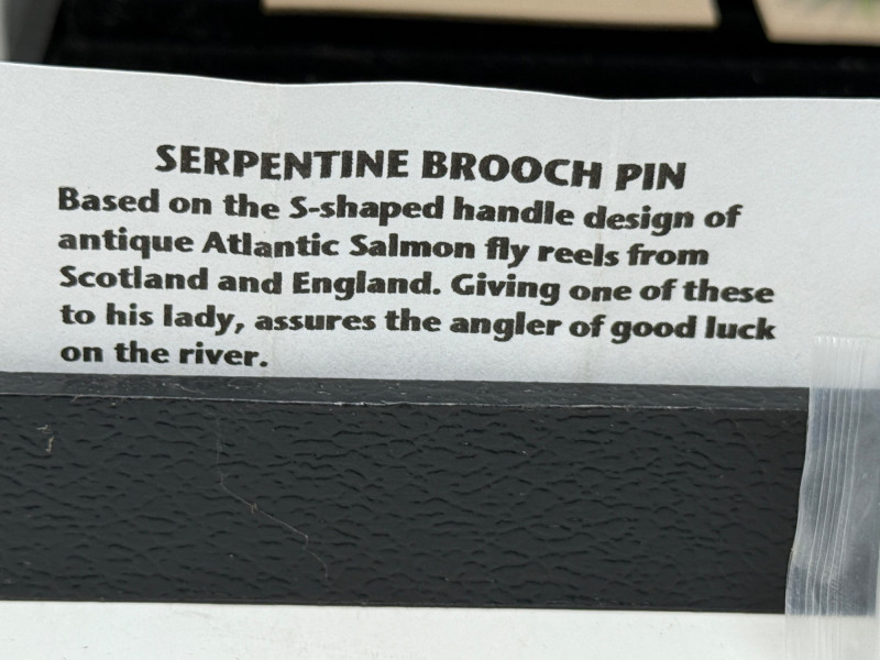 "Serpentine brooch pin. Based on the S shaped handle design of antique Atlantic salmon fly reels from Scotland and England. Giving one of these to his lady assures the angler of good luck on the river."