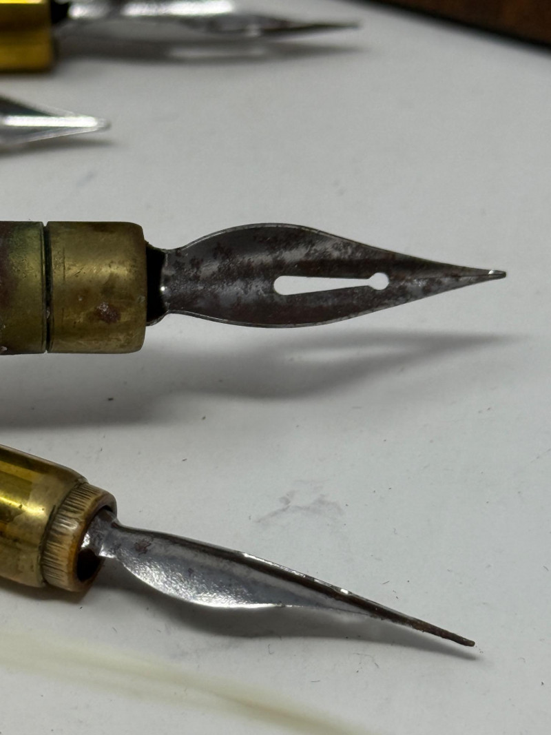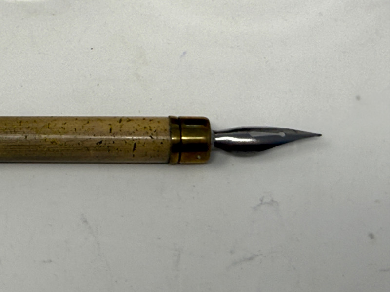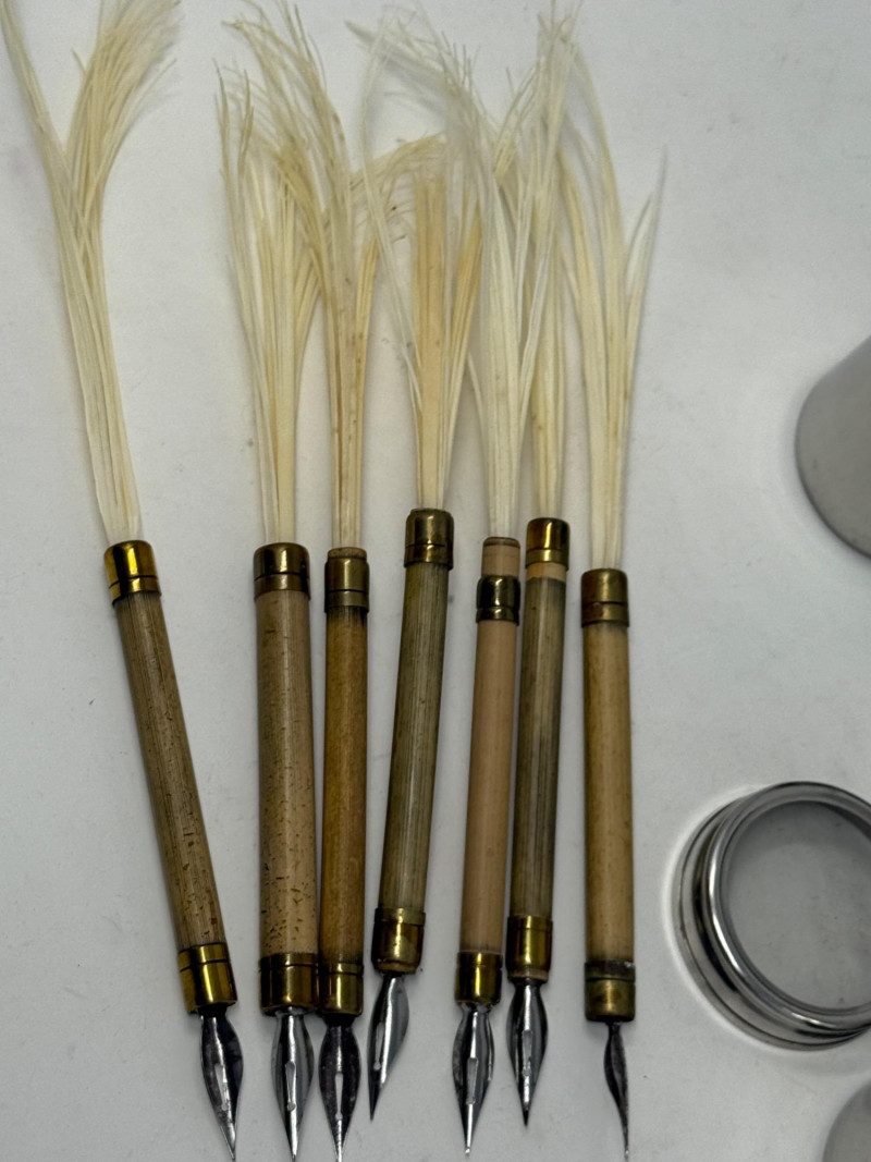 (7) Handcrafted Calligraphy Pens & Stainless Ink Containers Handmade by Roberts Pens are bamboo, brass and stiff grass quill approximately 10” long.