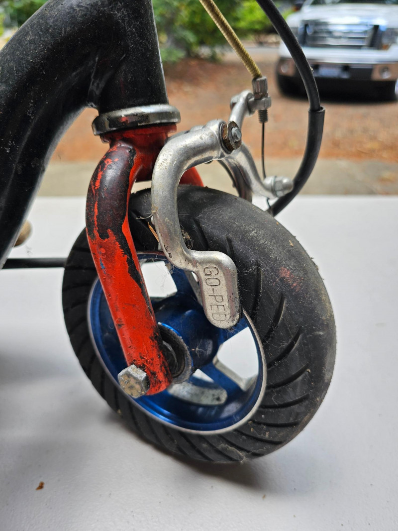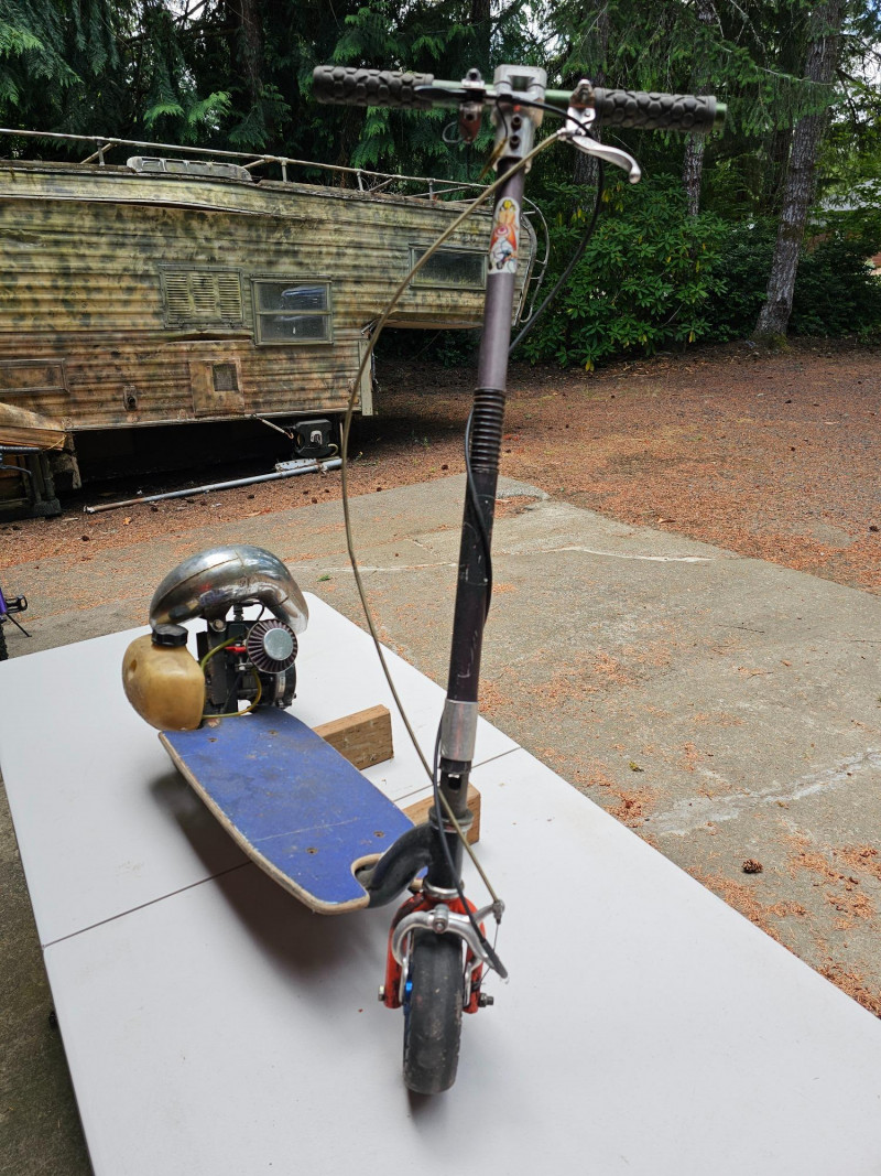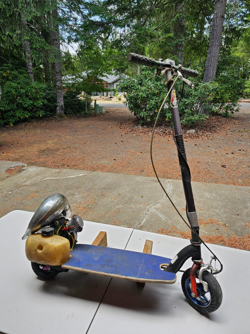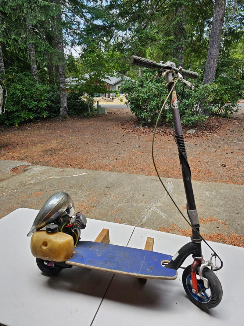 GO-PED Motorized Folding Scooter Gas/Oil Mix-powered GO-PED Motorized Scooter Motor has a knurled shaft that contacts the top of the back tire and drives it Research says the scooter may have a top speed of 21 mph Fold for easy transport & storage (folding mechanism doesn't seem to lock in place) Solid rubber tires front & back Unknown completeness, although it appears to be missing a pull start and a cover on left-side 41"T x 36"L x 12"W Untested (but looks like a fun little project)!