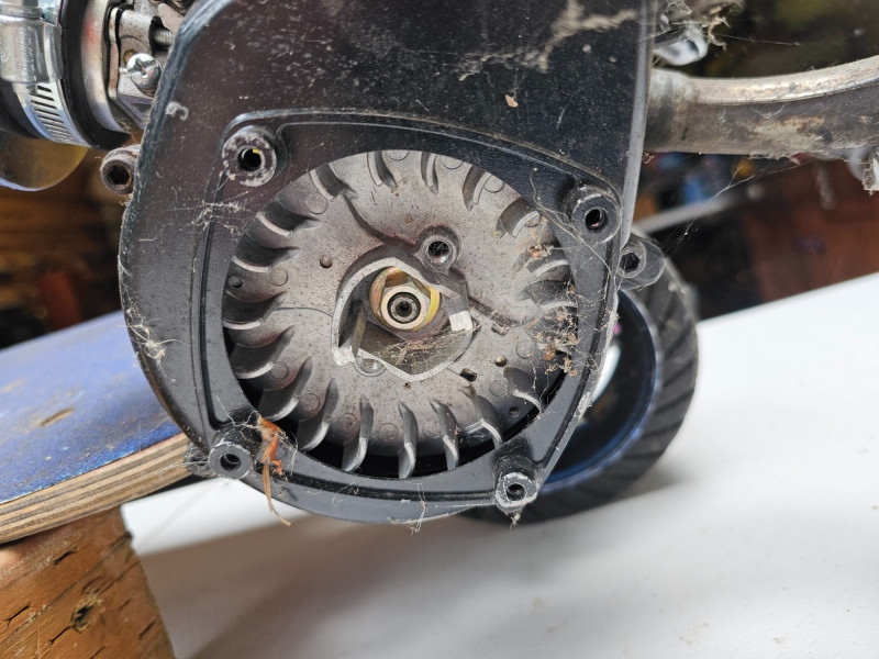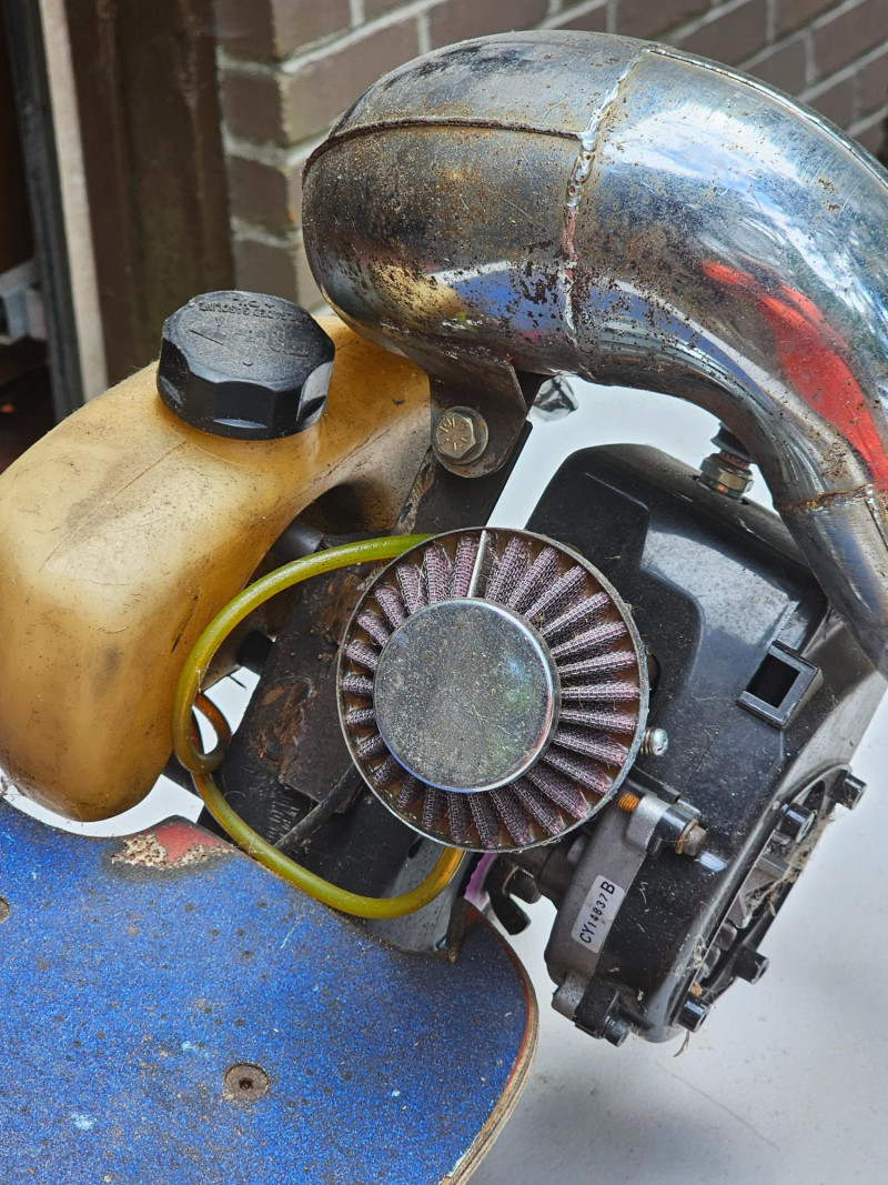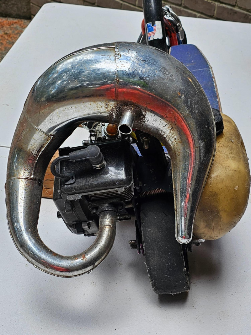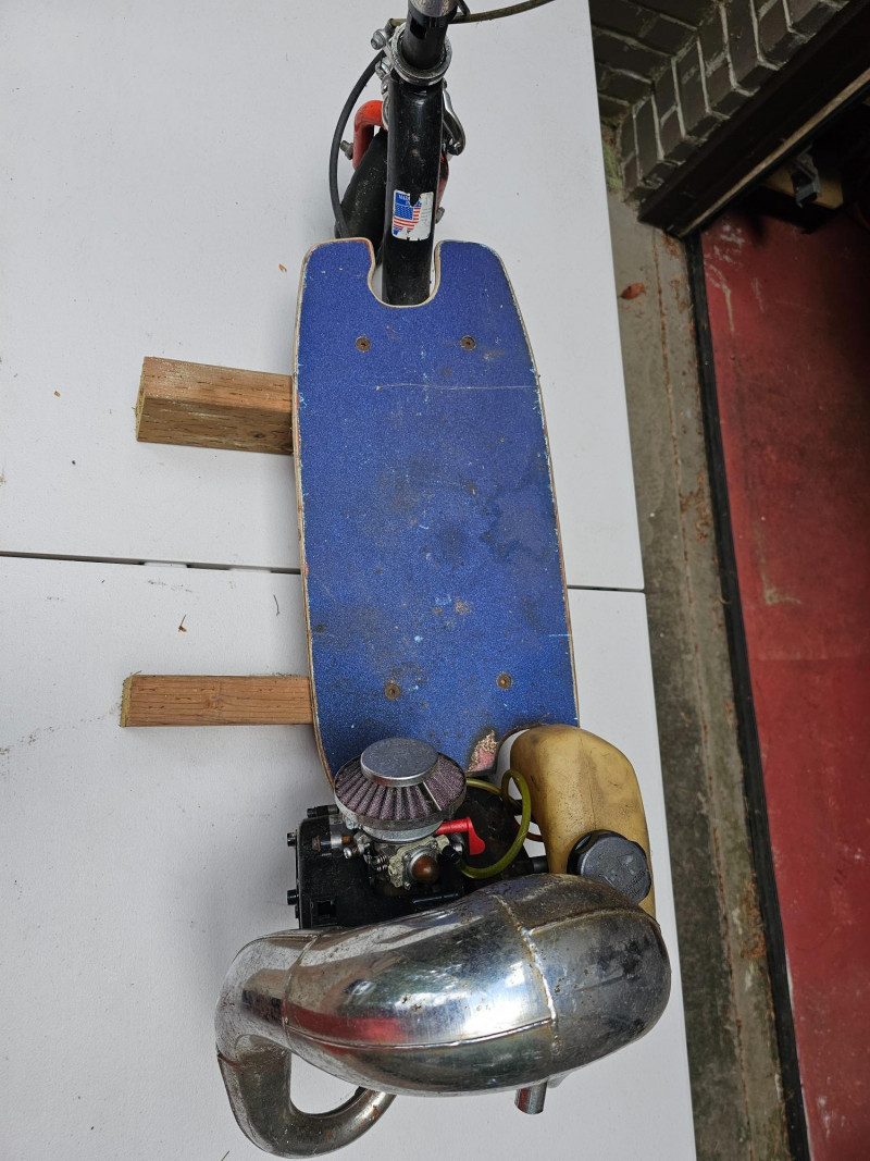 GO-PED Motorized Folding Scooter Gas/Oil Mix-powered GO-PED Motorized Scooter Motor has a knurled shaft that contacts the top of the back tire and drives it Research says the scooter may have a top speed of 21 mph Fold for easy transport & storage (folding mechanism doesn't seem to lock in place) Solid rubber tires front & back Unknown completeness, although it appears to be missing a pull start and a cover on left-side 41"T x 36"L x 12"W Untested (but looks like a fun little project)!