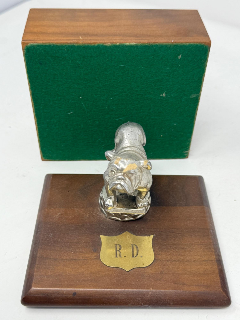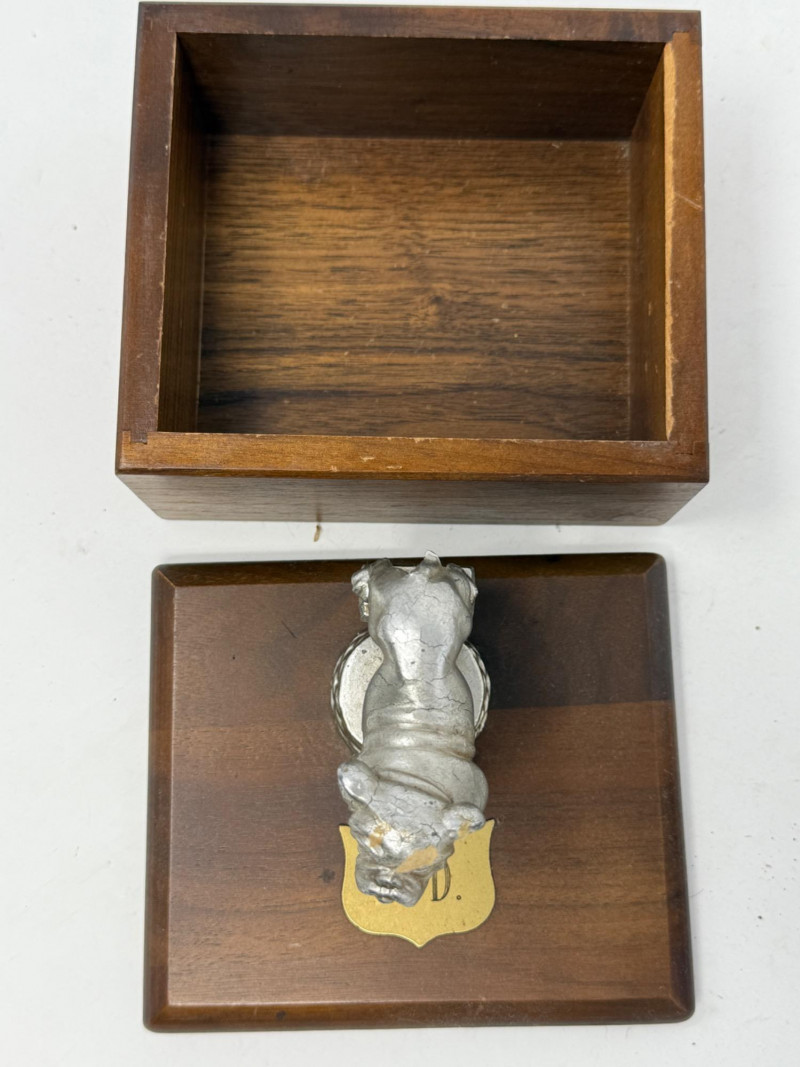 Bulldog Box and Dresser Change Tray. 5.25x4.5x4.5” wood box with trophy style statue 8x4” metal change tray